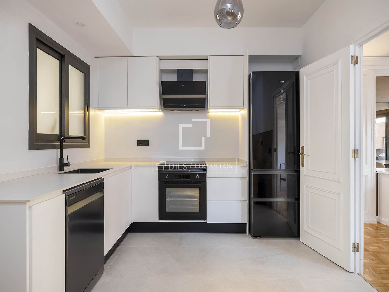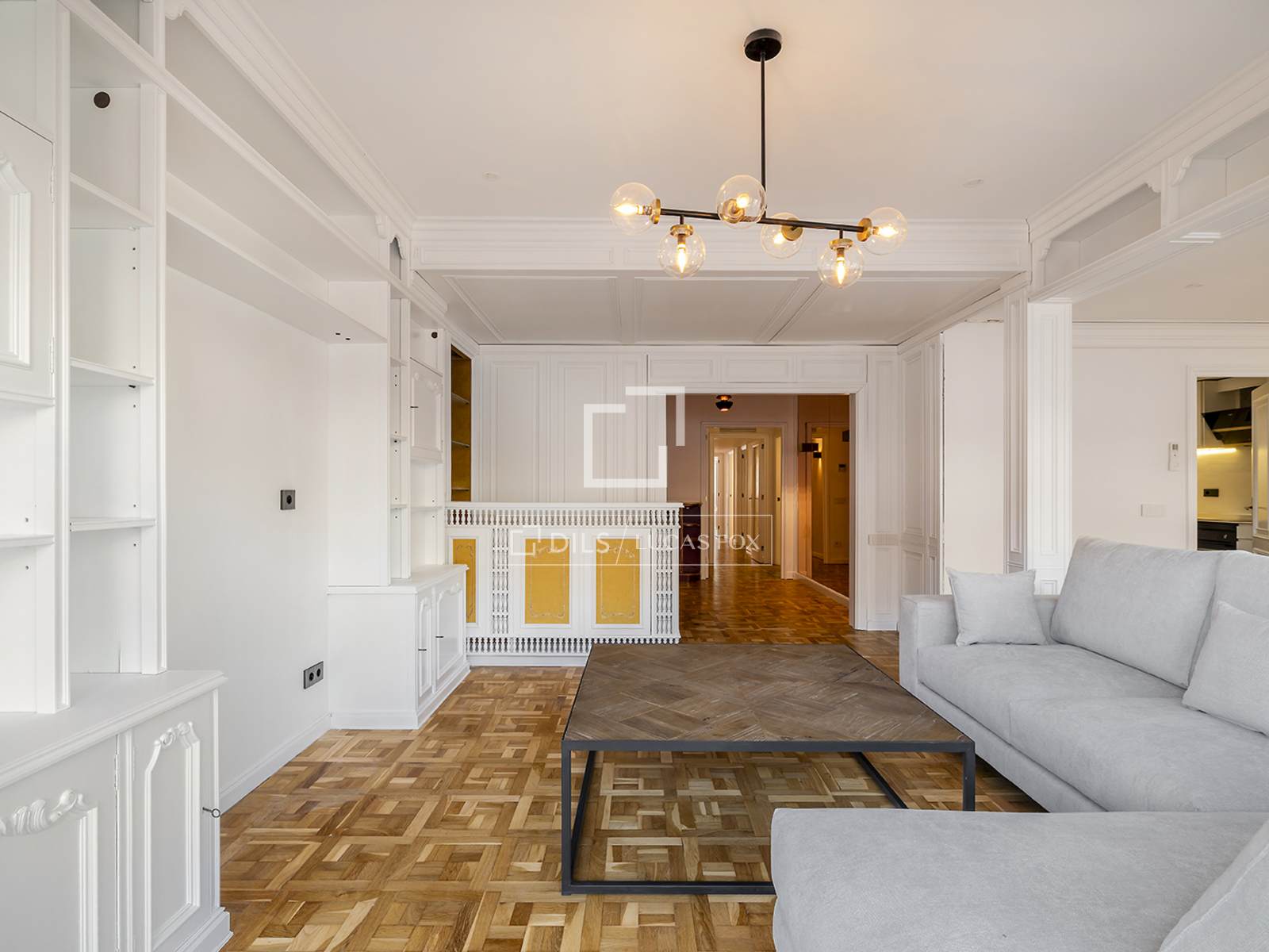 Al acceder, un elegante hall distribuidor da paso a un amplio salón-comedor de planta rectangular, con un diseño sofisticado y acabados de alta calidad. Este espacio resulta especialmente luminoso gracias a sus grandes ventanales correderos, que permiten la entrada de abundante luz natural y dan acceso directo a una agradable terraza de 12 m². El salón, además, cuenta con detalles decorativos clásicos como molduras y carpintería cuidada, combinados con una estética contemporánea, así como aire acondicionado por splits.