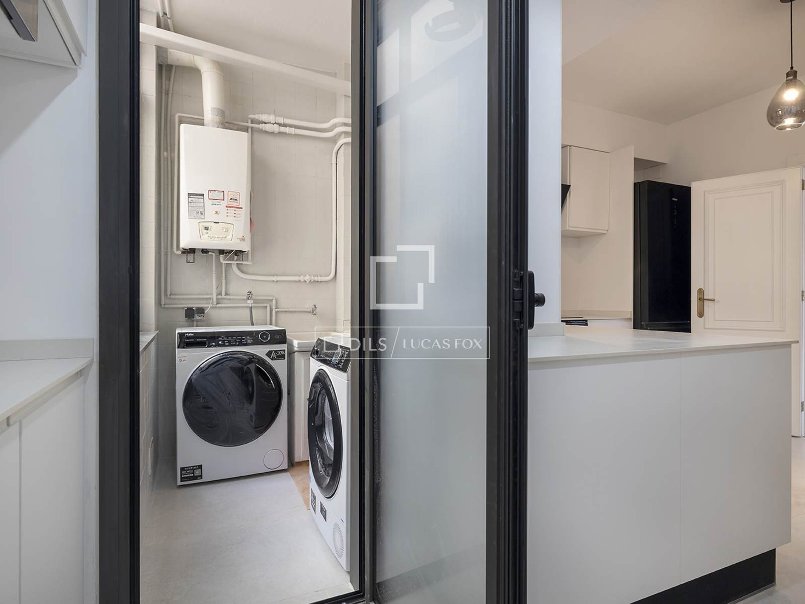 La cocina, independiente y de estilo moderno, se presenta completamente equipada con electrodomésticos integrados y mobiliario de líneas limpias. Dispone de zona office para comer a diario y una práctica zona de aguas independiente con lavadora y secadora.