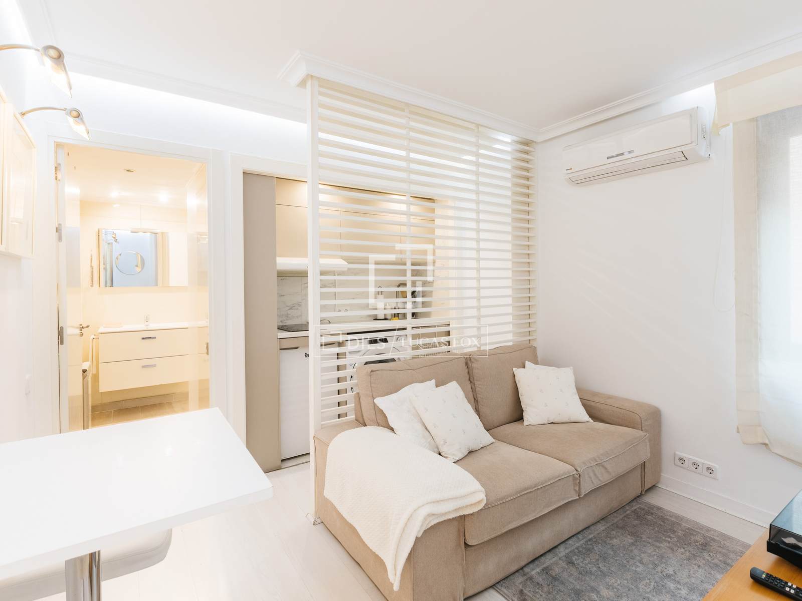 Dispone de amplia ducha con hidromasaje, cama de matrimonio con espacio de almacenamiento, salón con sofá nuevo, cocina americana recién reformada, aire acondicionado, calefacción central y wifi de alta velocidad, ideal para trabajar desde casa. Además, cuenta con puerta blindada y portero 24 horas.