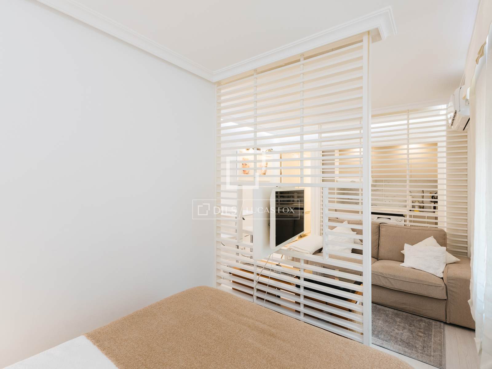 El dormitorio está separado del salón por un separador de ambientes mediante celosía decorativa de lamas horizontales en color crudo, que aporta luminosidad y mantiene la conexión visual entre espacios.