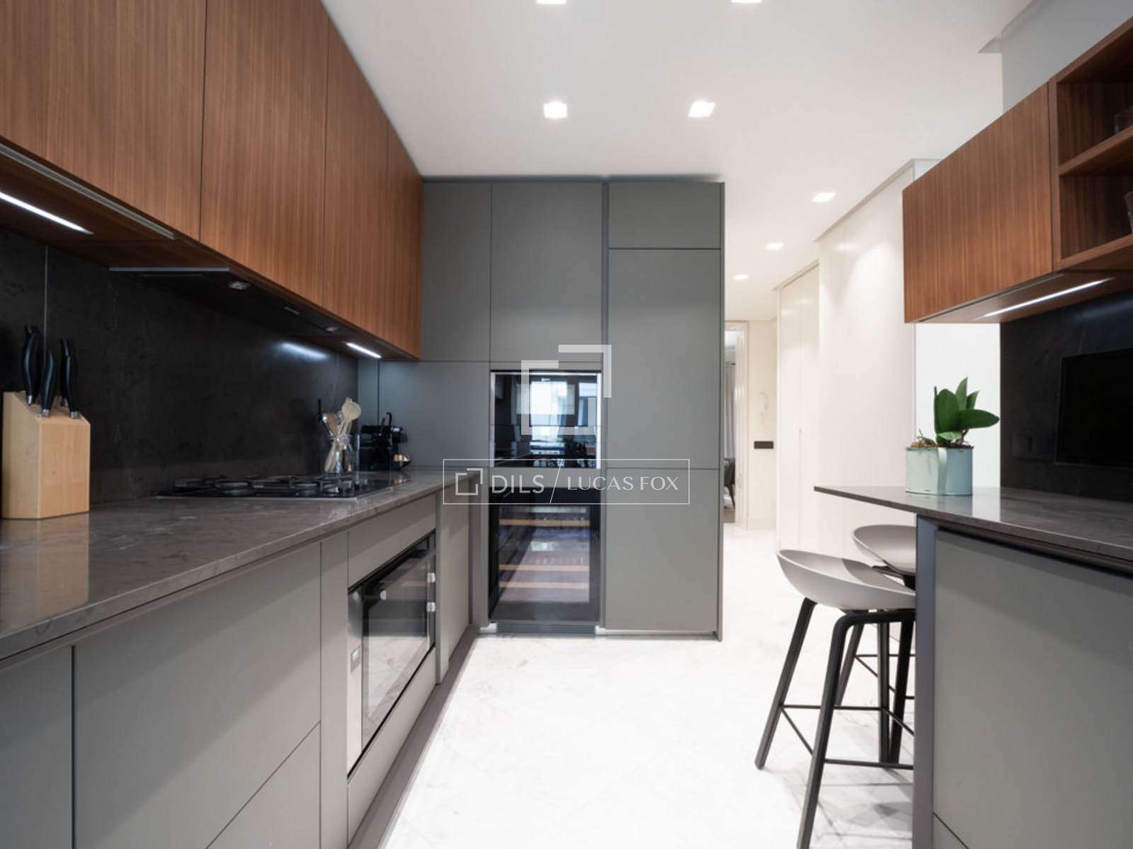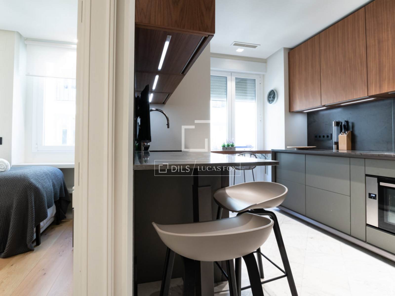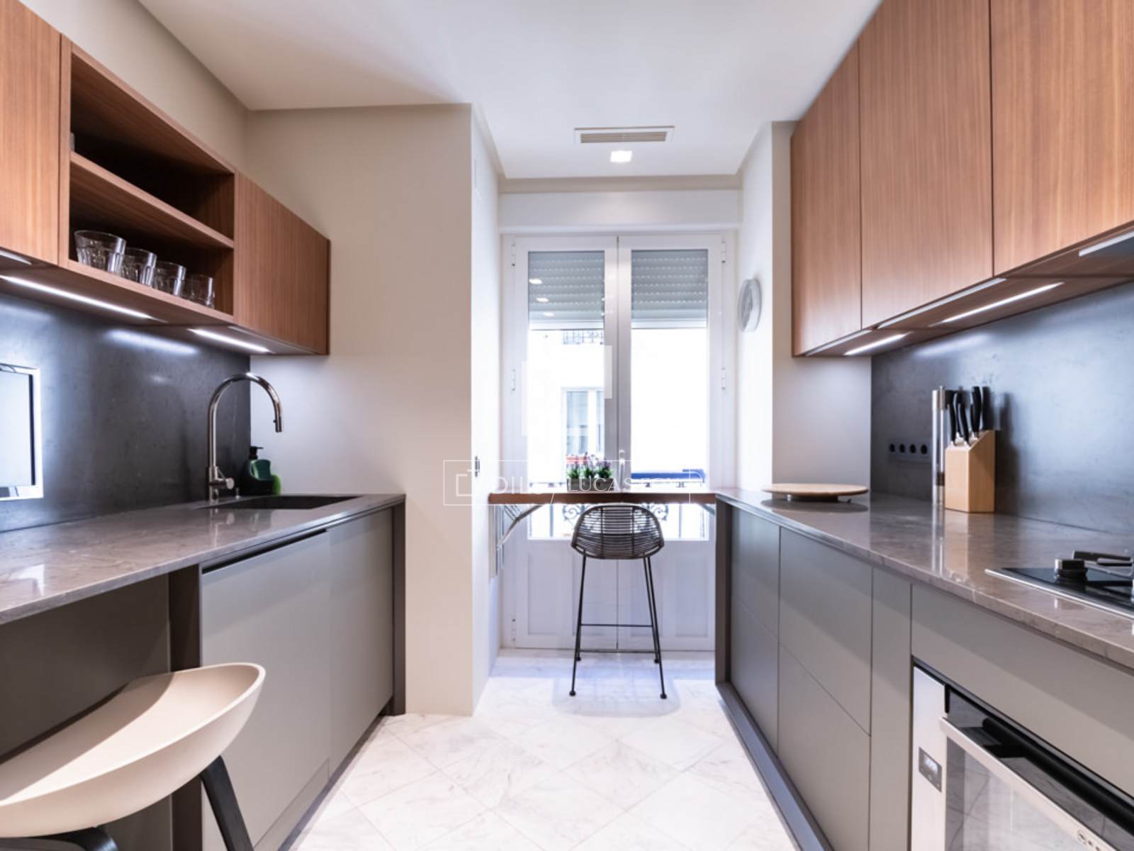 Al entrar a mano derecha se abre el salón/comedor con una gran sofá en cuero blanco, mesillas de centro, una TV pantalla plana de formato grande y dos butacas de diseño, una con su ottoman. El comedor tiene una mesa de madera para 8 personas, un aparador moderno que esconde una nevera de vinos y espejos que reflejan la luz y dan sensación de mucha amplitud. A la izquierda de la entrada se accede a la cocina y dormitorios. Esta área cuenta con armarios que esconden la lavadora, secadora y utensilios de limpieza. A la izquierda se encuentra el segundo dormitorio y un pasillo a la derecha nos lleva al segundo baño y al fondo, al dormitorio principal con su baño en suite. La cocina, en colores gris y marrón, cuenta con un elegante tope en mármol oscuro y muebles modernos empotrados. Está completamente equipada con electrodomésticos de última generación, menaje y utensilios necesarios. El dormitorio principal cuenta con una cama grande (1.80×2.00m) cabeceros de tela, mesillas de noche y amplios armarios empotrados que esconden una TV plana grande. Tiene un ventanal que le da mucha luz. El cuarto de baño tiene cabina acristalada con losa de mármol, dos lavamanos, y la zona del WC separada e independiente con una puerta. El segundo dormitorio cuenta con dos camas individuales en nido, con mesilla de noche y armarios empotrados. Ambos dormitorios dan a un patio trasero amplio y tranquilo. Todo el piso cuenta con doble vidrio en las ventanas para aislar completamente el ruido de la ciudad, y suelo de madera a excepción de losa en los baños.