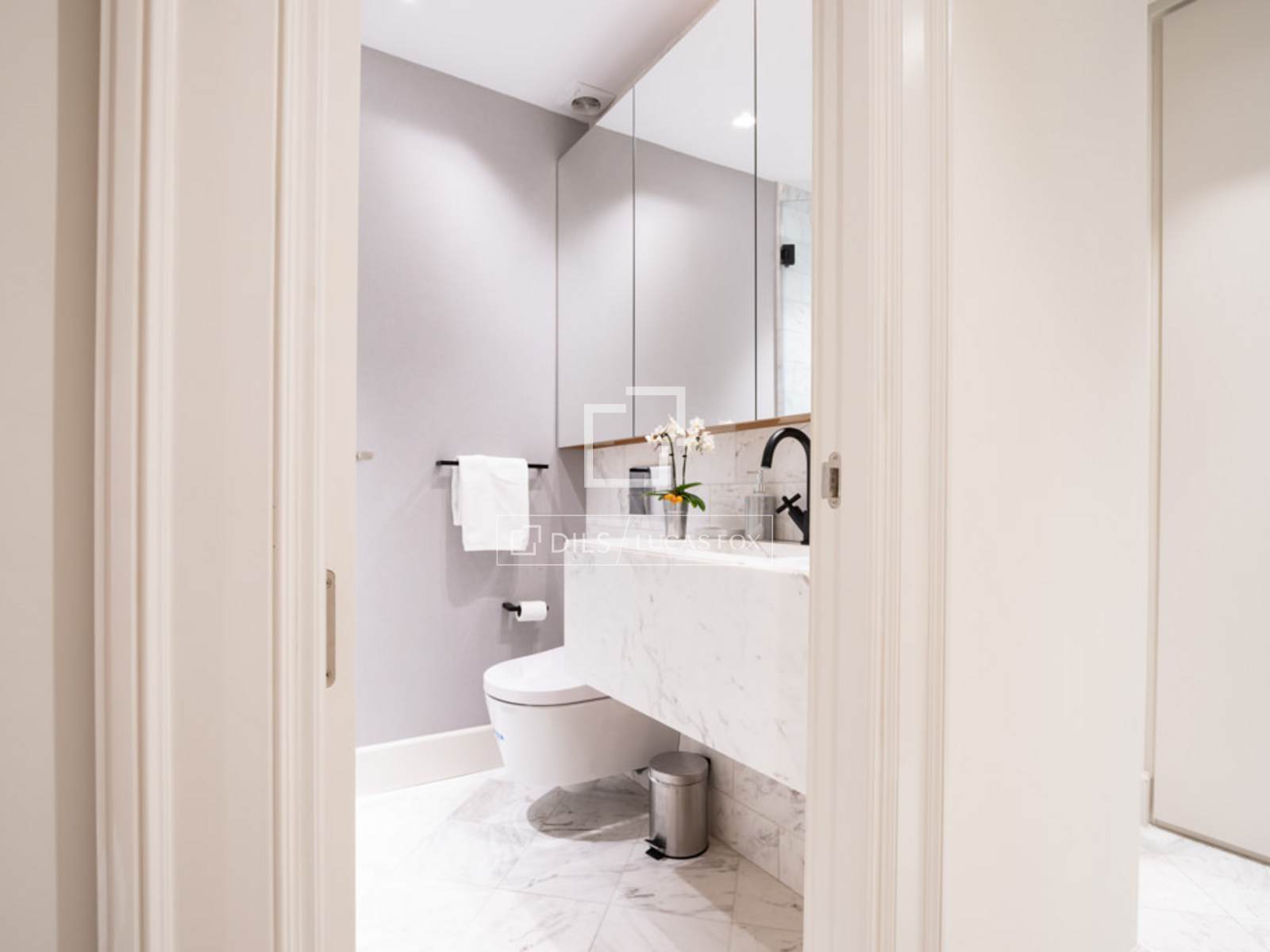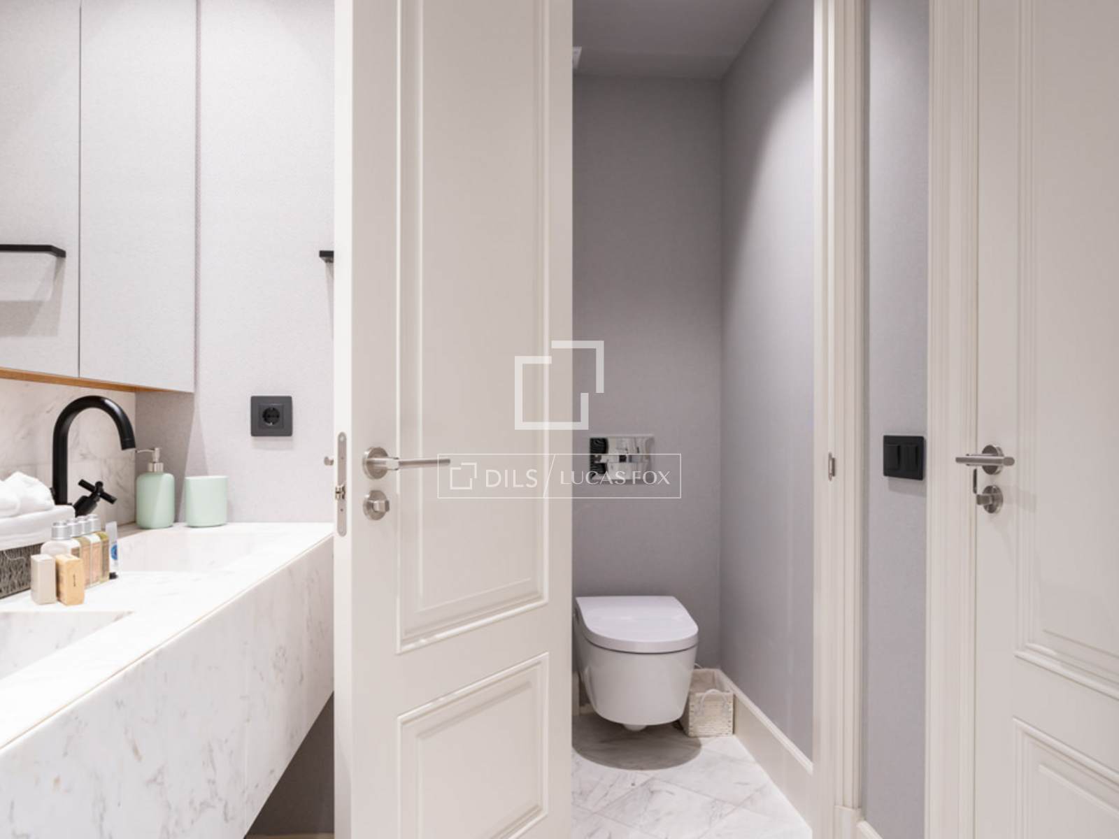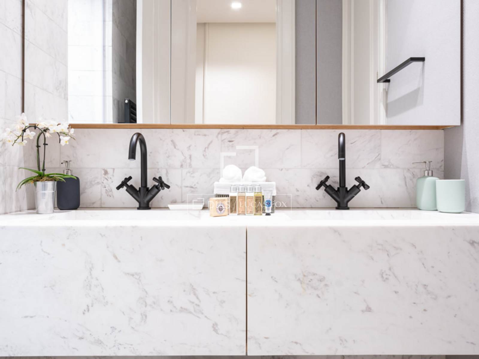 Al entrar a mano derecha se abre el salón/comedor con una gran sofá en cuero blanco, mesillas de centro, una TV pantalla plana de formato grande y dos butacas de diseño, una con su ottoman. El comedor tiene una mesa de madera para 8 personas, un aparador moderno que esconde una nevera de vinos y espejos que reflejan la luz y dan sensación de mucha amplitud. A la izquierda de la entrada se accede a la cocina y dormitorios. Esta área cuenta con armarios que esconden la lavadora, secadora y utensilios de limpieza. A la izquierda se encuentra el segundo dormitorio y un pasillo a la derecha nos lleva al segundo baño y al fondo, al dormitorio principal con su baño en suite. La cocina, en colores gris y marrón, cuenta con un elegante tope en mármol oscuro y muebles modernos empotrados. Está completamente equipada con electrodomésticos de última generación, menaje y utensilios necesarios. El dormitorio principal cuenta con una cama grande (1.80×2.00m) cabeceros de tela, mesillas de noche y amplios armarios empotrados que esconden una TV plana grande. Tiene un ventanal que le da mucha luz. El cuarto de baño tiene cabina acristalada con losa de mármol, dos lavamanos, y la zona del WC separada e independiente con una puerta. El segundo dormitorio cuenta con dos camas individuales en nido, con mesilla de noche y armarios empotrados. Ambos dormitorios dan a un patio trasero amplio y tranquilo. Todo el piso cuenta con doble vidrio en las ventanas para aislar completamente el ruido de la ciudad, y suelo de madera a excepción de losa en los baños.