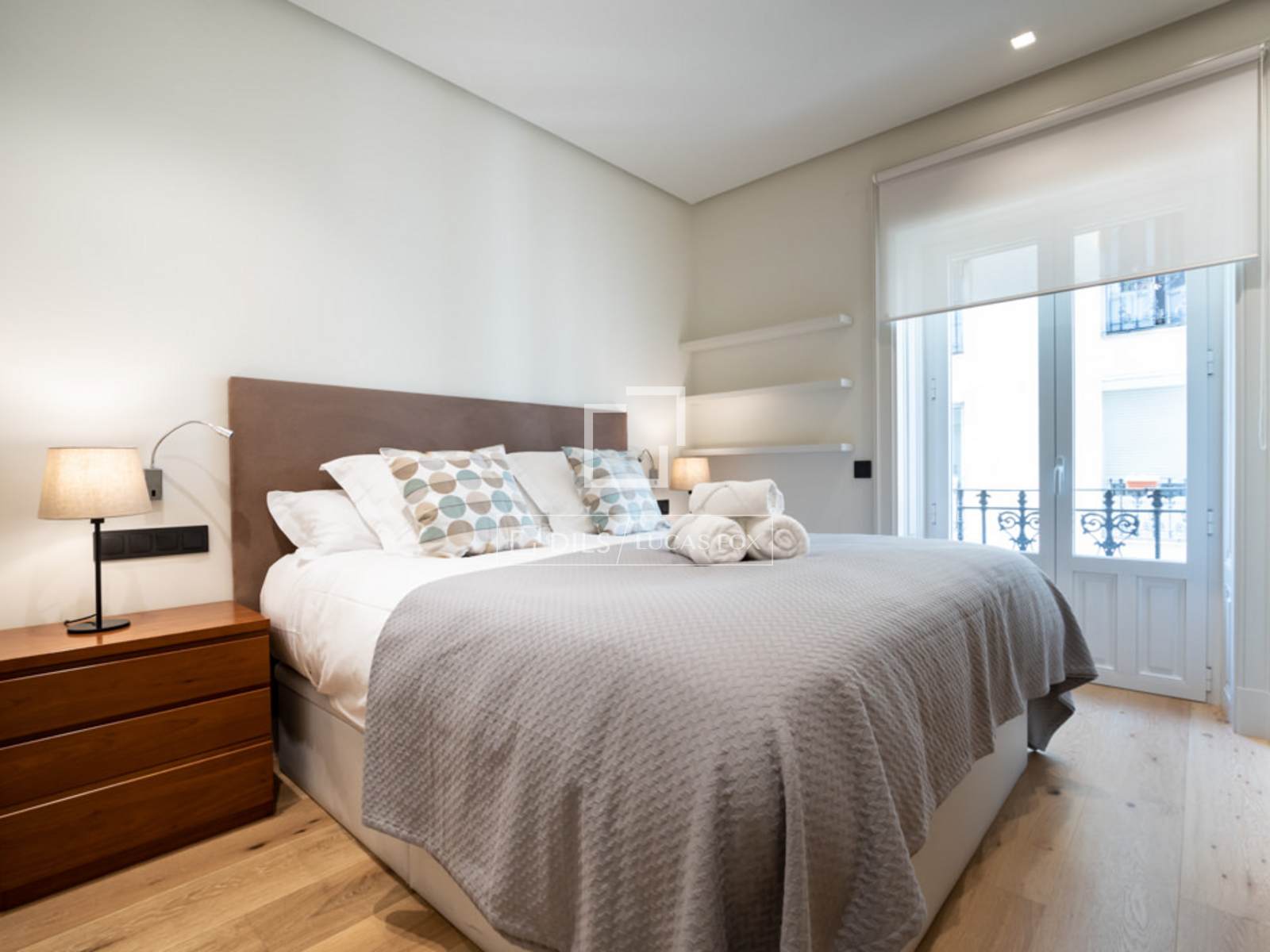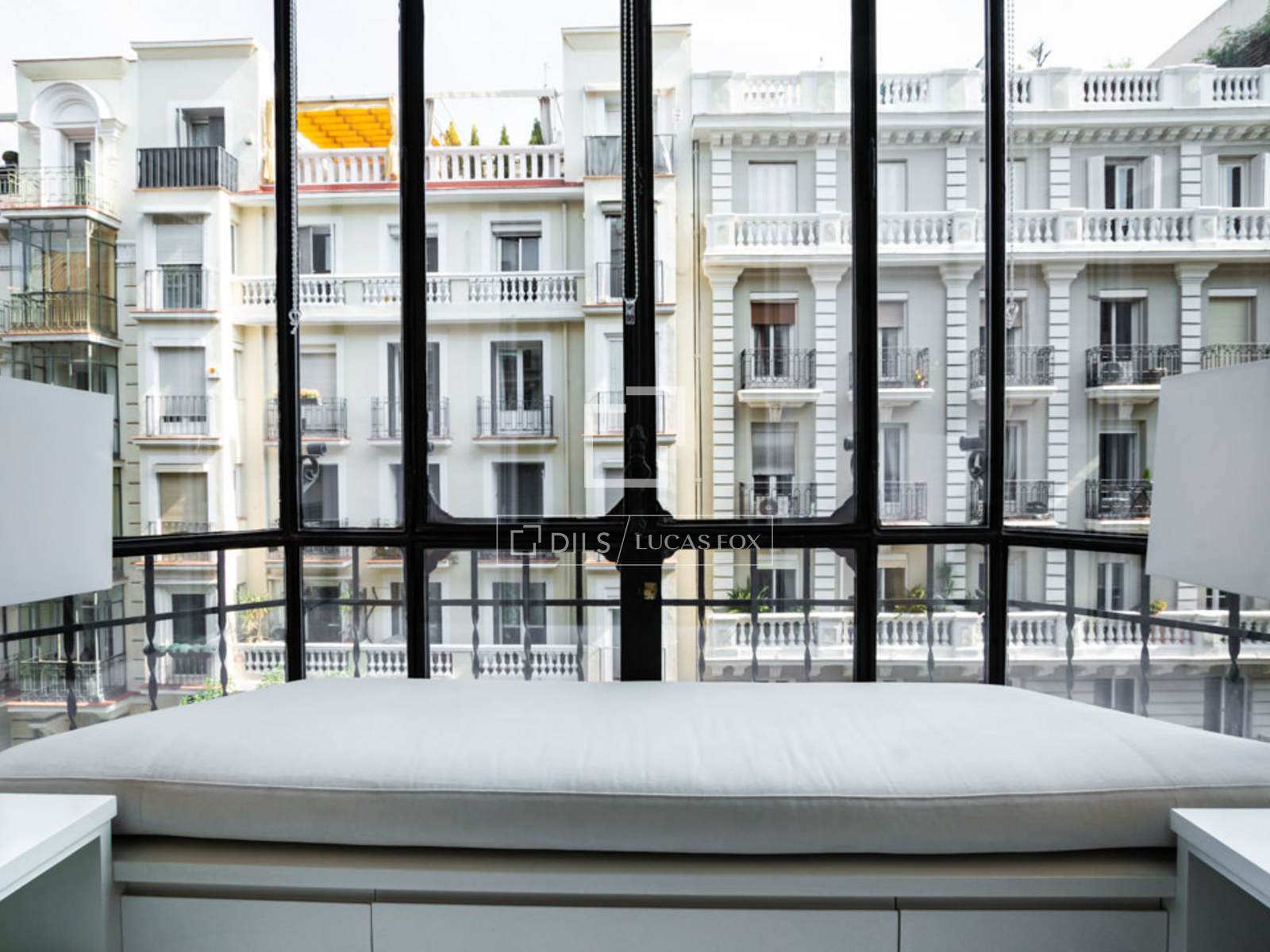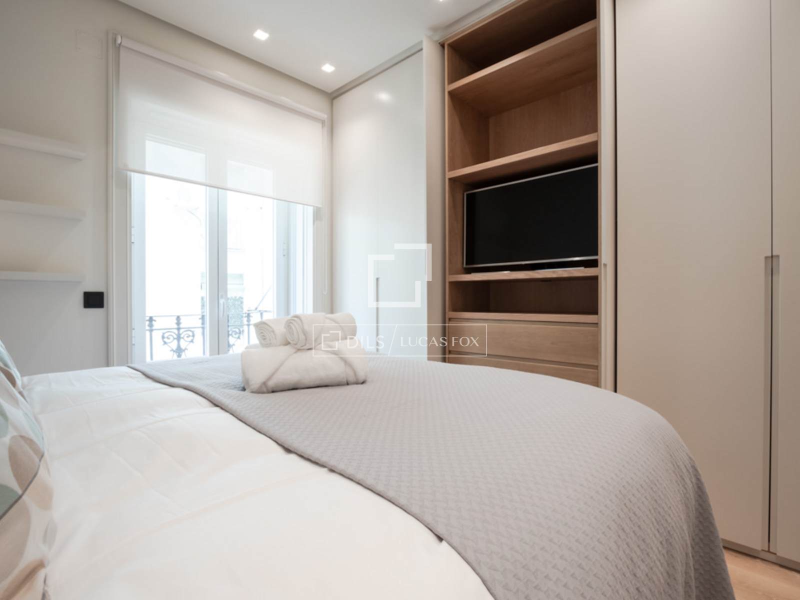 Situado en el elegante y exclusivo barrio de Salamanca, en el corazón de una de las zonas más cotizadas de Madrid, donde predominan elegantes edificios con fachadas señoriales, calles arboladas, y una selección de los mejores restaurantes, cafés y comercios de la ciudad. Es un piso totalmente reformado, ubicado en una 4ª planta exterior con un balcón muy acogedor a la calle. La decoración es de estilo contemporáneo moderna, minimalista, en donde destacan tonos suaves, combinando perfectamente comodidad y buen gusto. Su interior resalta por la gran cantidad de luz natural que entra por los ventanales del área social. Es un espacio idóneo para acoger hasta 4 personas. Al entrar a mano derecha se abre el salón/comedor con una gran sofá en cuero blanco, mesillas de centro, una TV pantalla plana de formato grande y dos butacas de diseño, una con su ottoman. El comedor tiene una mesa de madera para 8 personas, un aparador moderno que esconde una nevera de vinos y espejos que reflejan la luz y dan sensación de mucha amplitud. A la izquierda de la entrada se accede a la cocina y dormitorios. Esta área cuenta con armarios que esconden la lavadora, secadora y utensilios de limpieza. A la izquierda se encuentra el segundo dormitorio y un pasillo a la derecha nos lleva al segundo baño y al fondo, al dormitorio principal con su baño en suite. La cocina, en colores gris y marrón, cuenta con un elegante tope en mármol oscuro y muebles modernos empotrados. Está completamente equipada con electrodomésticos de última generación, menaje y utensilios necesarios. El dormitorio principal cuenta con una cama grande (1.80×2.00m) cabeceros de tela, mesillas de noche y amplios armarios empotrados que esconden una TV plana grande. Tiene un ventanal que le da mucha luz. El cuarto de baño tiene cabina acristalada con losa de mármol, dos lavamanos, y la zona del WC separada e independiente con una puerta. El segundo dormitorio cuenta con dos camas individuales en nido, con mesilla de noche y armarios empotrados. Ambos dormitorios dan a un patio trasero amplio y tranquilo. Todo el piso cuenta con doble vidrio en las ventanas para aislar completamente el ruido de la ciudad, y suelo de madera a excepción de losa en los baños.