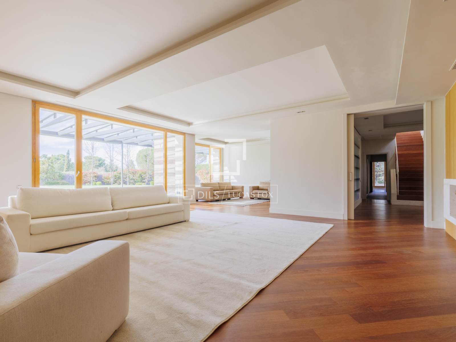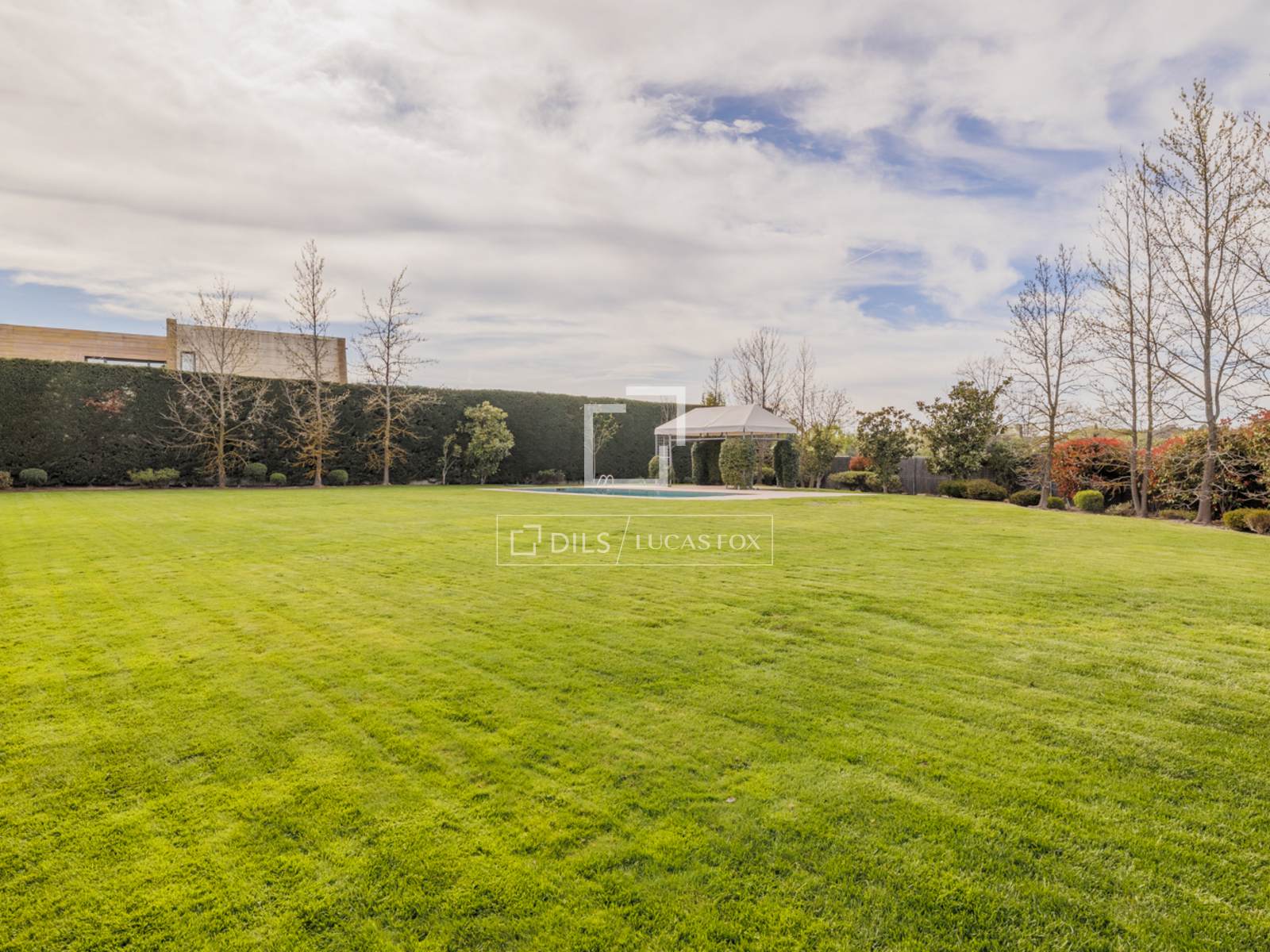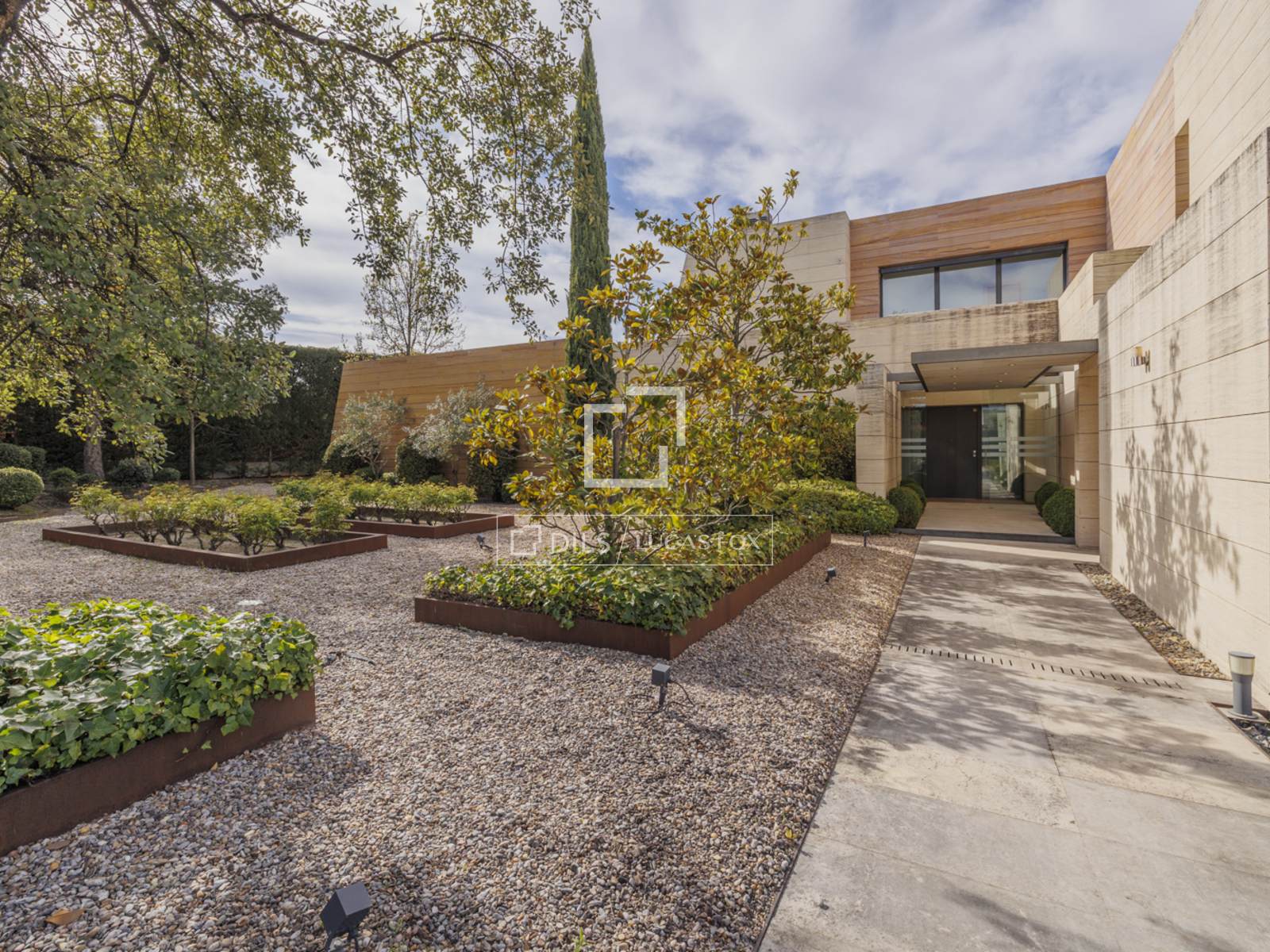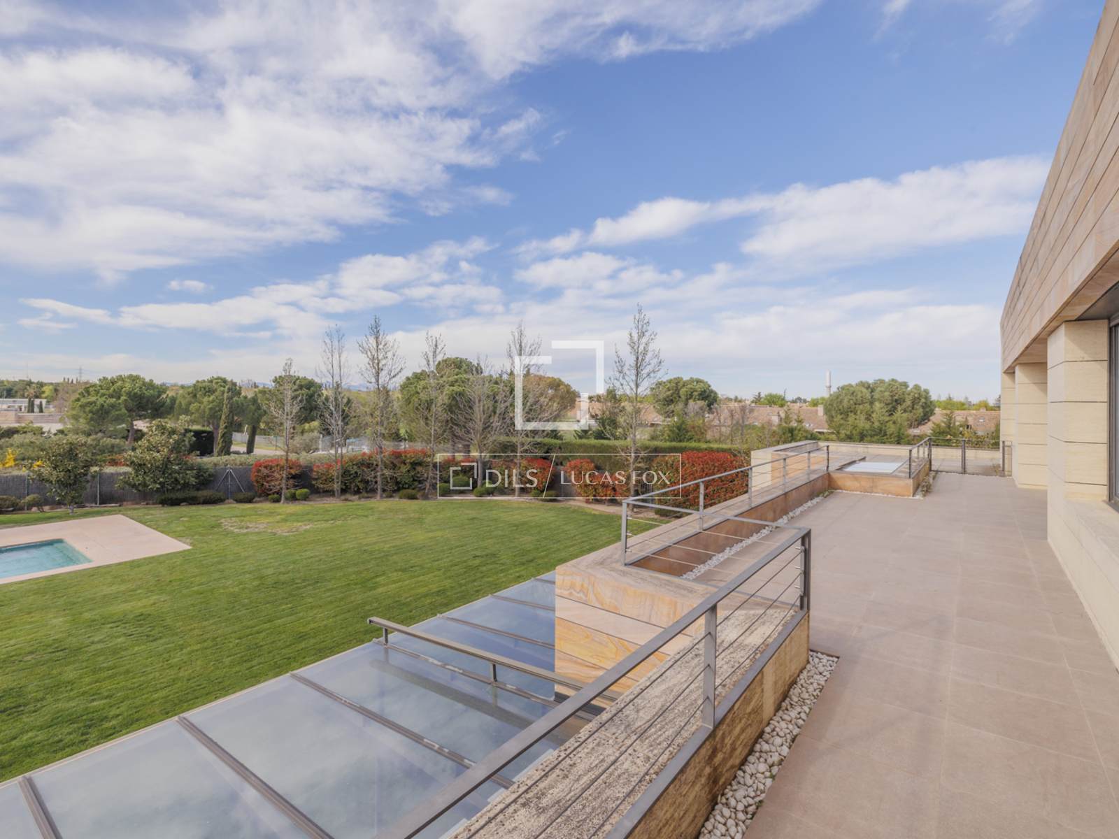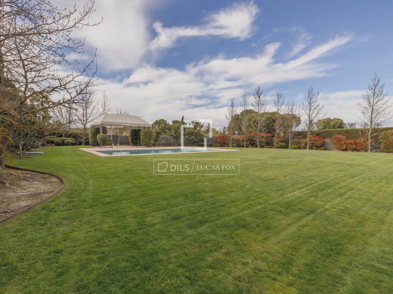 Exclusiva villa en alquiler en La Finca, reformada y ampliada, con 8 dormitorios, amplias zonas de día con salida al jardín, piscina privada, zona de servicio independiente y garaje para 6 coches, en una de las urbanizaciones más prestigiosas de Madrid.