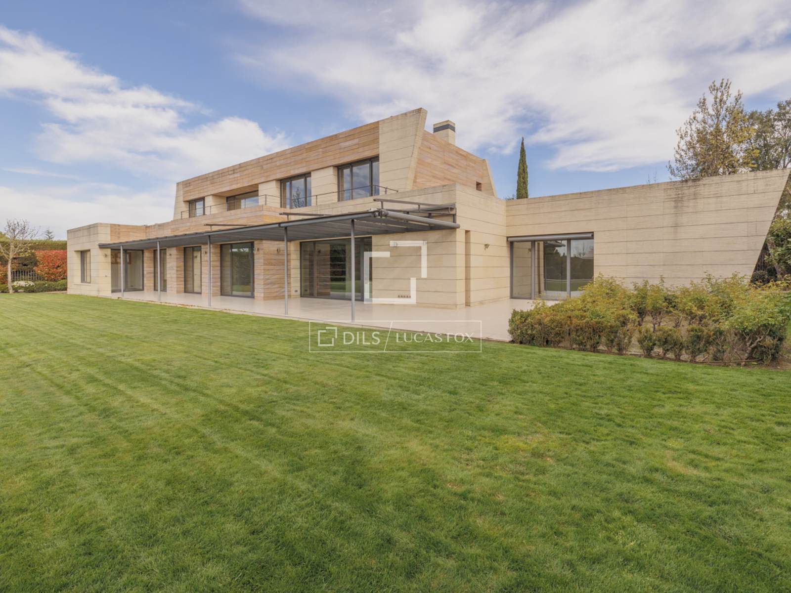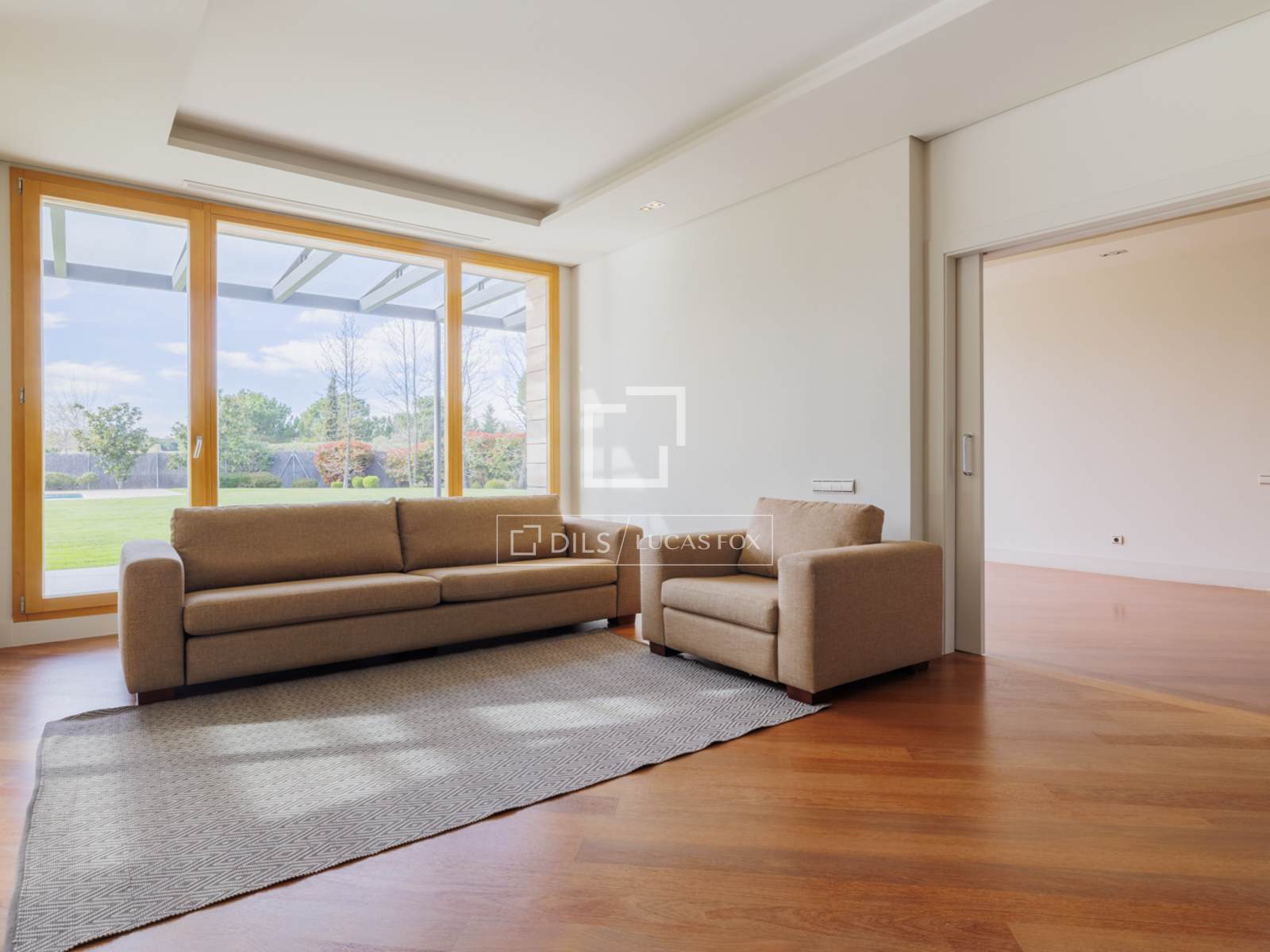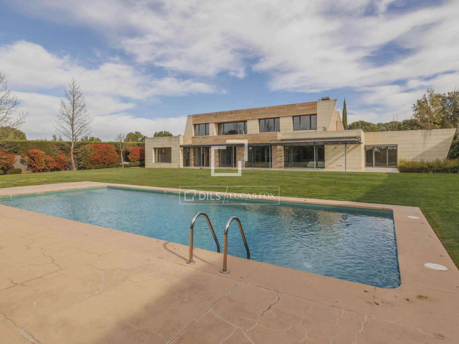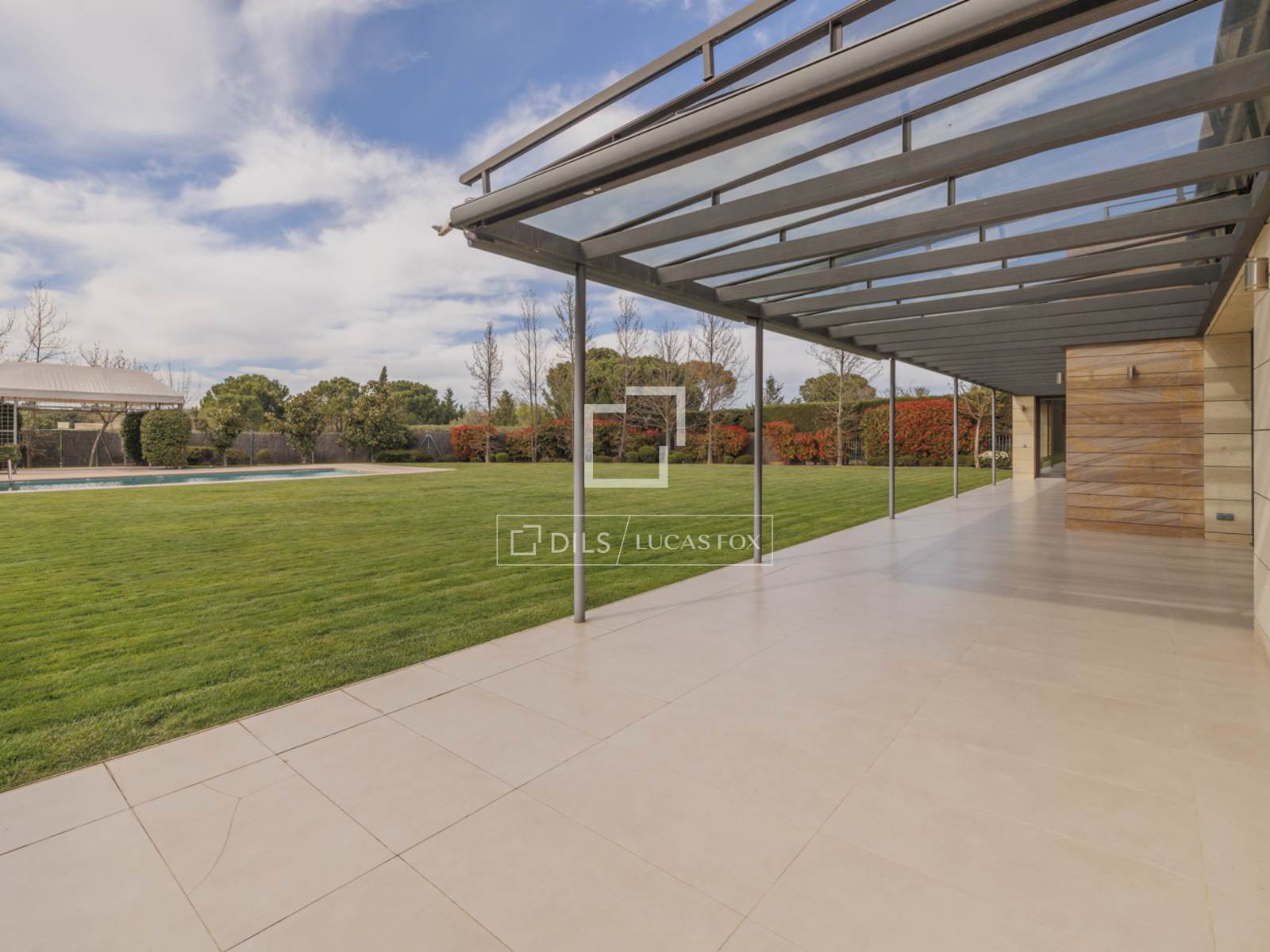 Exclusiva villa en alquiler en La Finca, reformada y ampliada, con 8 dormitorios, amplias zonas de día con salida al jardín, piscina privada, zona de servicio independiente y garaje para 6 coches, en una de las urbanizaciones más prestigiosas de Madrid.