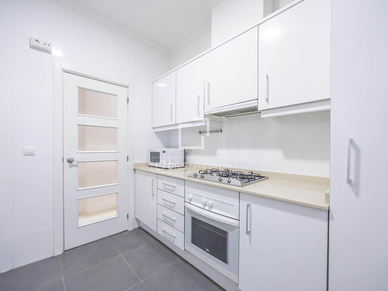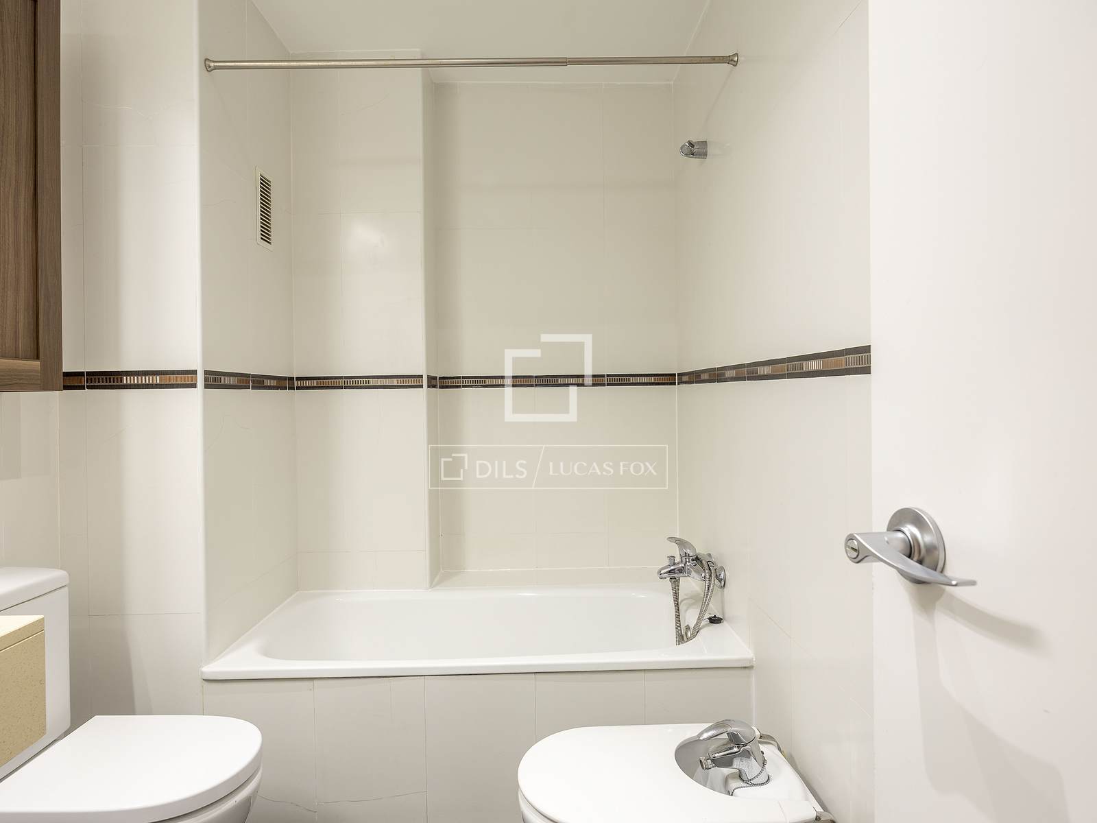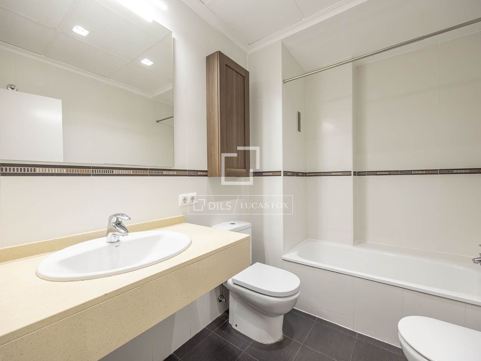 Aquí, el pasillo gira a la izquierda, donde se presentan un baño completo con bañera y una cocina con ventana al patio de la finca. Esta estancia, de planta cuadrada, está equipada con un lavavajillas nuevo, lavadora, frigorífico, horno, placa y campana.