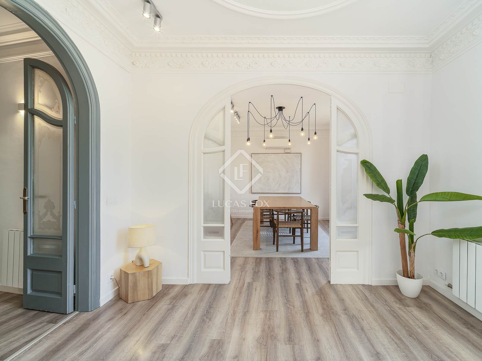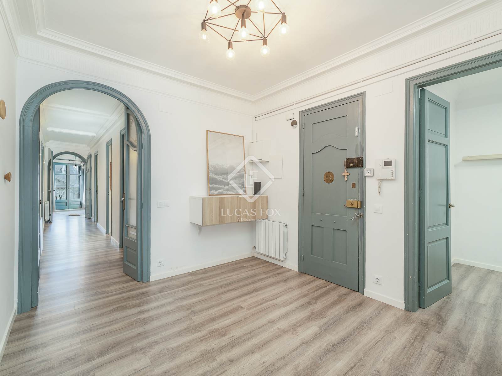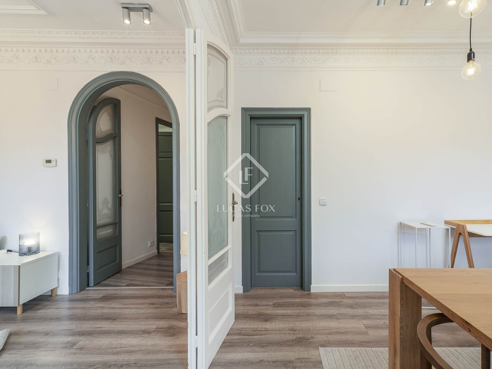El piso se presenta con una reforma de alta calidad en la que se han combinado sus elementos originales, recuperados y conservados con sumo cuidado, con un diseño de interior moderno. Así pues, se ha creado un maravilloso piso de estancias amplias y luminosas de techos altos que disfruta de un estilo actual y sofisticado sin renunciar al estilo regio del edificio.