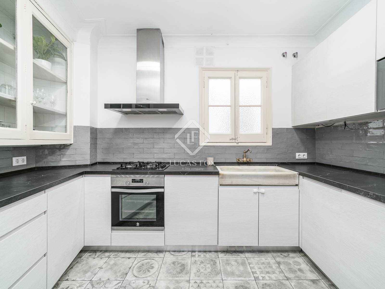 La zona de día consta de un gran salón comedor, una estancia acogedora y elegante con salida a dos bonitos balcones que ofrecen unas agradables vistas al barrio y a sus edificios de época. A continuación, encontramos la cocina, práctica, con suelos porcelánicos y totalmente equipada con lavavajillas, lavadora, y horno y microondas con acabado en acero inoxidable y vitrificado.