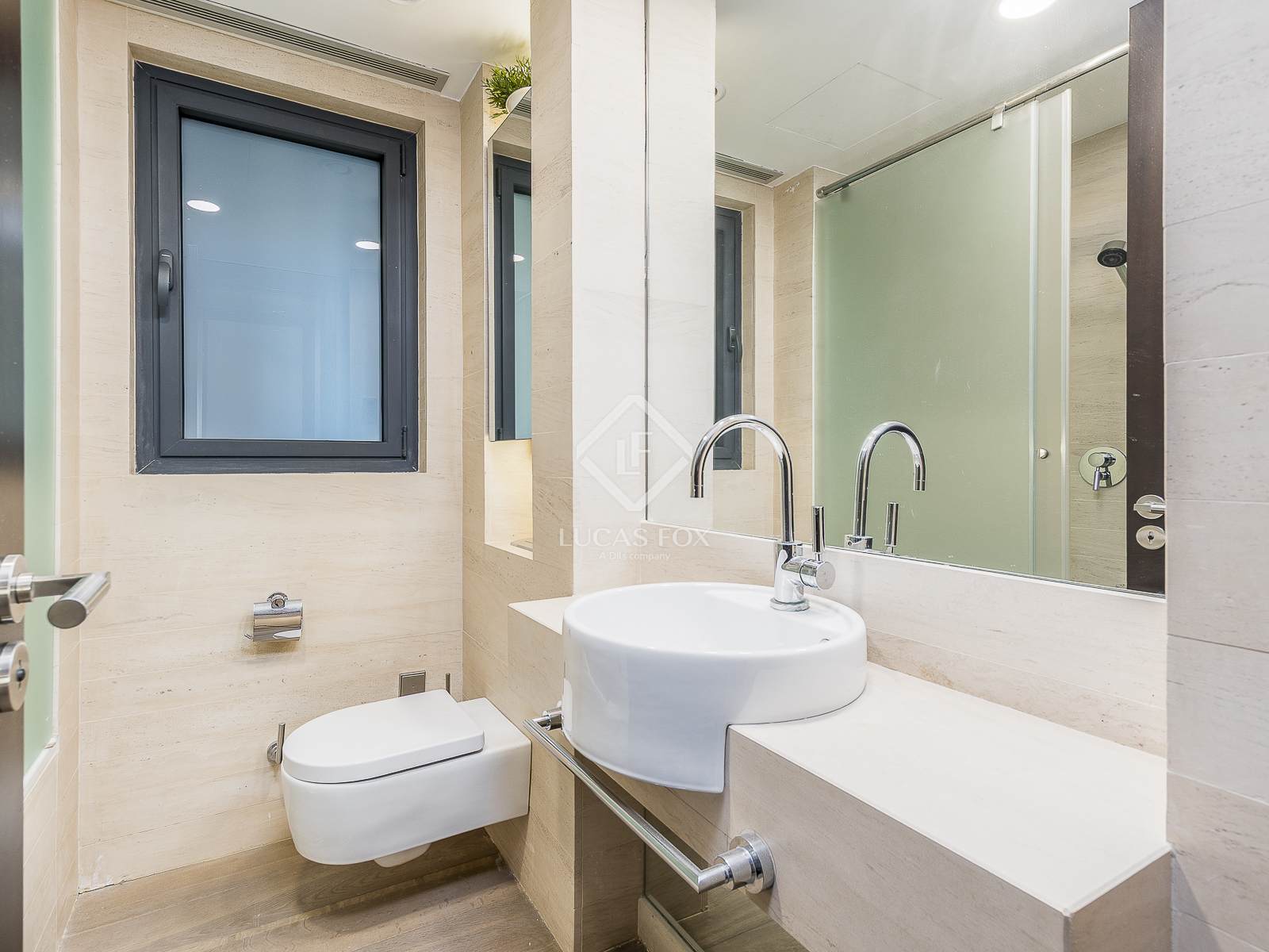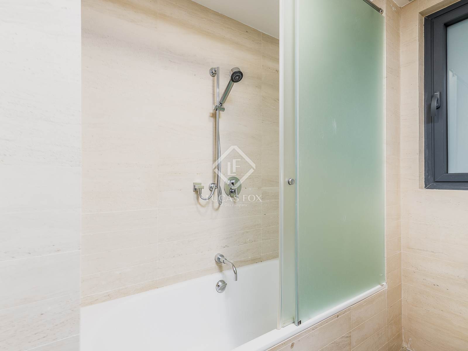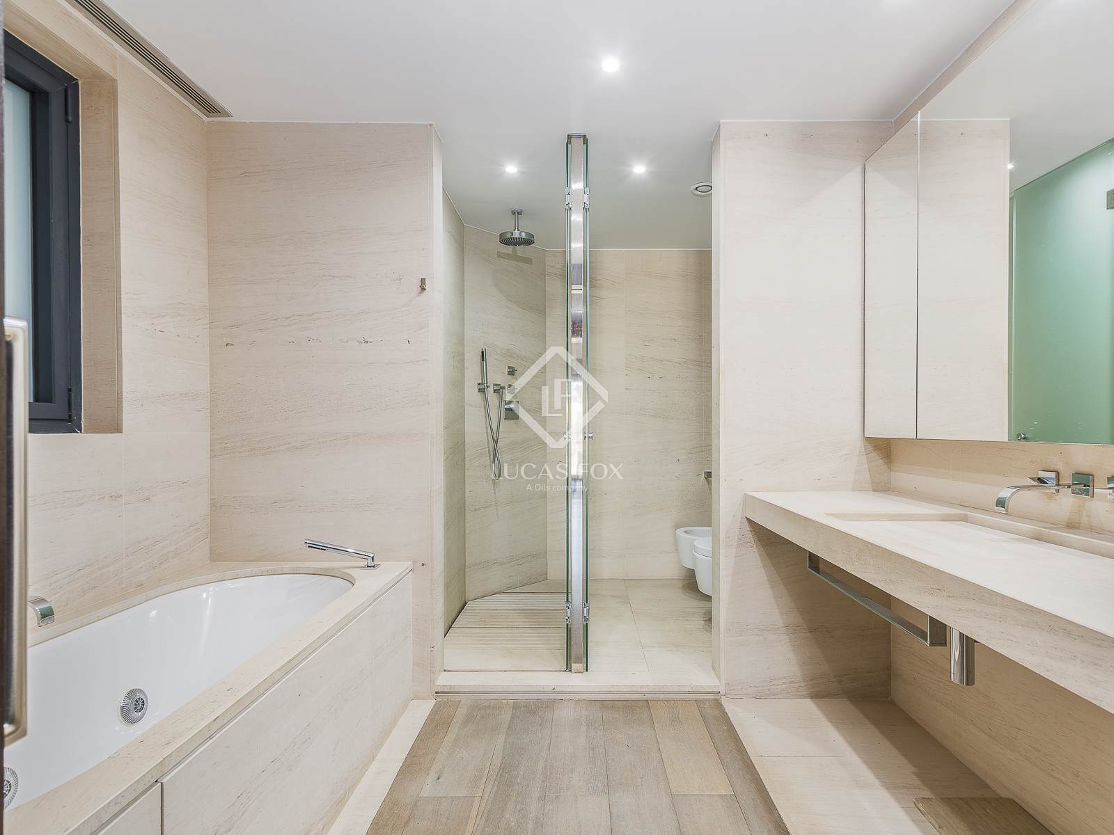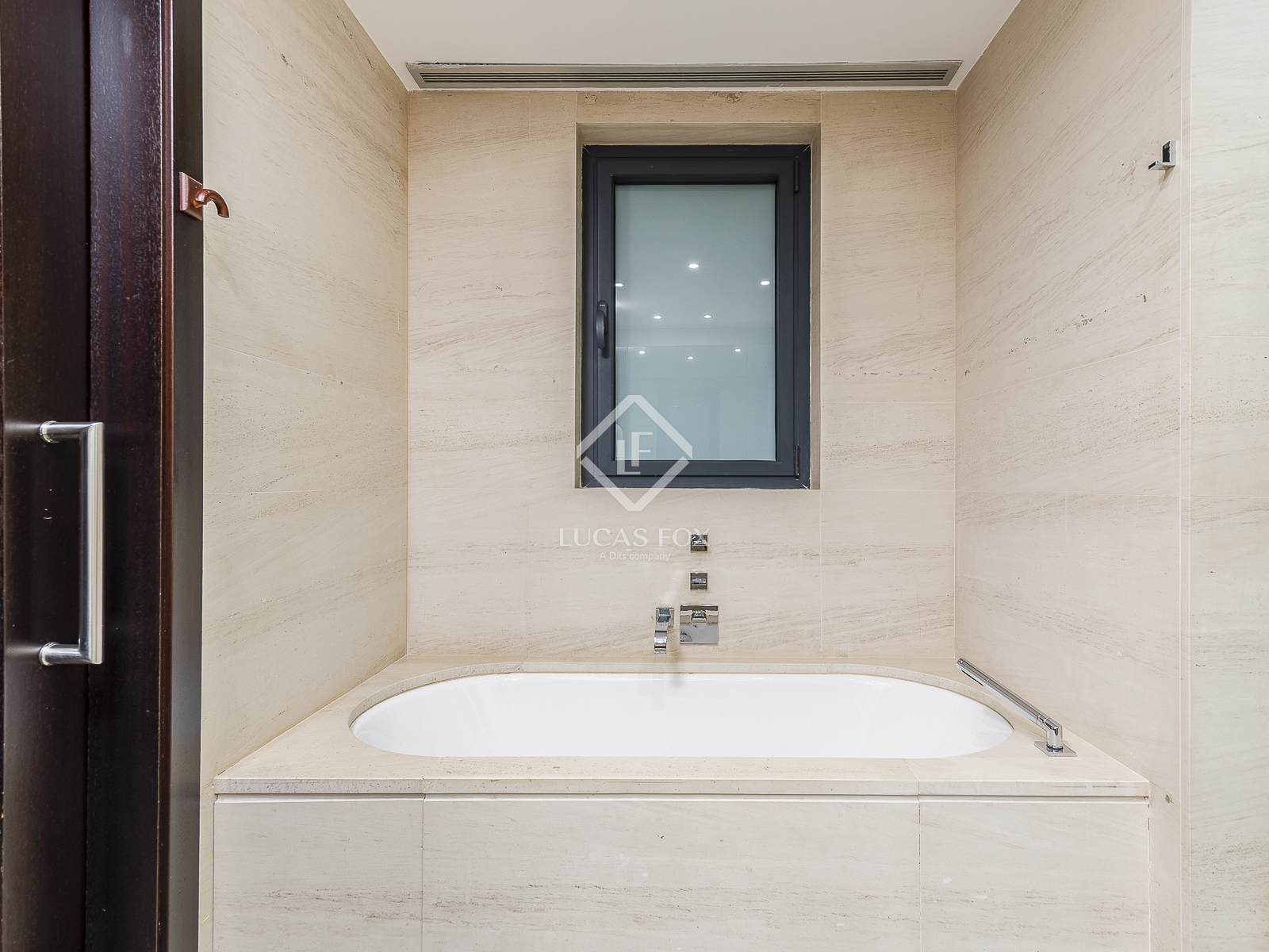 En la misma fachada principal encontramos la suite principal, de generosas dimensiones, con zona de lectura junto a los ventanales, un elegante vestidor y un baño completo con bañera, ducha independiente y doble lavabo.