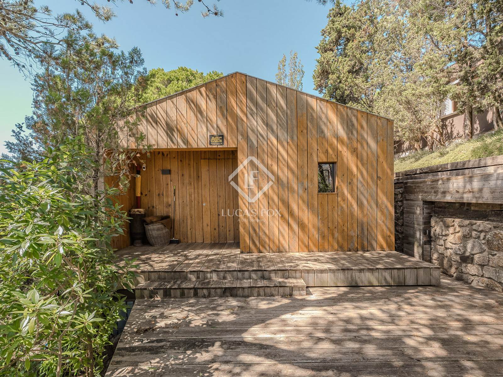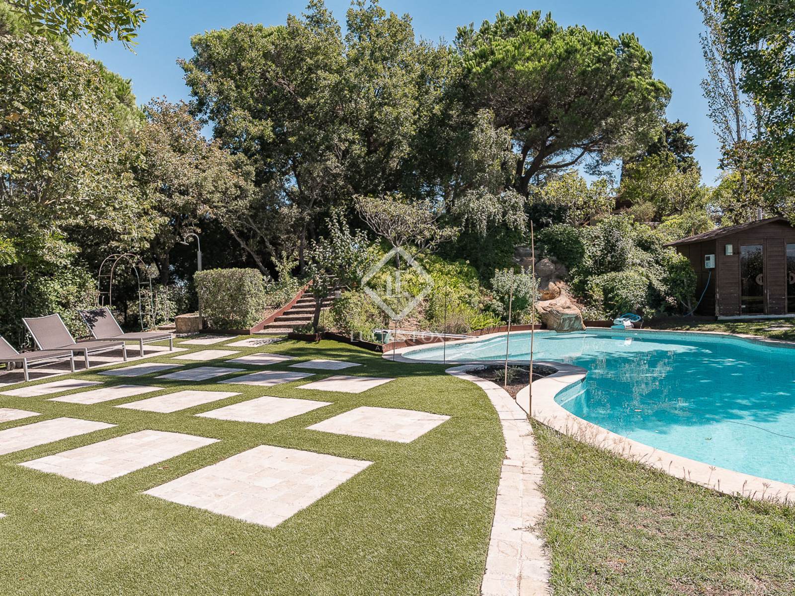 El jardín, con su exuberante vegetación, acoge una amplia piscina rodeada de calma y privacidad, que incluye una sauna seca, por lo que es el lugar perfecto para disfrutar de momentos de descanso y desconexión en un entorno incomparable.