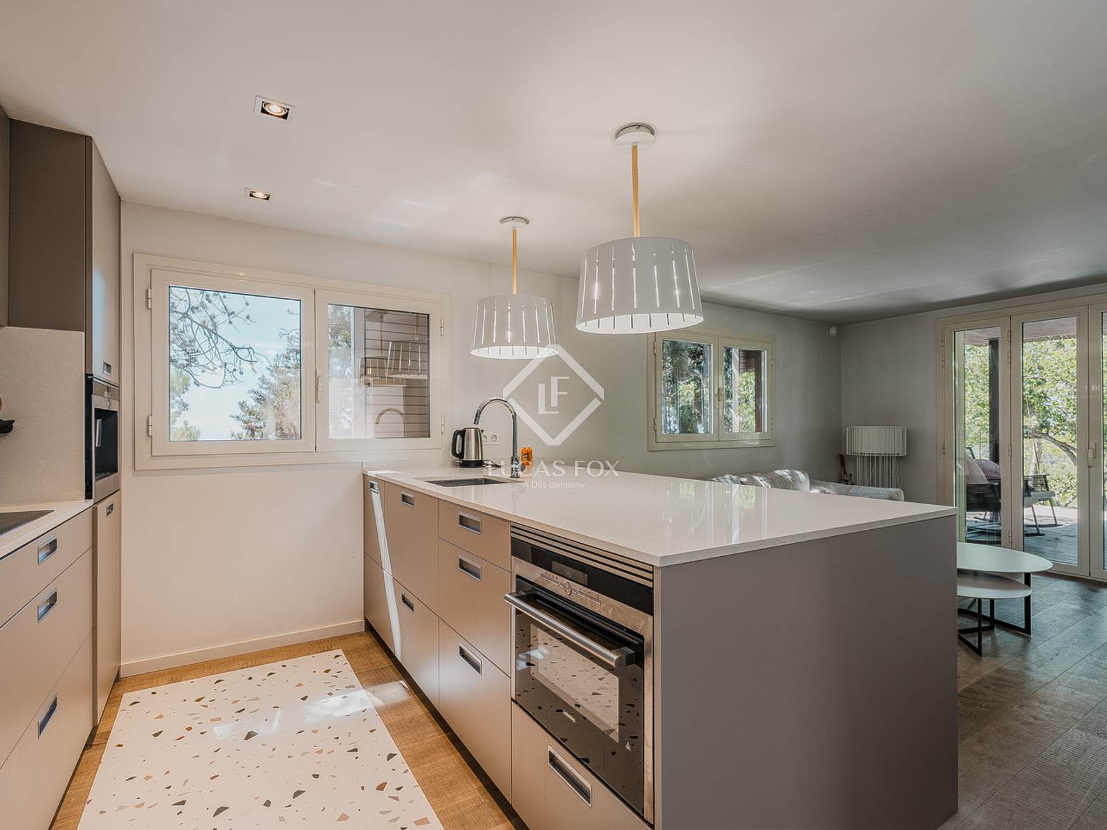 - Cocina independiente con office, gran capacidad de almacenaje, nevera doble, zona de lavadero y salida directa a la terraza y al jardín posterior, con espectaculares vistas a la montaña.