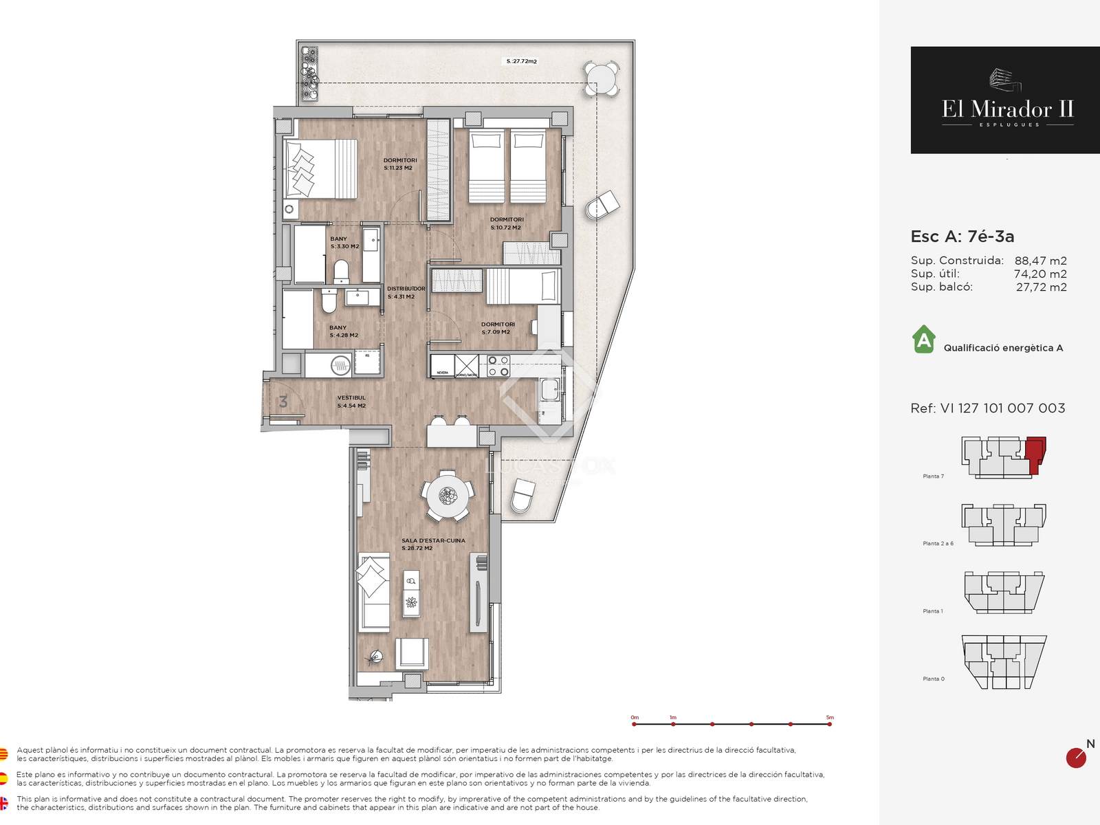 Este piso está situado en una séptima planta y ofrece una superficie interior de 88 m² más 27 m² de terraza. El piso cuenta con sala, comedor y cocina con terraza, 3 dormitorios y 2 baños.