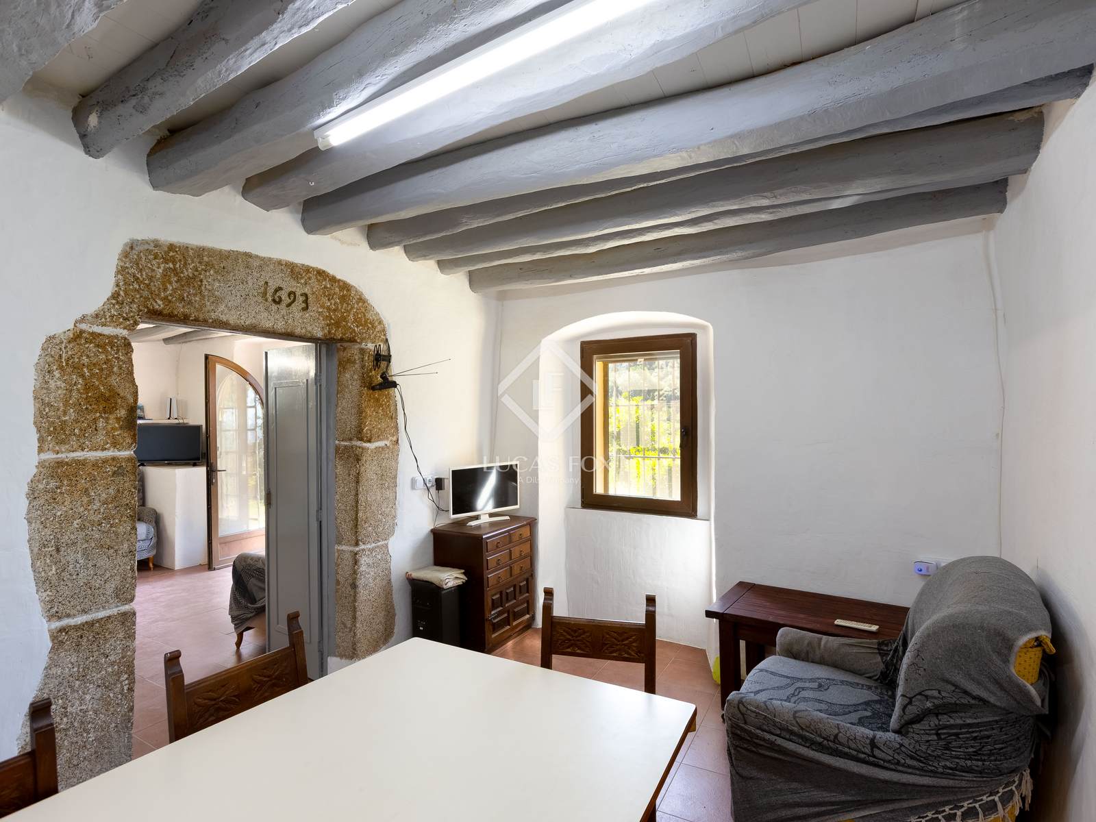 La masía se asienta sobre un terreno de 38 hectáreas con bosques, árboles frutales y zonas ajardinadas. La finca cuenta con varios edificios. La masía principal, construida en el siglo XVII, destaca por su carácter histórico y su presencia majestuosa y conserva elementos arquitectónicos originales de 1693. Se desarrolla en dos plantas. En la planta baja, se encuentra una amplia cocina con chimenea, así como un salón-comedor integrado con acceso directo al jardín trasero, que cuenta con zona de barbacoa y espacios exteriores pensados para celebraciones y momentos de relax. En la planta superior destacan dos grandes salas versátiles, que pueden adaptarse a diferentes usos como dormitorios, oficinas o zonas de estar adicionales.