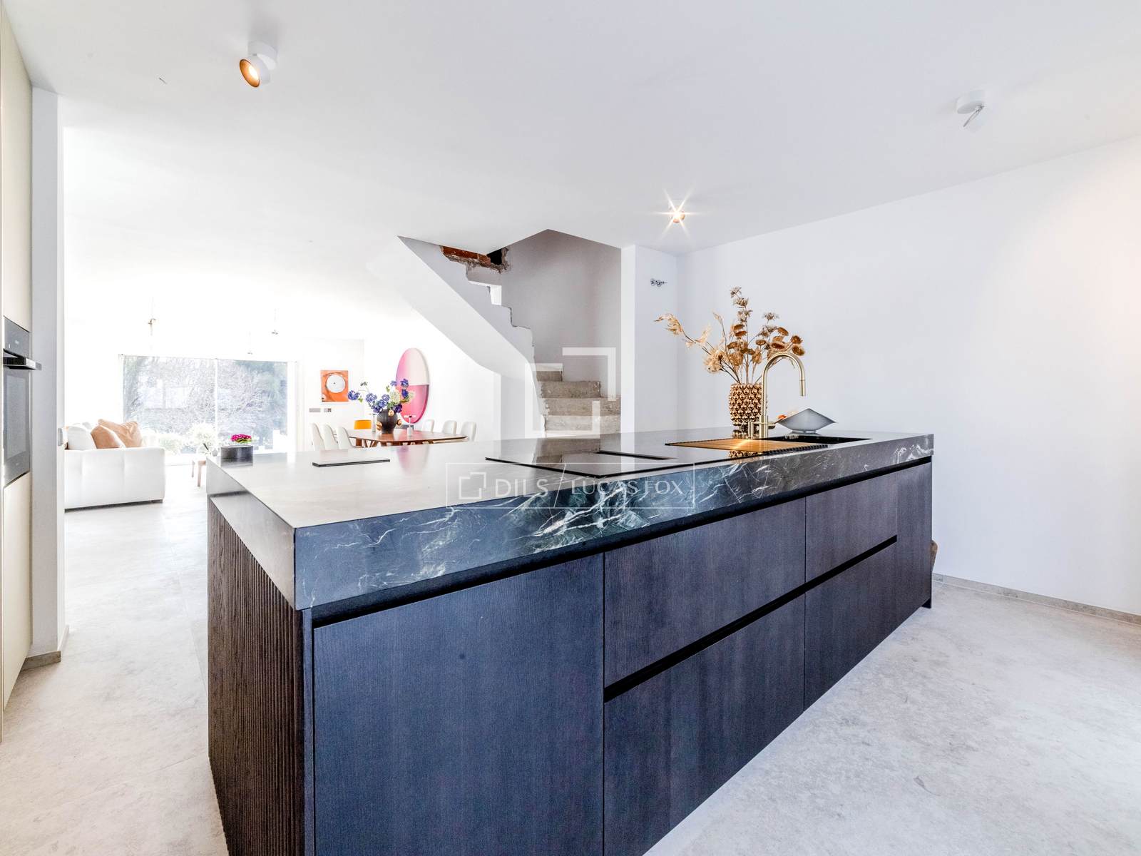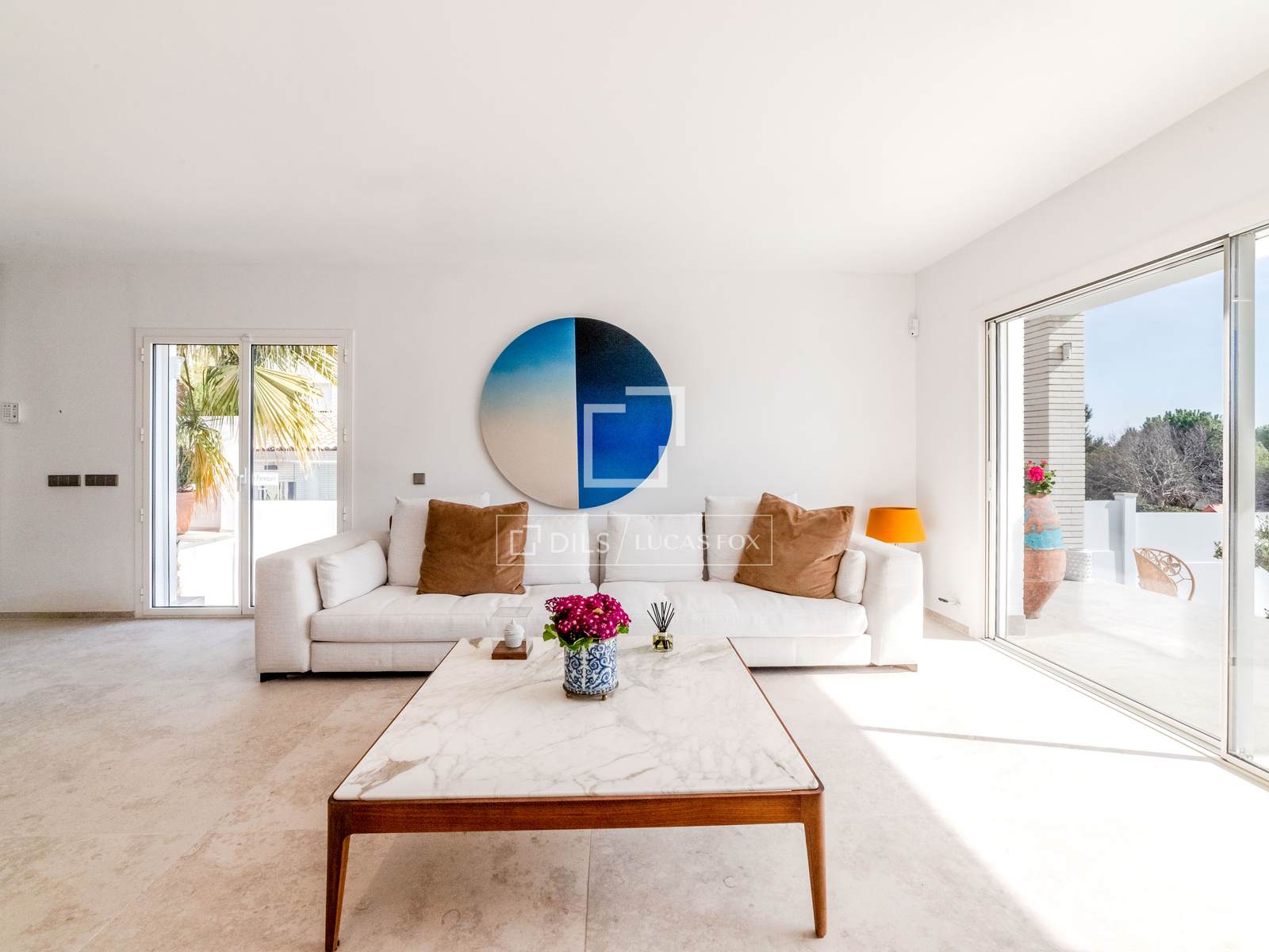 En el interior, la planta principal luce un luminoso diseño diáfano que integra a la perfección la sala de estar, el comedor y la cocina. Una elegante isla central define el espacio de la cocina, mientras que las amplias aberturas dan a dos terrazas independientes: una amplia terraza de aproximadamente 60 m² que rodea la parte trasera y lateral de la vivienda, y una segunda terraza de unos 10 m² que conecta directamente con el jardín y la piscina, perfecta para disfrutar de la vida interior y exterior.