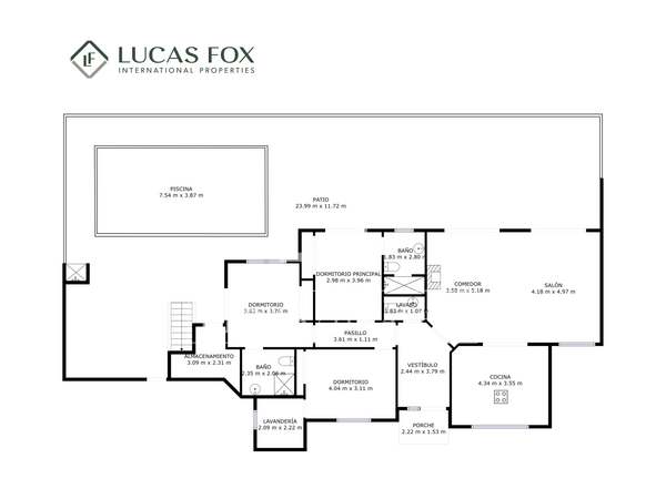 La planta principal alberga las estancias principales de la casa, comenzando con un amplio y luminoso salón-comedor que se conecta directamente con la terraza exterior. Desde aquí, se accede a una espectacular piscina con una lámina de agua de 45 m², ideal para disfrutar del clima mediterráneo durante todo el año.