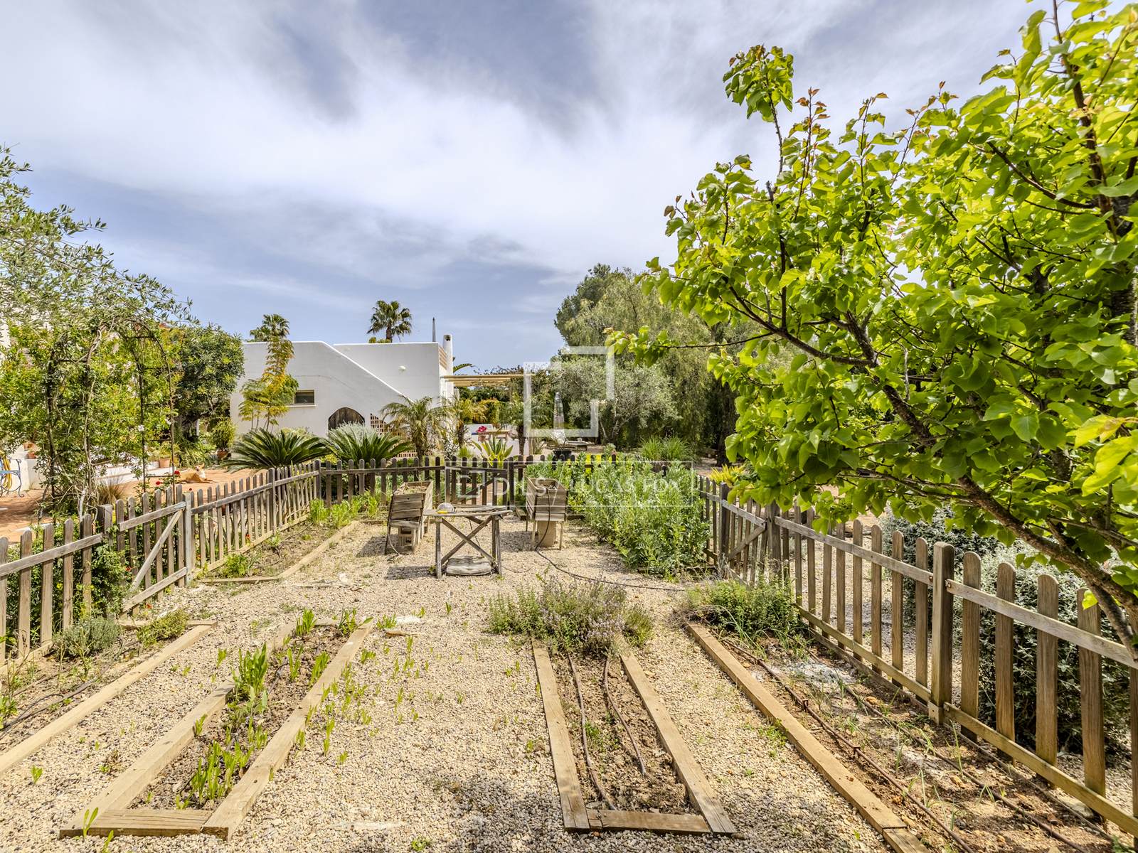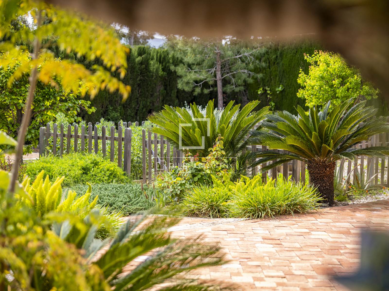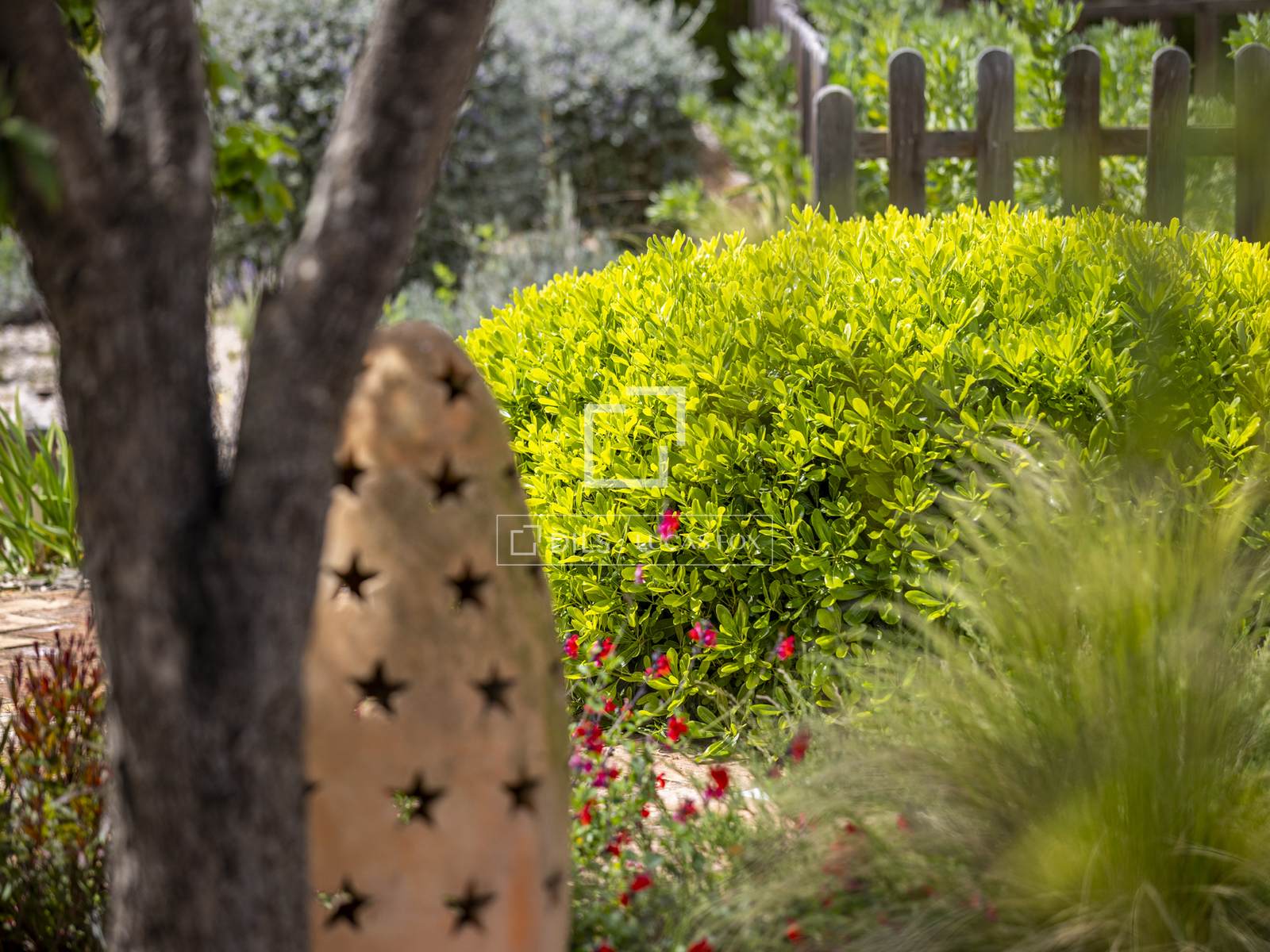 - Jardín mediterráneo paisajístico, cubierto de grava, con árboles frutales, olivos, setos maduros, plantas y flores autóctonas.