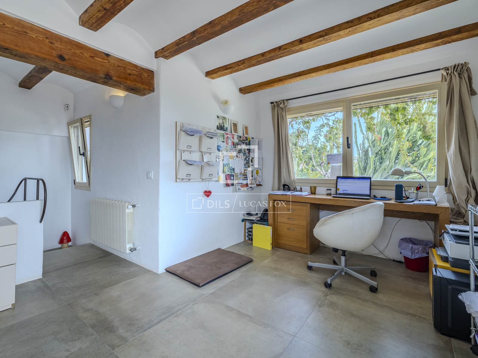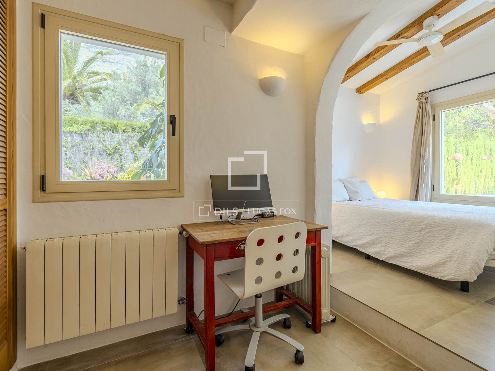 La casa principal cuenta con un amplio baño familiar y tres habitaciones dobles, todas con armarios empotrados. Un aseo de cortesía se encuentra convenientemente ubicado junto al recibidor. Una escalera conduce a un versátil despacho en la planta superior, que se abre a una gran terraza en la azotea con impresionantes vistas al Montgó y al valle. Este es el lugar perfecto para disfrutar del café matutino o relajarse con un cóctel al atardecer. Este despacho podría convertirse fácilmente en una espaciosa dormitorio principal si se desea.