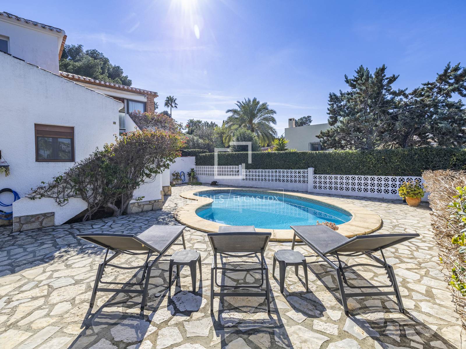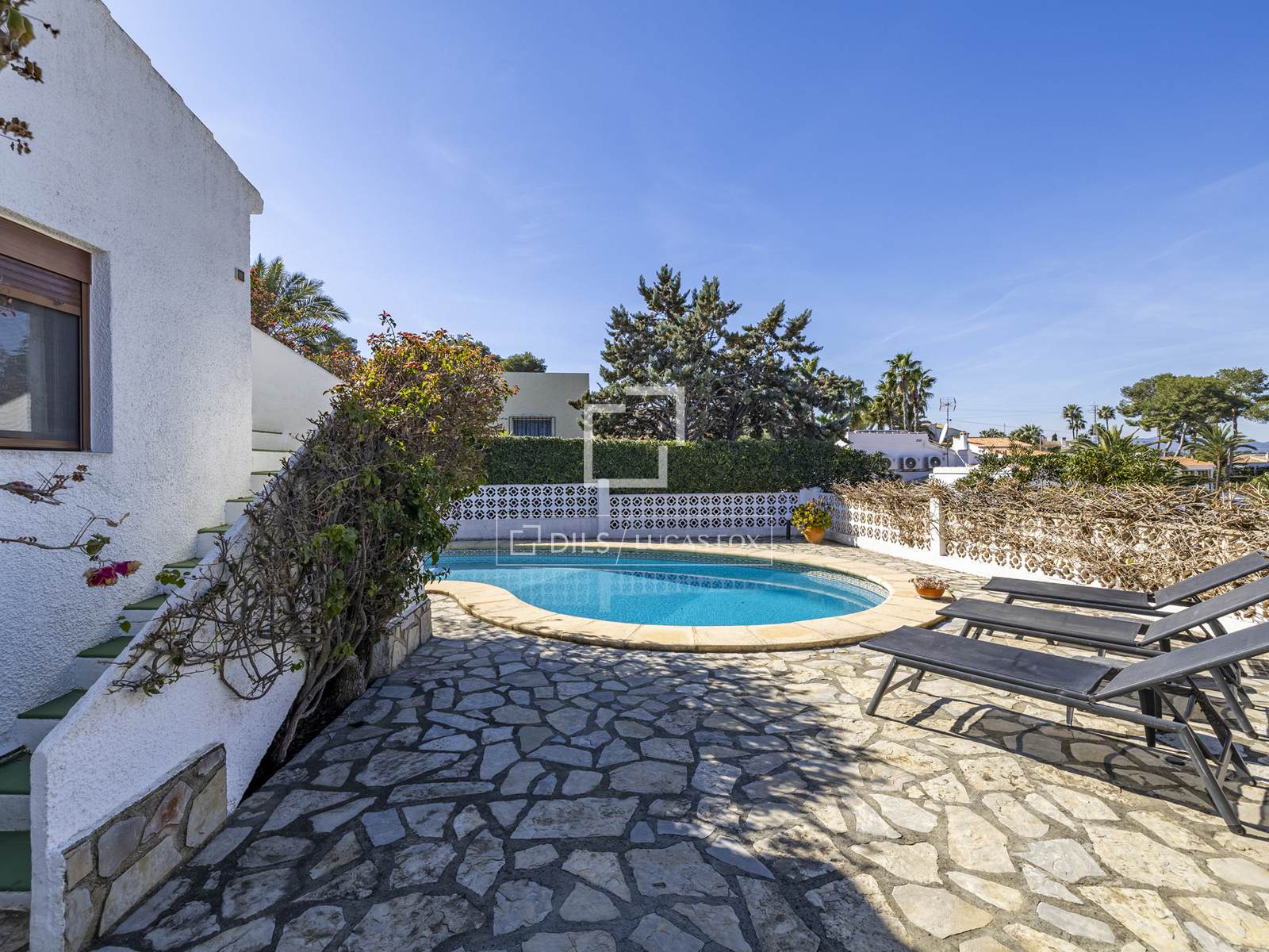 Ubicada en la consolidada zona residencial de Toscal en Jávea (Xàbia), la vivienda disfruta de una ubicación tranquila a pocos pasos de las aguas cristalinas de Cala Blanca y a solo unos minutos en coche del paseo marítimo de la playa de arena del Arenal con sus restaurantes, cafeterías y tiendas.