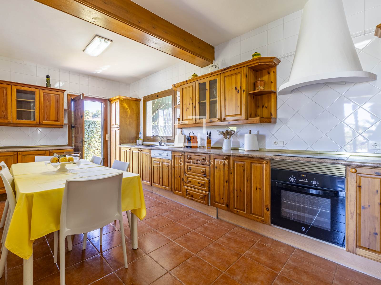 La espaciosa cocina ofrece abundante espacio de trabajo y almacenamiento, ideal para vivir en familia o recibir invitados, y tiene acceso independiente a la terraza y al área de barbacoa.