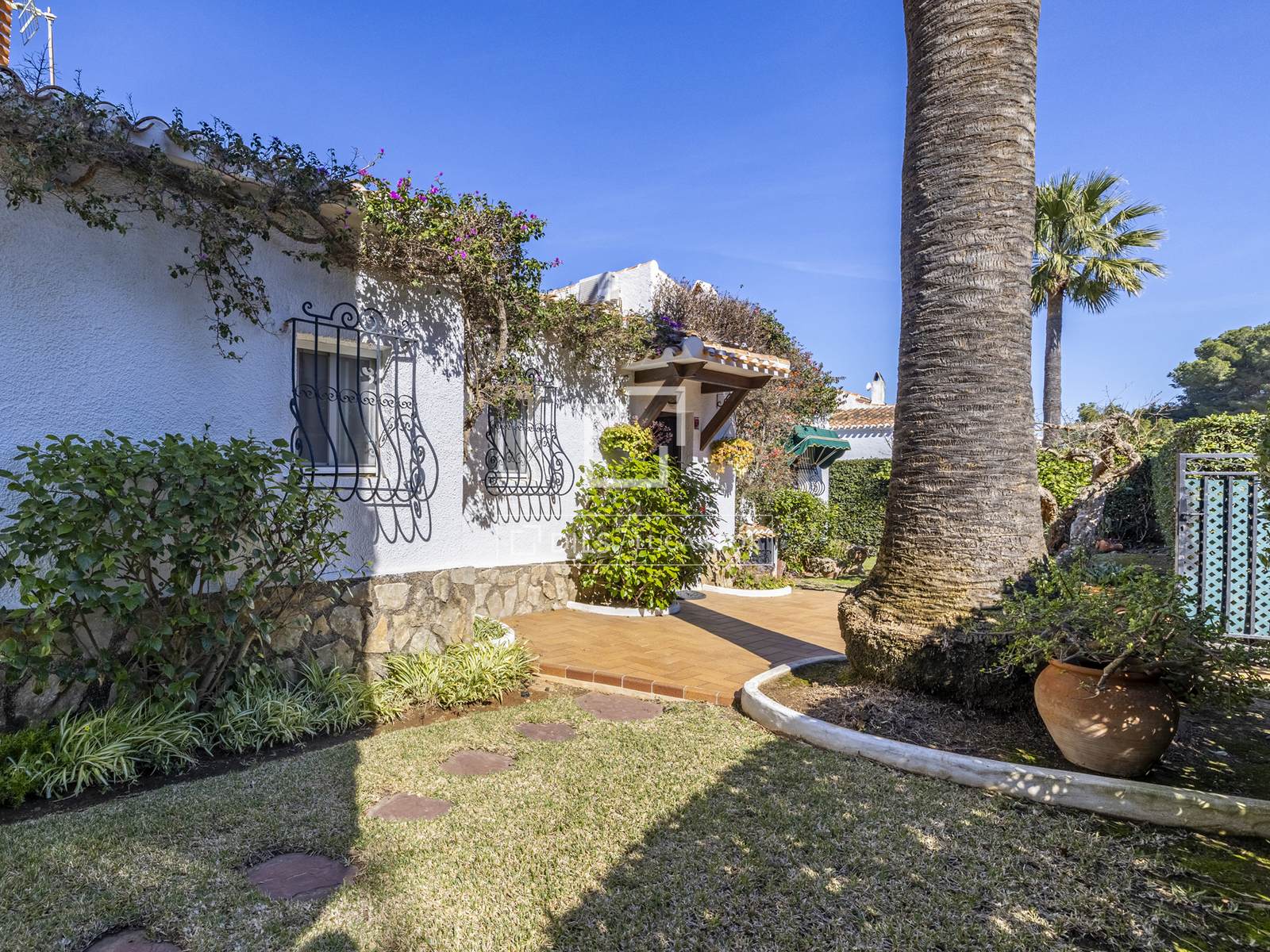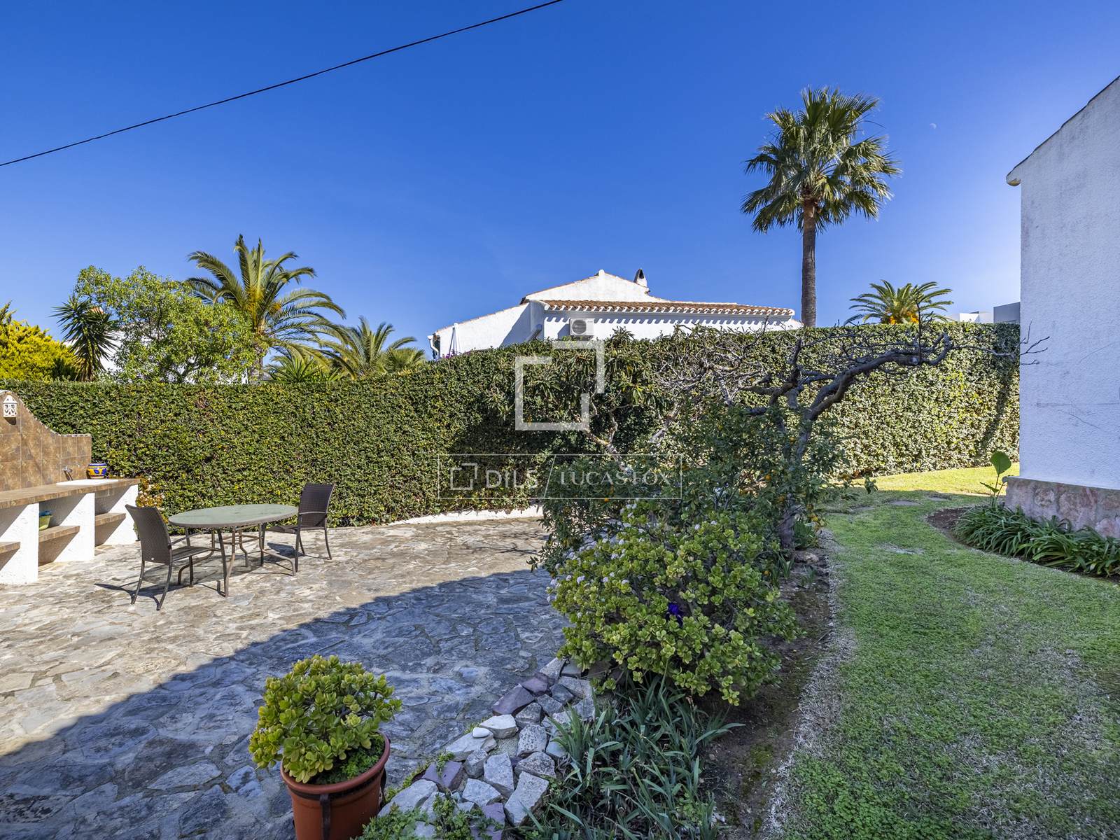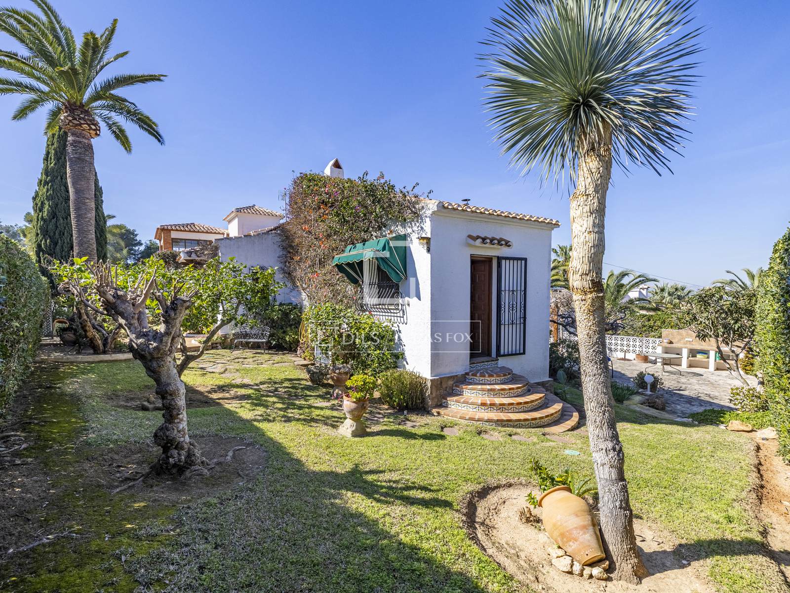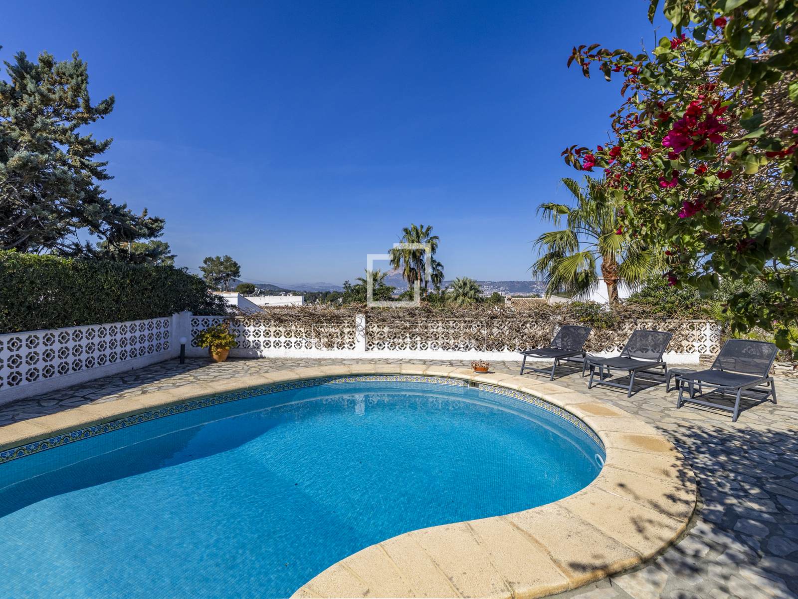 En el exterior, el exuberante jardín maduro rodea la vivienda, creando rincones sombreados y terrazas soleadas, ideales para relajarse o entretenerse. Plantas autóctonas, árboles consolidados y detalles de piedra natural enmarcan vistas panorámicas al Montgó y un pequeño atisbo de la bahía de Jávea.