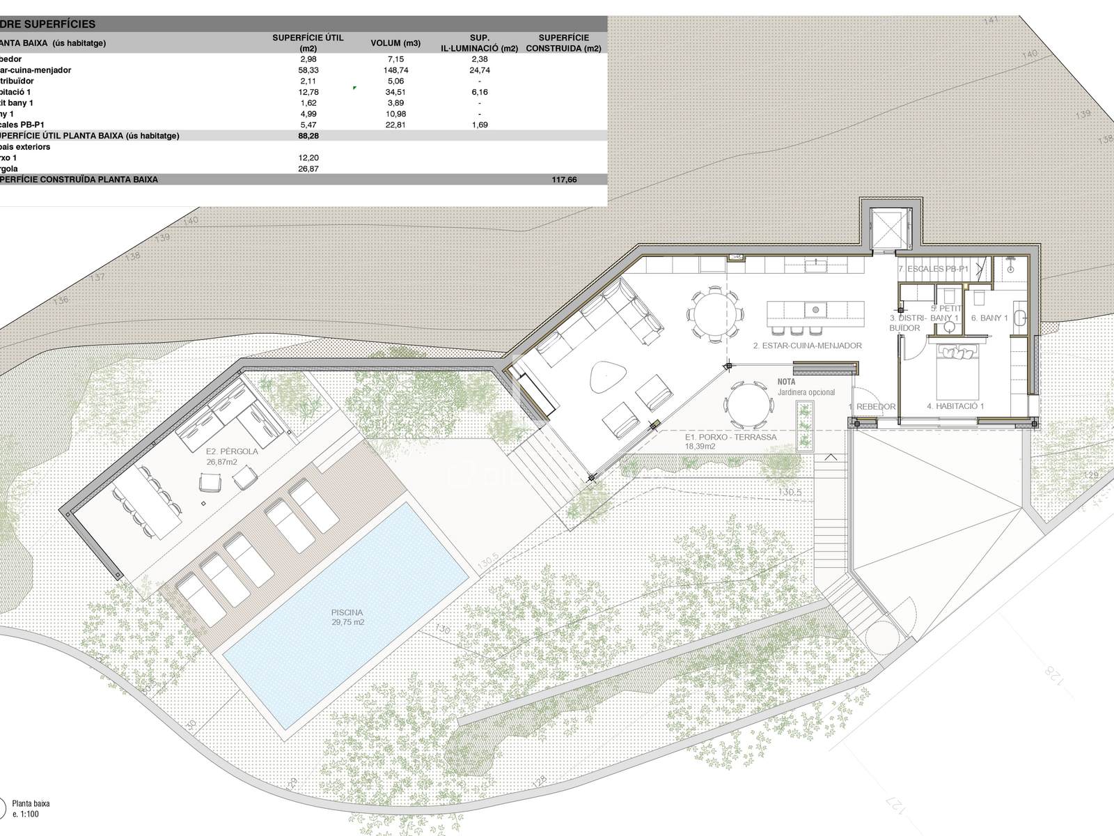 La planta baja presenta un amplio espacio de planta abierta que integra cocina, comedor y sala de estar. Gracias a sus ventanales disfruta de abundante luz natural y de vistas al mar. En esta misma planta, se encuentran también un dormitorio con baño privado, un aseo de cortesía y una gran terraza con piscina, perfecta para relajarse y disfrutar del entorno.