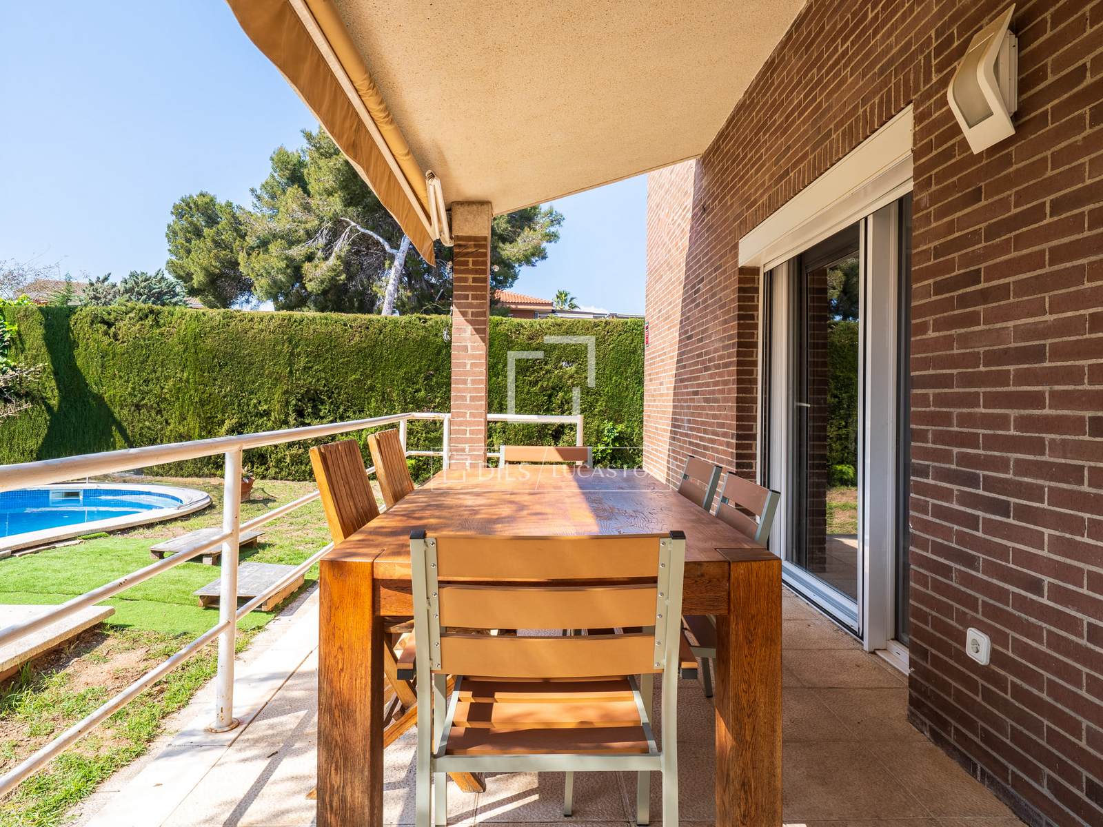 El salón se expande hacia un porche techado, un auténtico salón de verano ideal para cenas bajo las estrellas, que conecta directamente con un bonito jardín y una piscina. El área exterior rodea completamente la casa, dejando ver las cuatro fachadas de su construcción.
