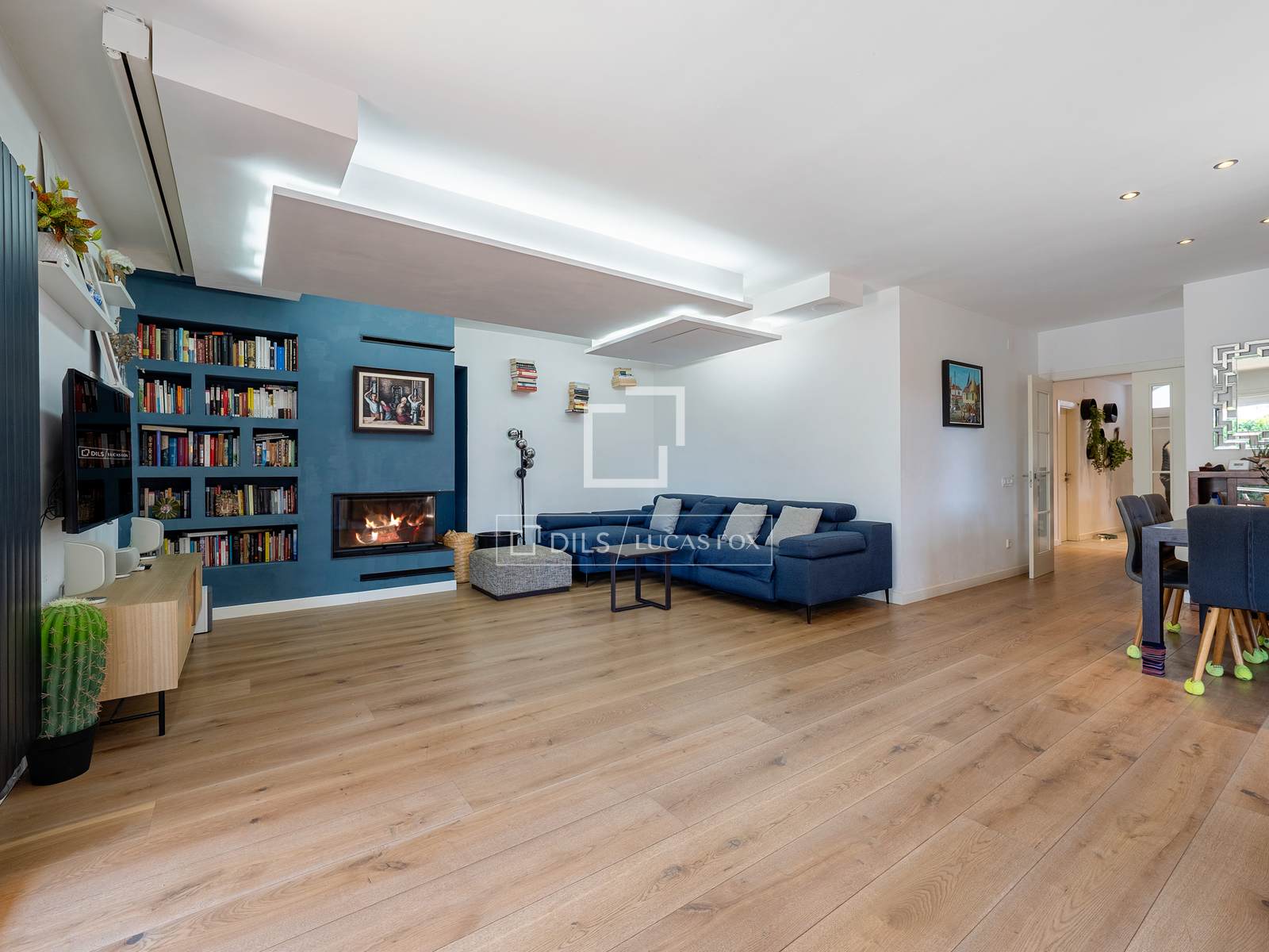La chimenea de diseño actúa como punto focal, aportando una calidez sofisticada durante el invierno.