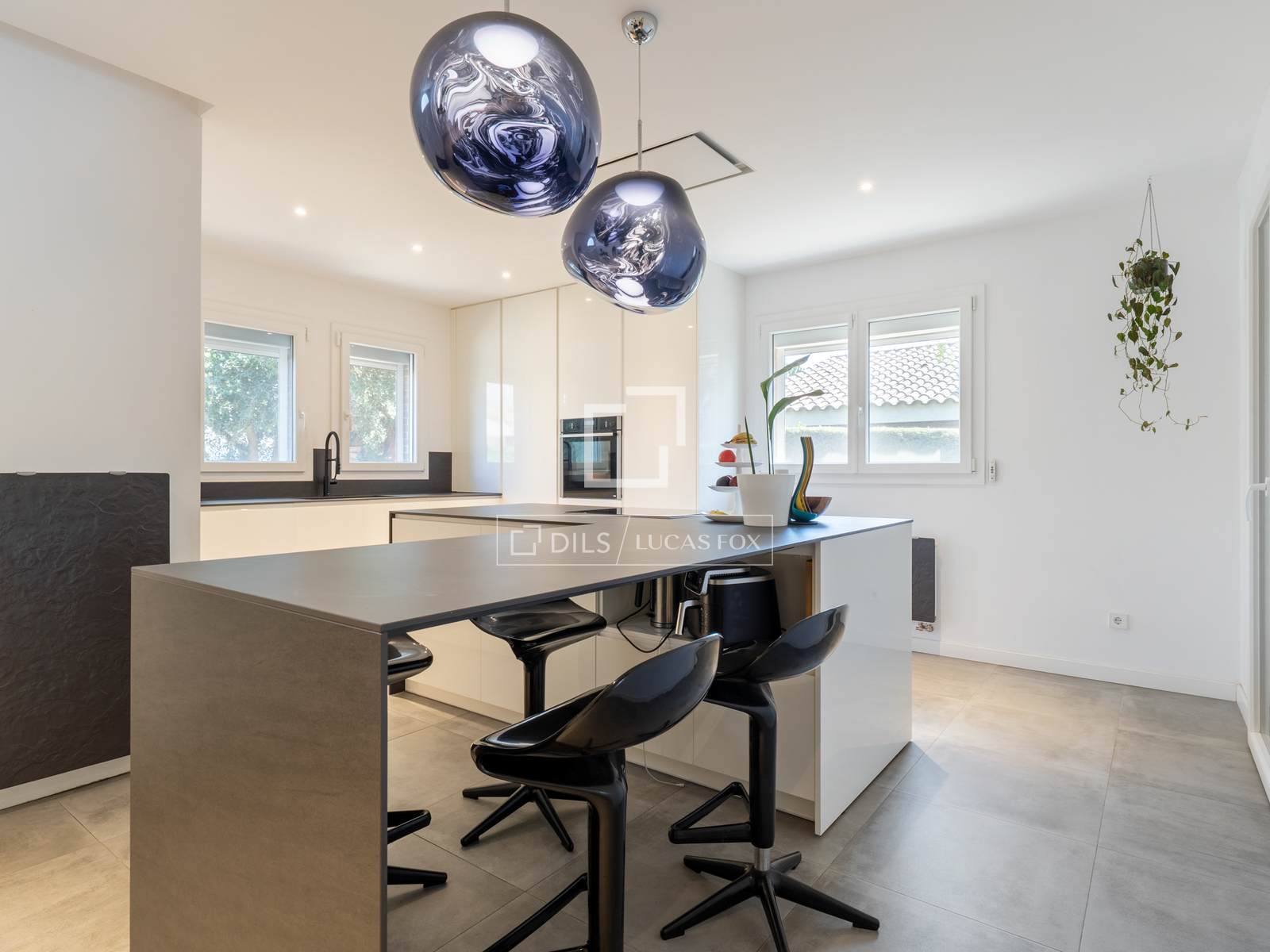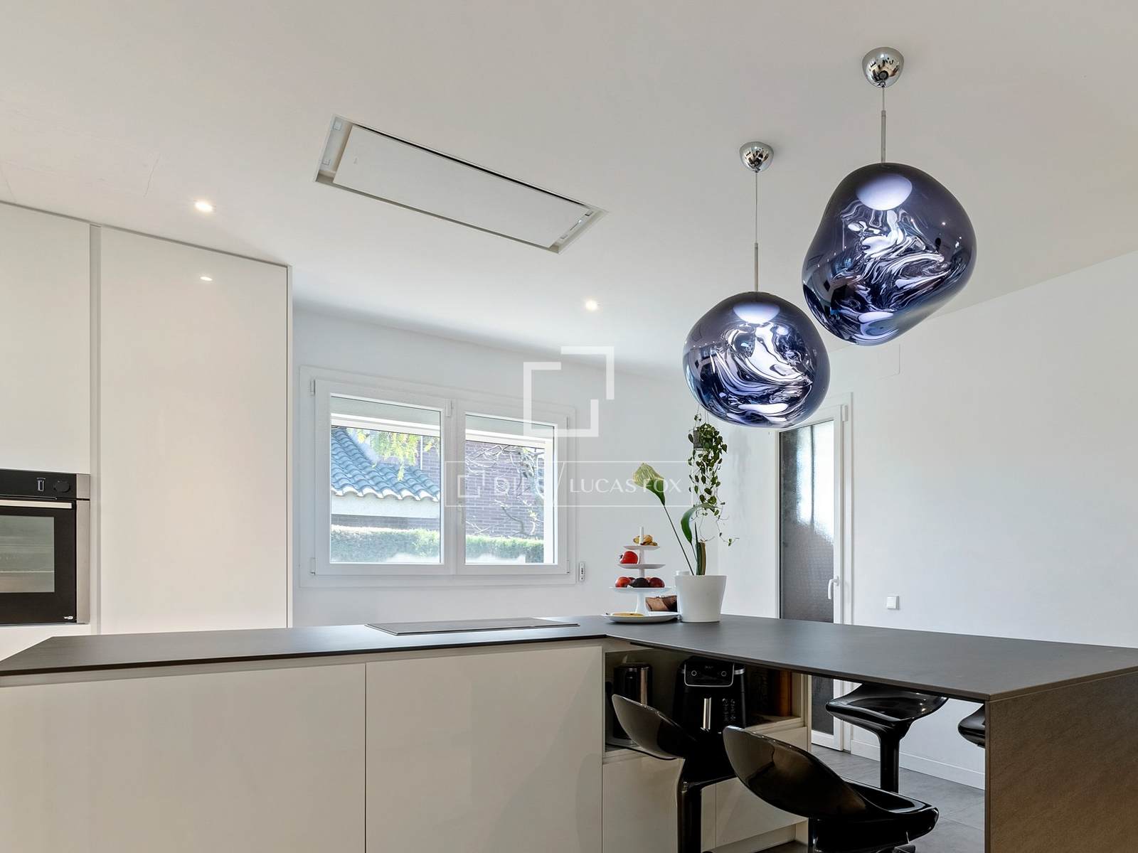 El área se completa con una zona de desayuno con taburetes altos, perfecta para mañanas informales o para acompañar al anfitrión durante la preparación de sus manjares.