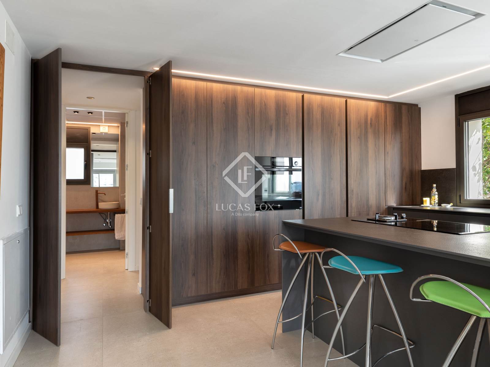 Espacio diáfano con cocina de isla, comedor y salón con proyector y sonido envolvente