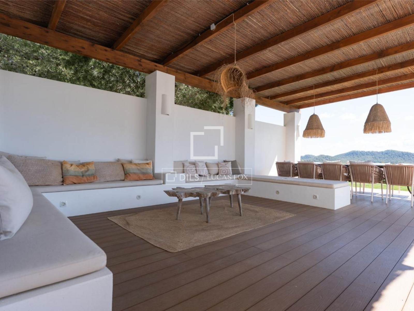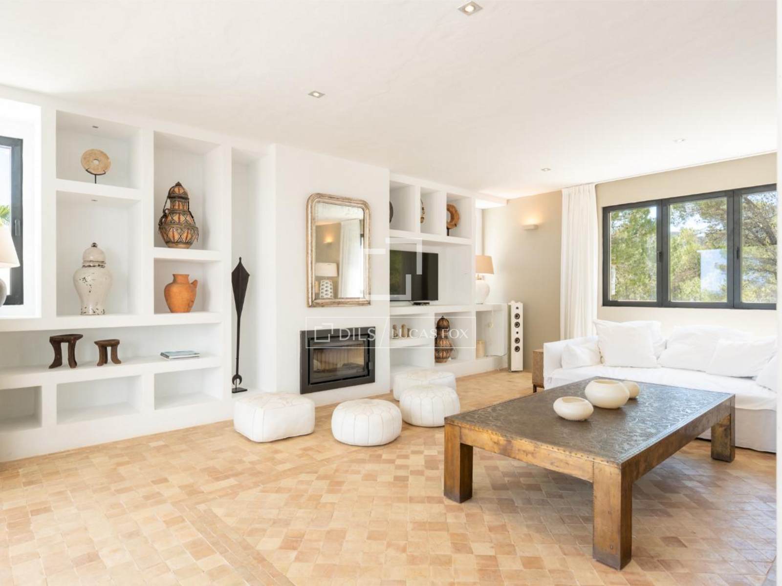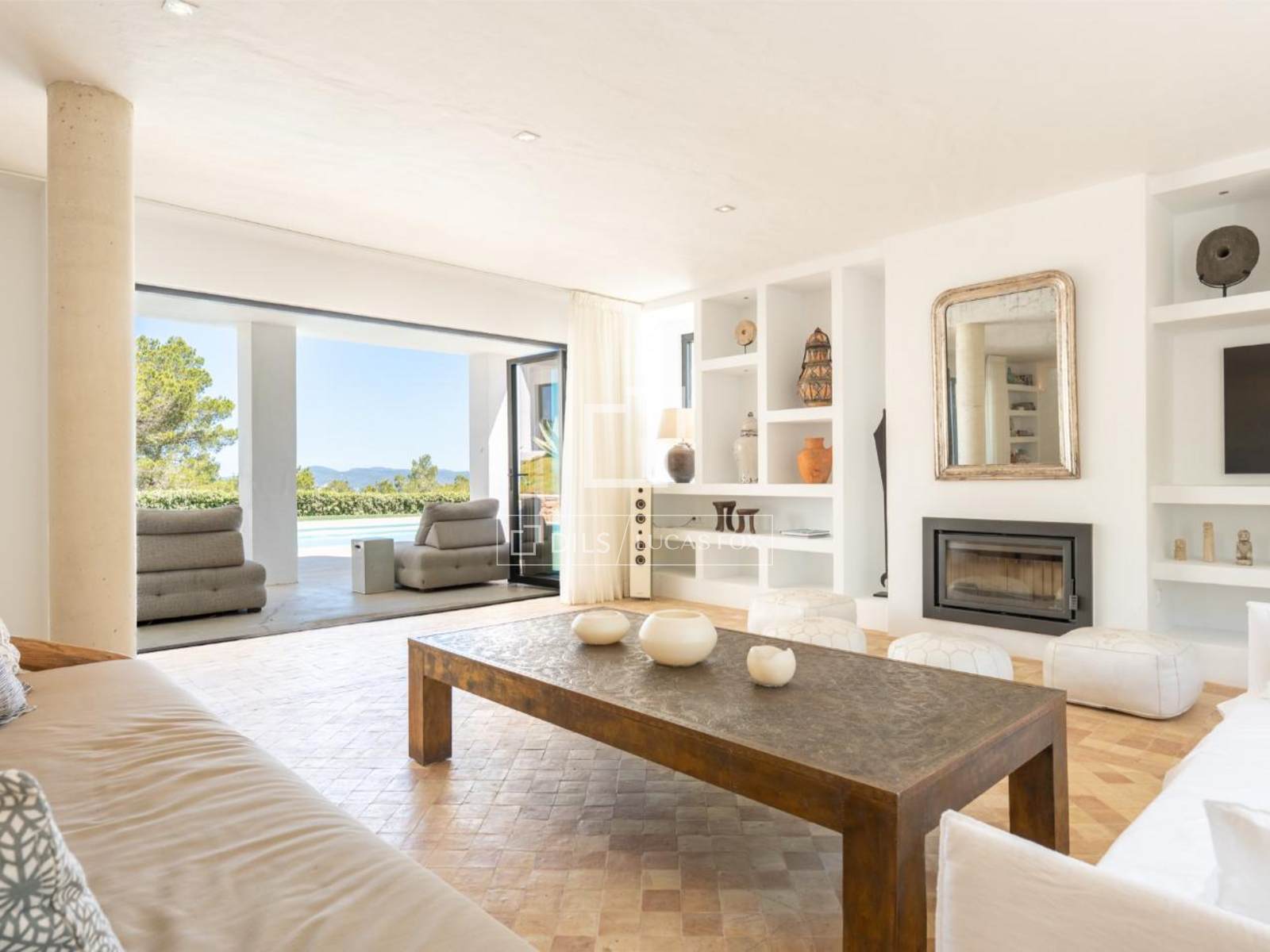 El luminoso salón con chimenea se abre a una amplia terraza diseñada para disfrutar del aire libre. Aquí, una cocina exterior y una zona de barbacoa crean el ambiente perfecto para disfrutar del cálido clima ibicenco y las vistas del atardecer.