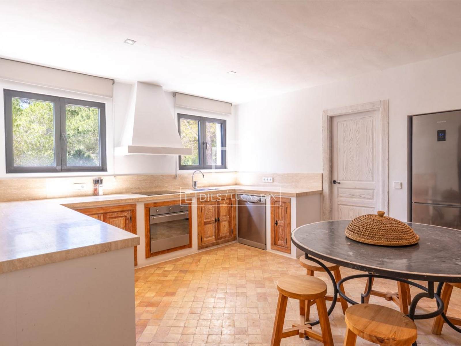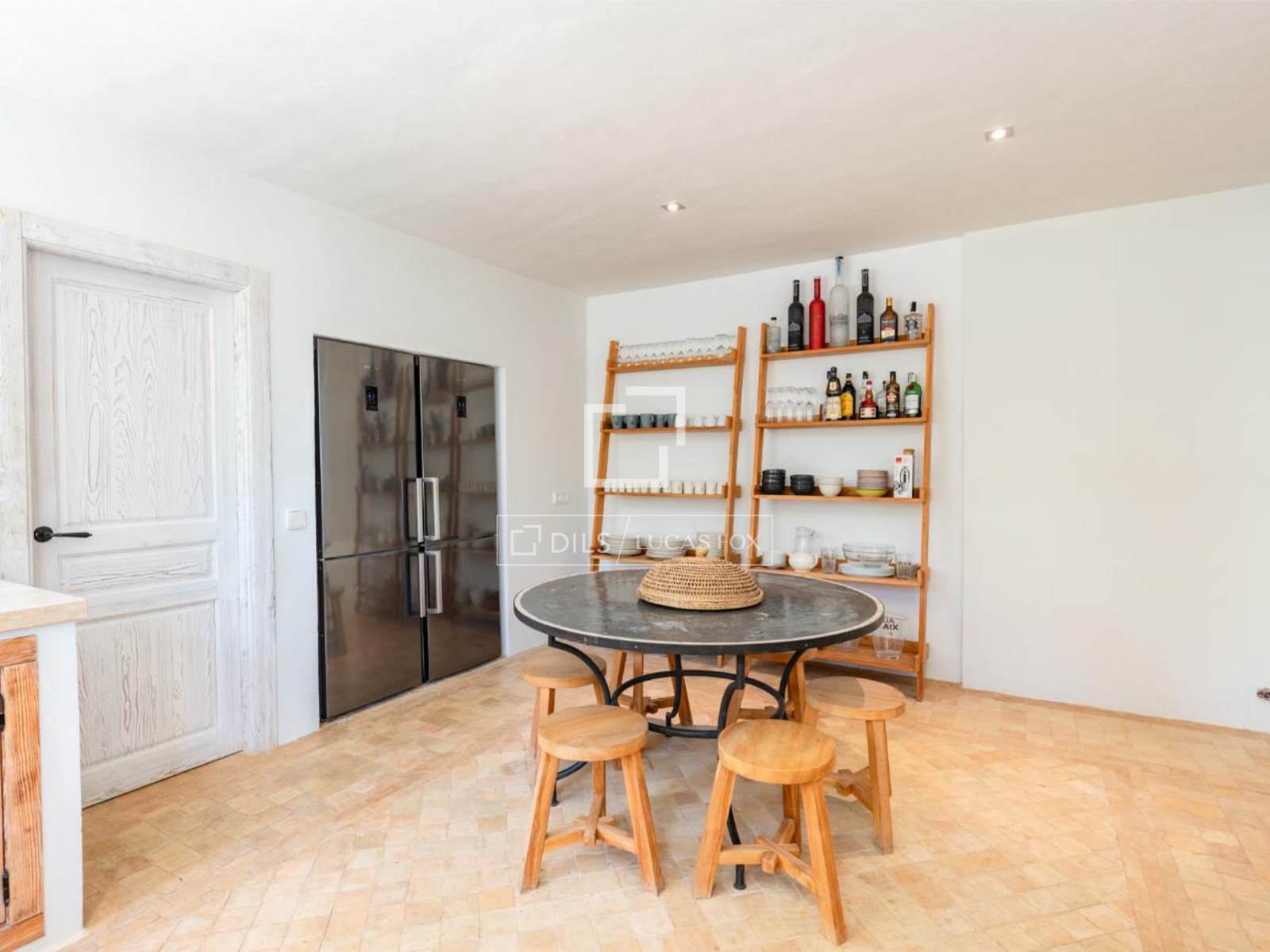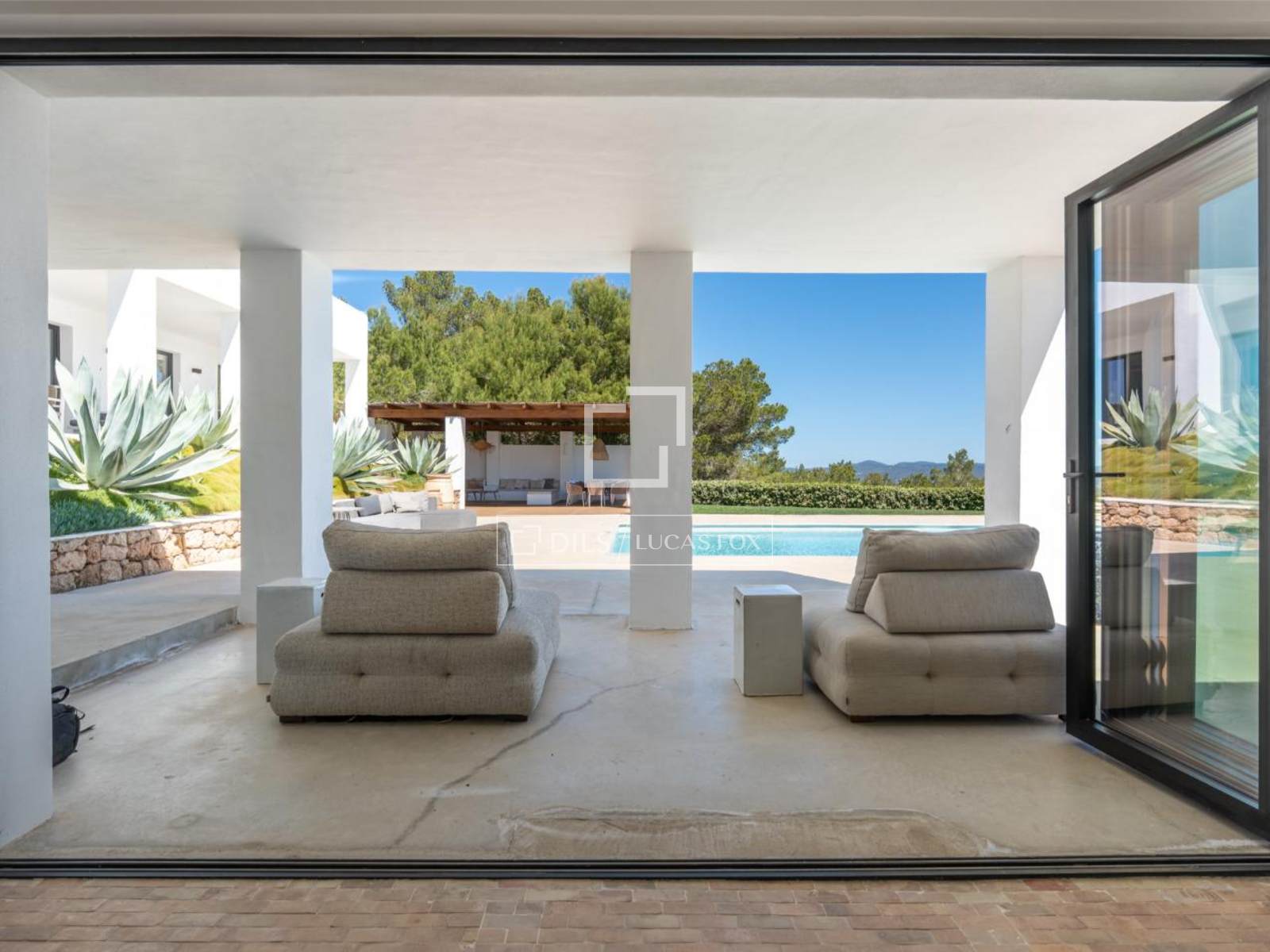 El luminoso salón con chimenea se abre a una amplia terraza diseñada para disfrutar del aire libre. Aquí, una cocina exterior y una zona de barbacoa crean el ambiente perfecto para disfrutar del cálido clima ibicenco y las vistas del atardecer.