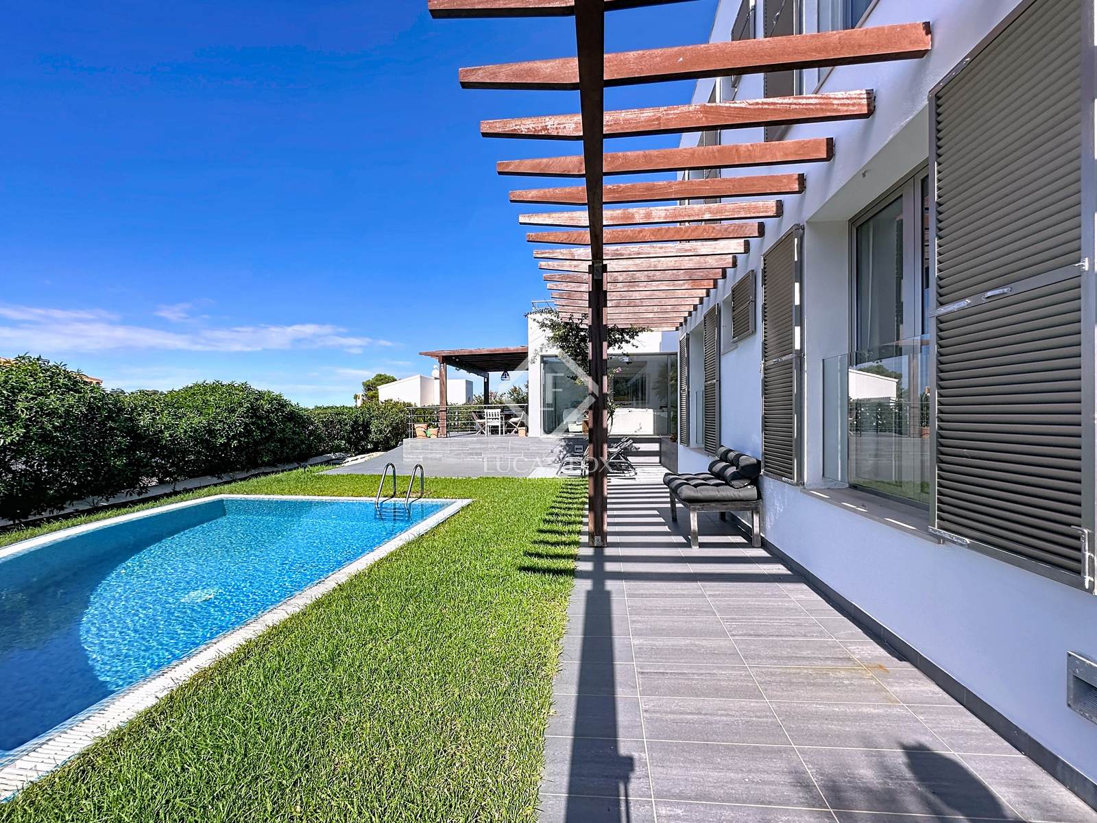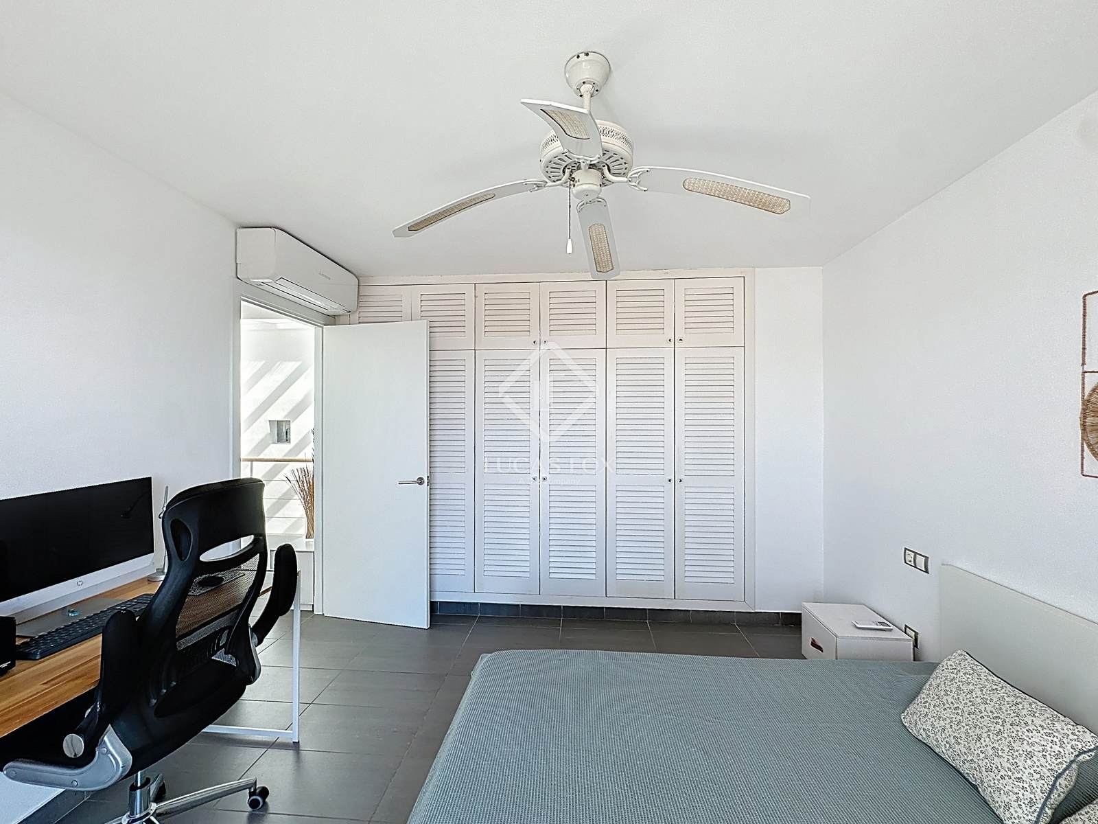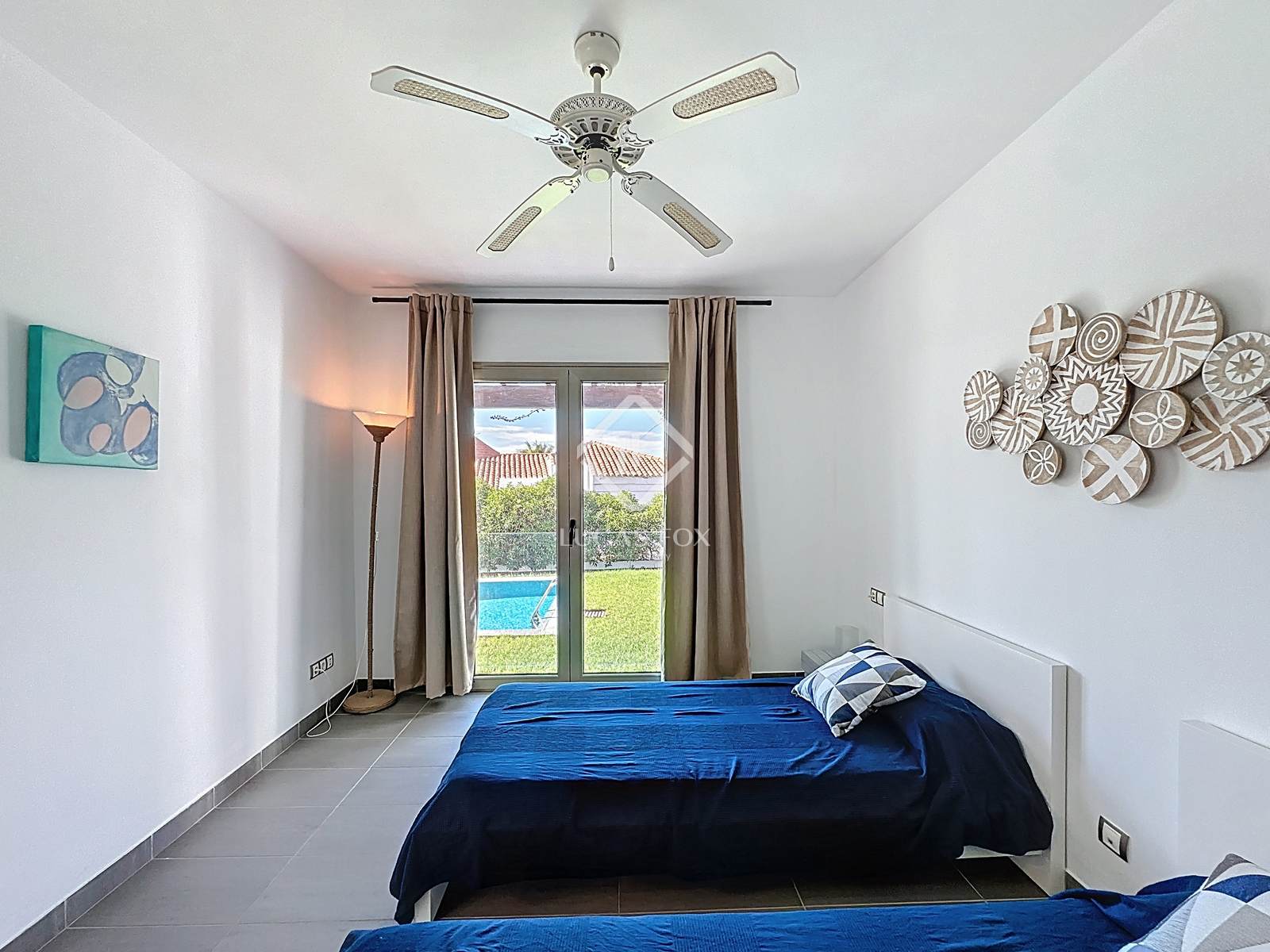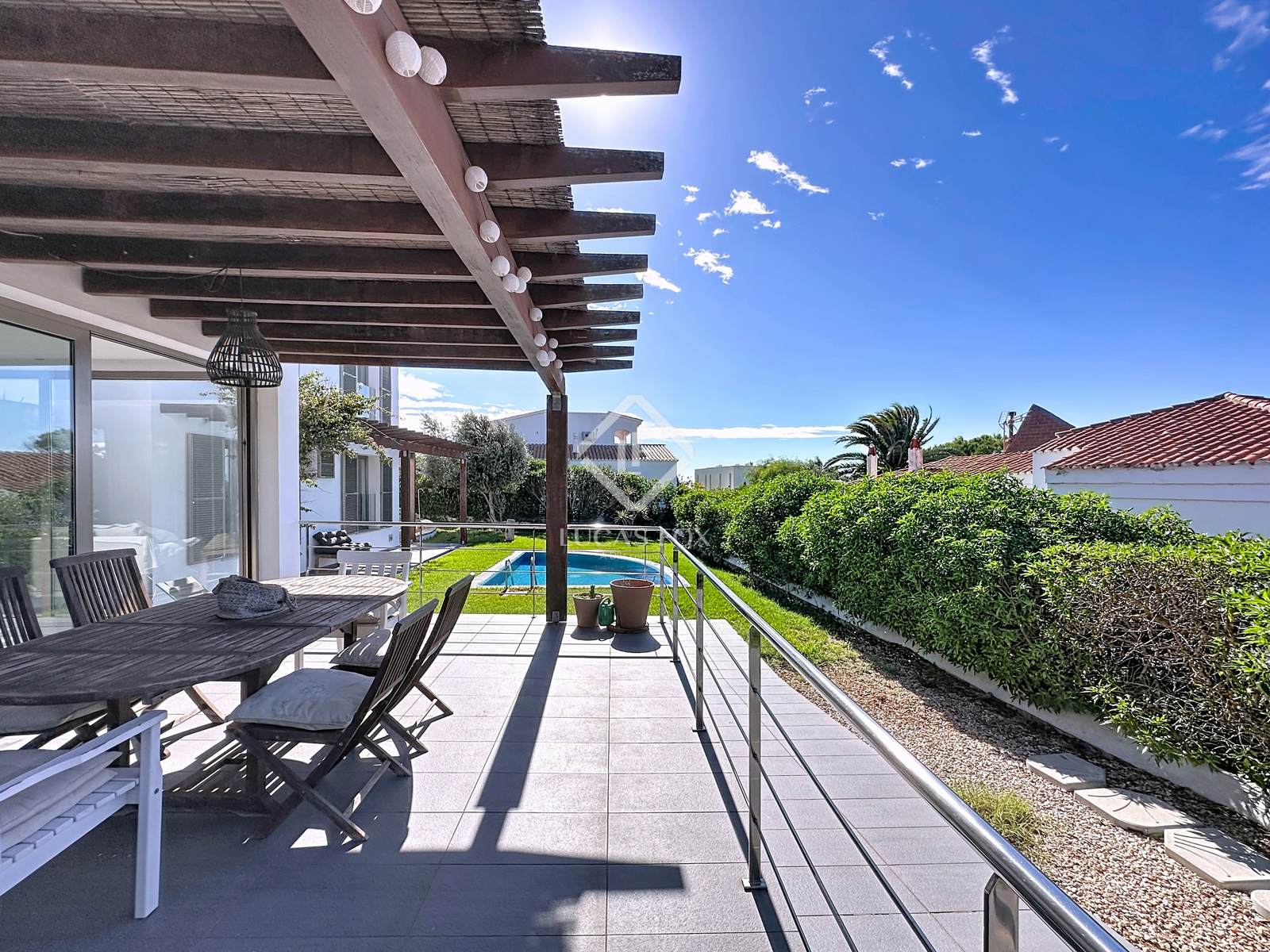 En el exterior, se ofrece un cuidado jardín con riego automático que rodea la vivienda, junto con una piscina privada. La terraza principal ofrece vistas al mar y a la isla de Mallorca en el horizonte.