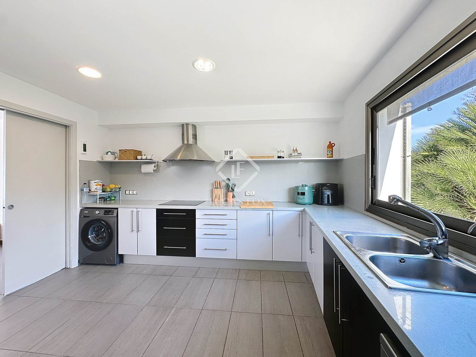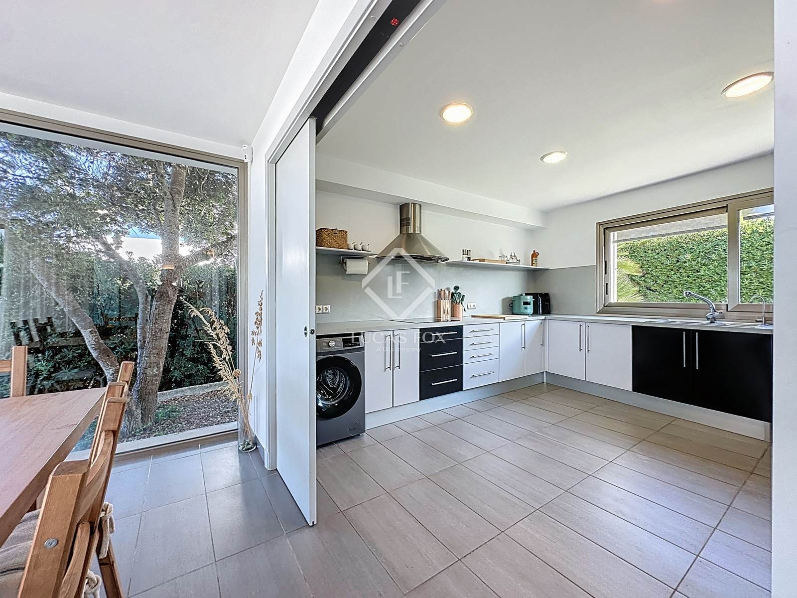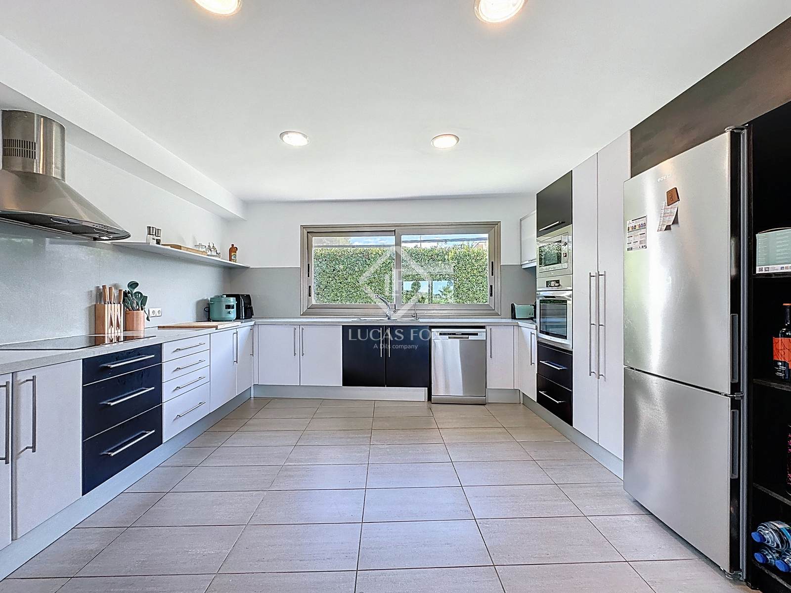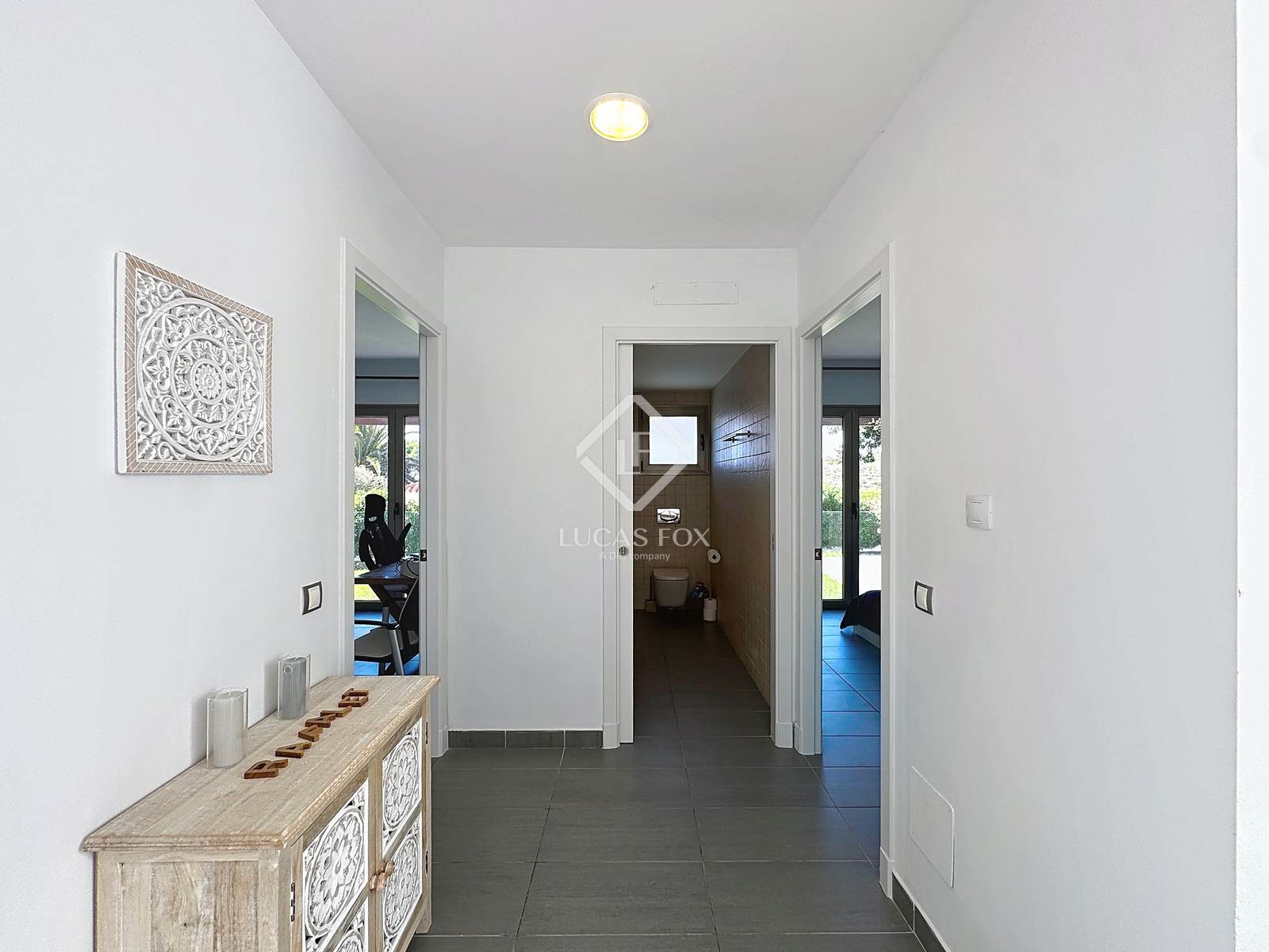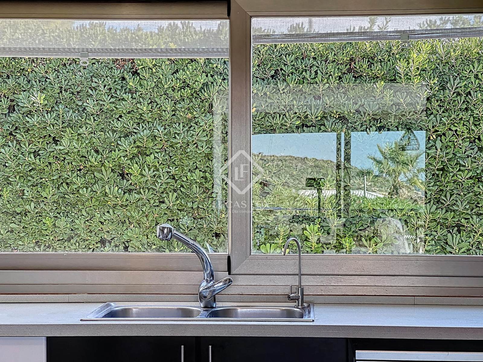 En el exterior, se ofrece un cuidado jardín con riego automático que rodea la vivienda, junto con una piscina privada. La terraza principal ofrece vistas al mar y a la isla de Mallorca en el horizonte.