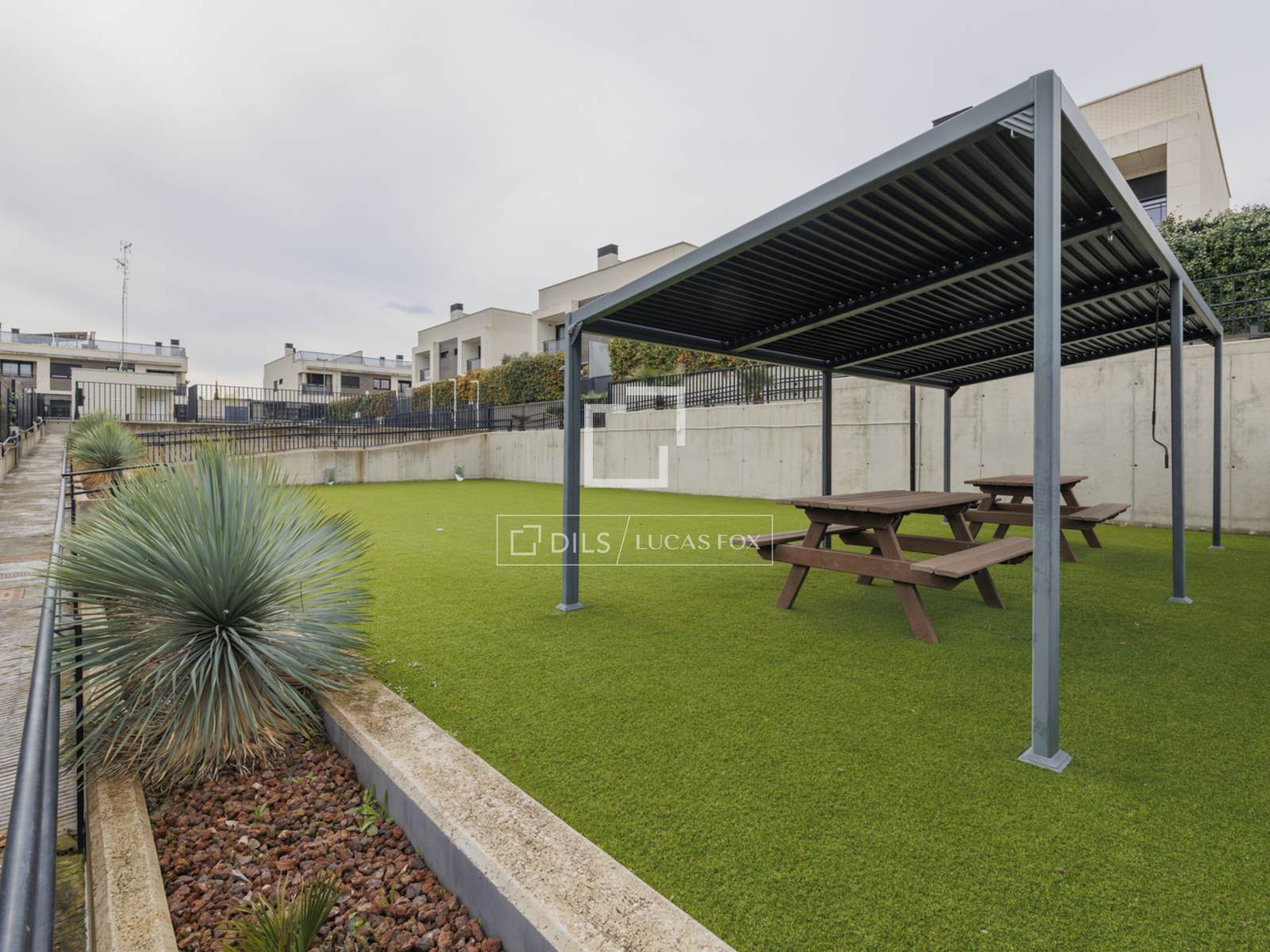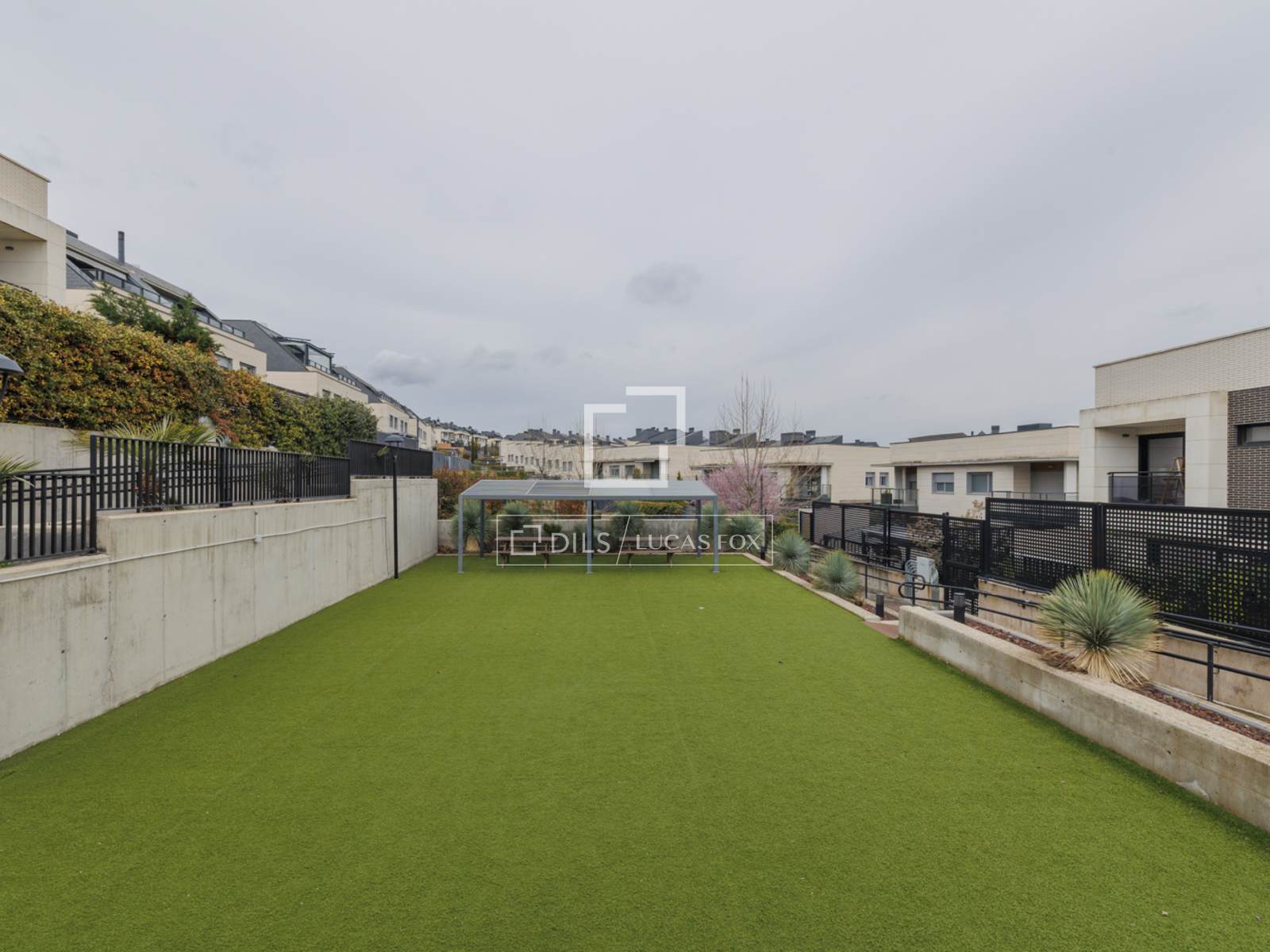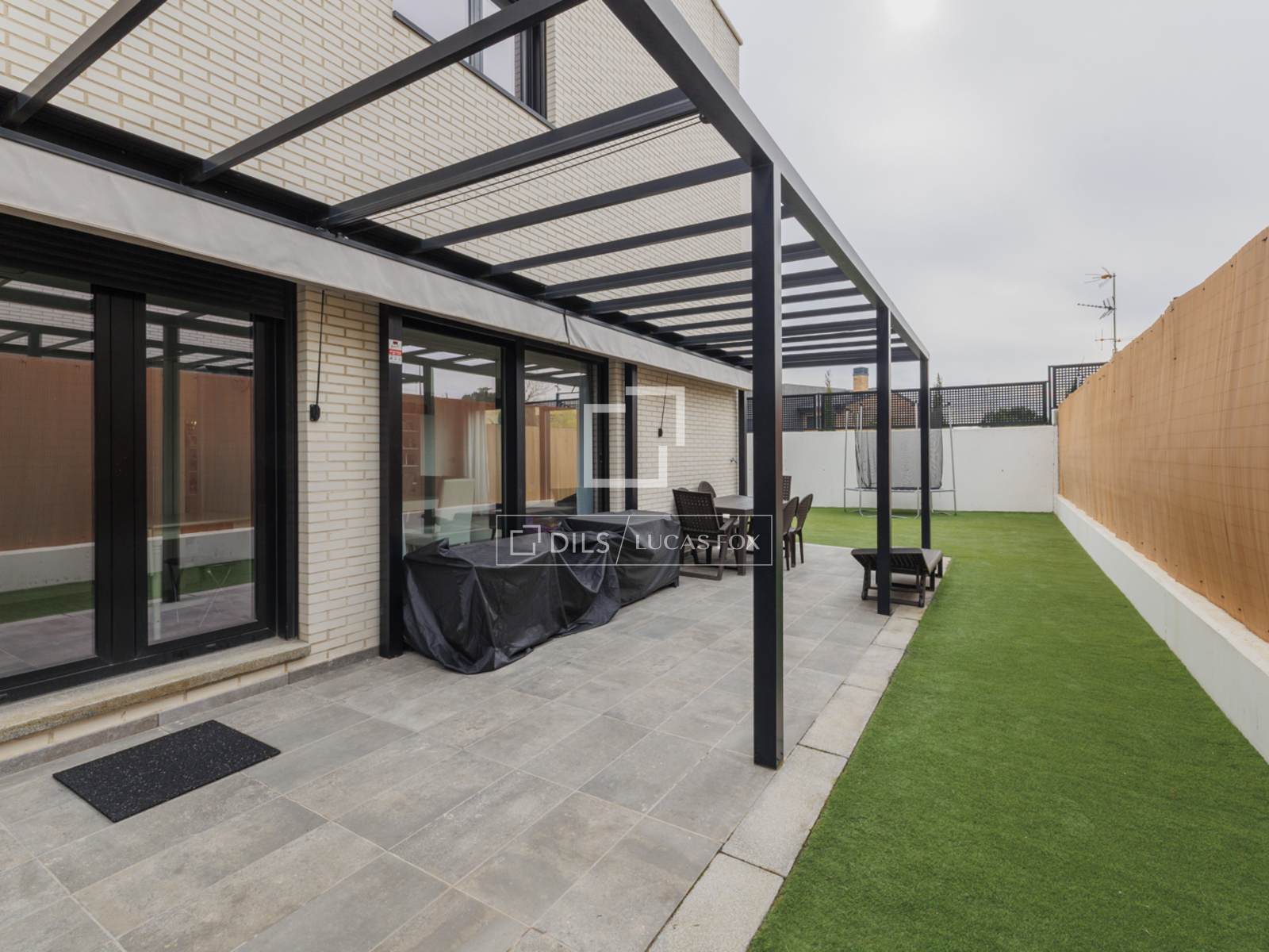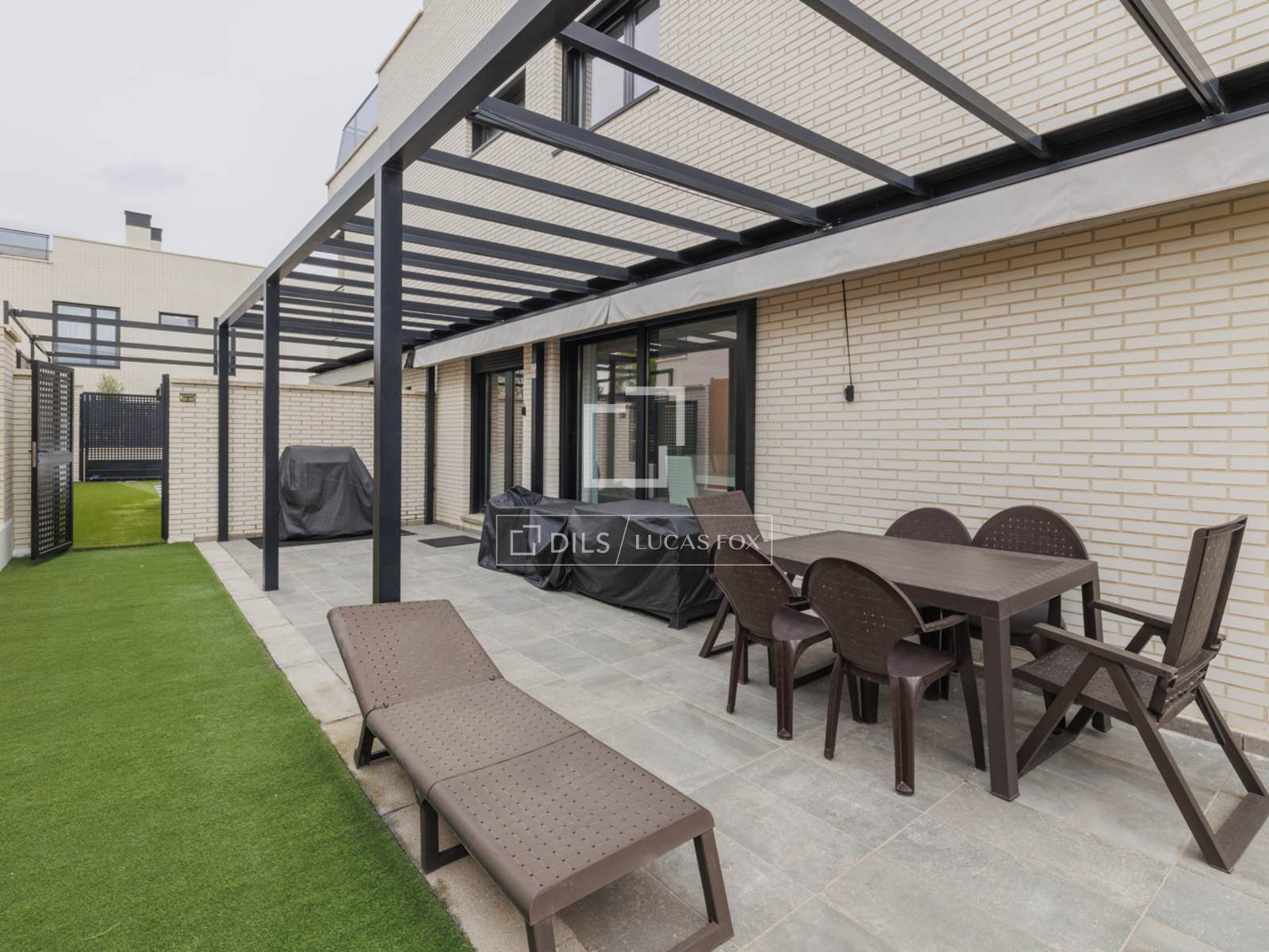 Al acceder a la vivienda, nos encontramos con una acogedora zona de jardín de 127 metros ideal para disfrutar al aire libre. A continuación, al acceder a la vivienda, nos recibe un hall para la distribucion de la planta. A la izquierda tenemos un baño completo que da servicio a la habitacion que se encuentra en esta planta, ideal para habitacion de invitados o despacho. A continuacion nos encontramos la cocina totalmente equipada con muebles de diseño y electrodomésticos de calidad. Está bien pensada para su uso cotidiano ya que tiene una zona de office y acceso al porche y jardin. En esta misma planta tenemos un ampliosalon de 42 metros, con grandes ventanales y con acceso a la zona de jardín y al porche. El porche cuenta con una pérgola y un toldo, perfectos para disfrutar del espacio al aire libre sin importar las condiciones climáticas. Todo el jardín está cubierto de césped artificial, que resulta más limpio y fácil de mantener.
