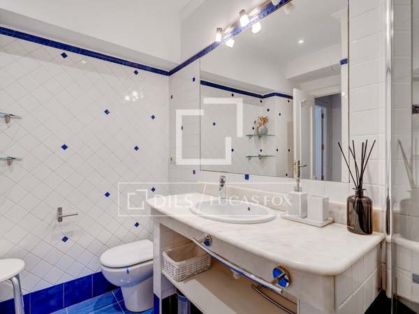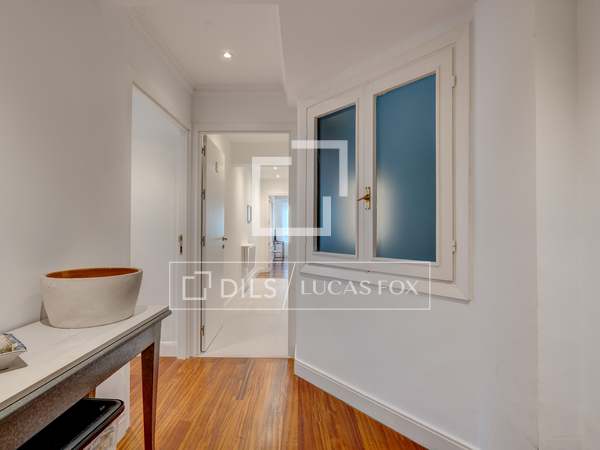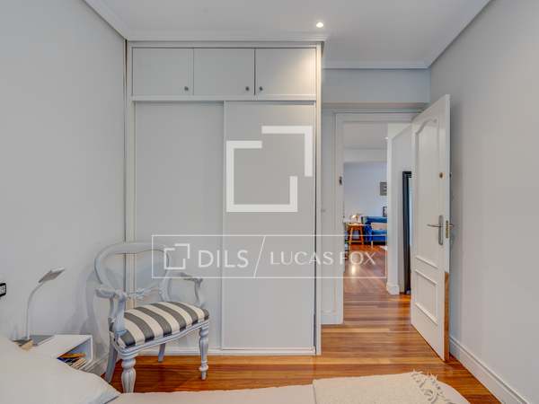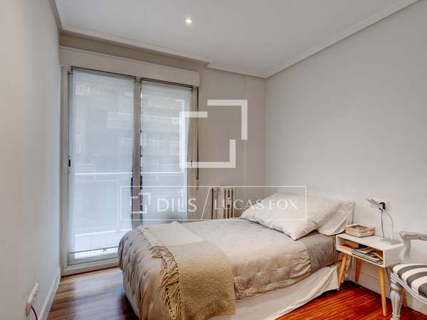 La vivienda es muy luminosa al tener dos balcones a la plaza de Bilbao y además un amplio mirador hacia la calle Alfonso VIII - calle peatonal con tranquilas terrazas- que comunica a la plaza con la Catedral del Buen Pastor. El piso tiene una superficie de 110 m2 construidos y 83 m2 útiles, distribuidos en un amplio salón-comedor, con salida a dos balcones con vistas frontales a la fuente de la plaza de Bilbao y dos dormitorios dobles, con armarios empotrados. El dormitorio principal dispone de un baño en suite y un mirador con vistas a la calle Alfonso VIII. En el pasillo encontramos otro baño completo. Hay posibilidad de un tercer dormitorio de servicio que comunica con una pequeña lavandería que da al patio.