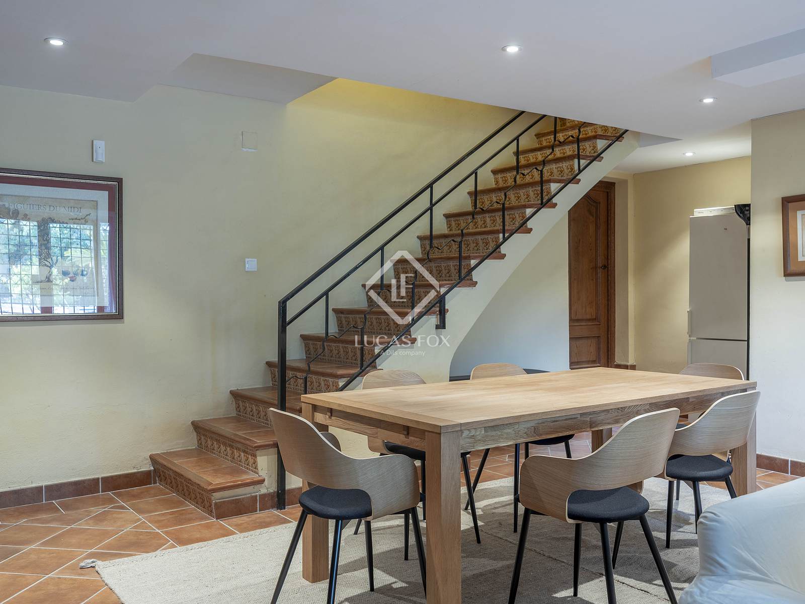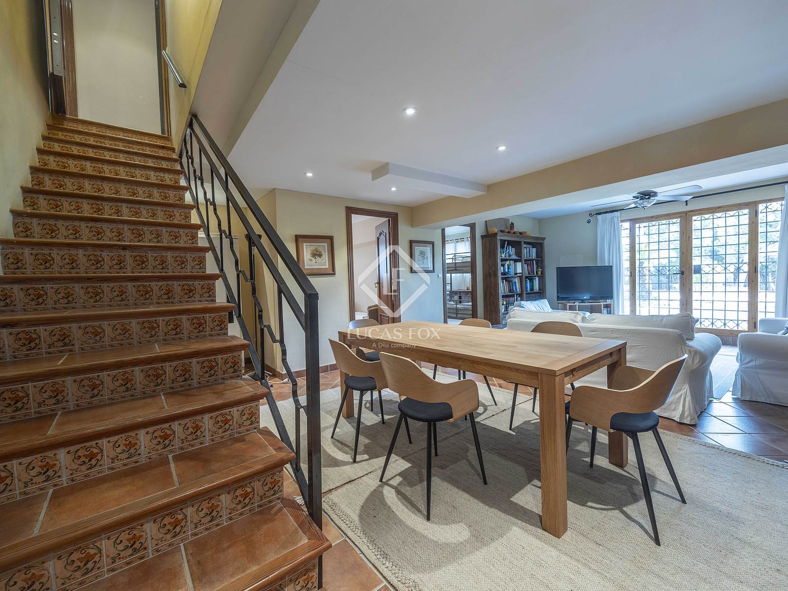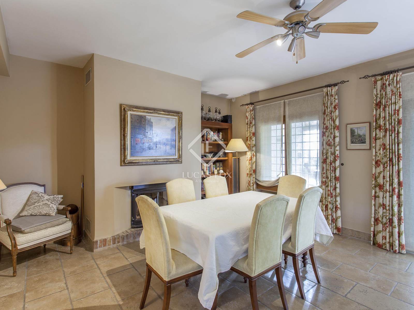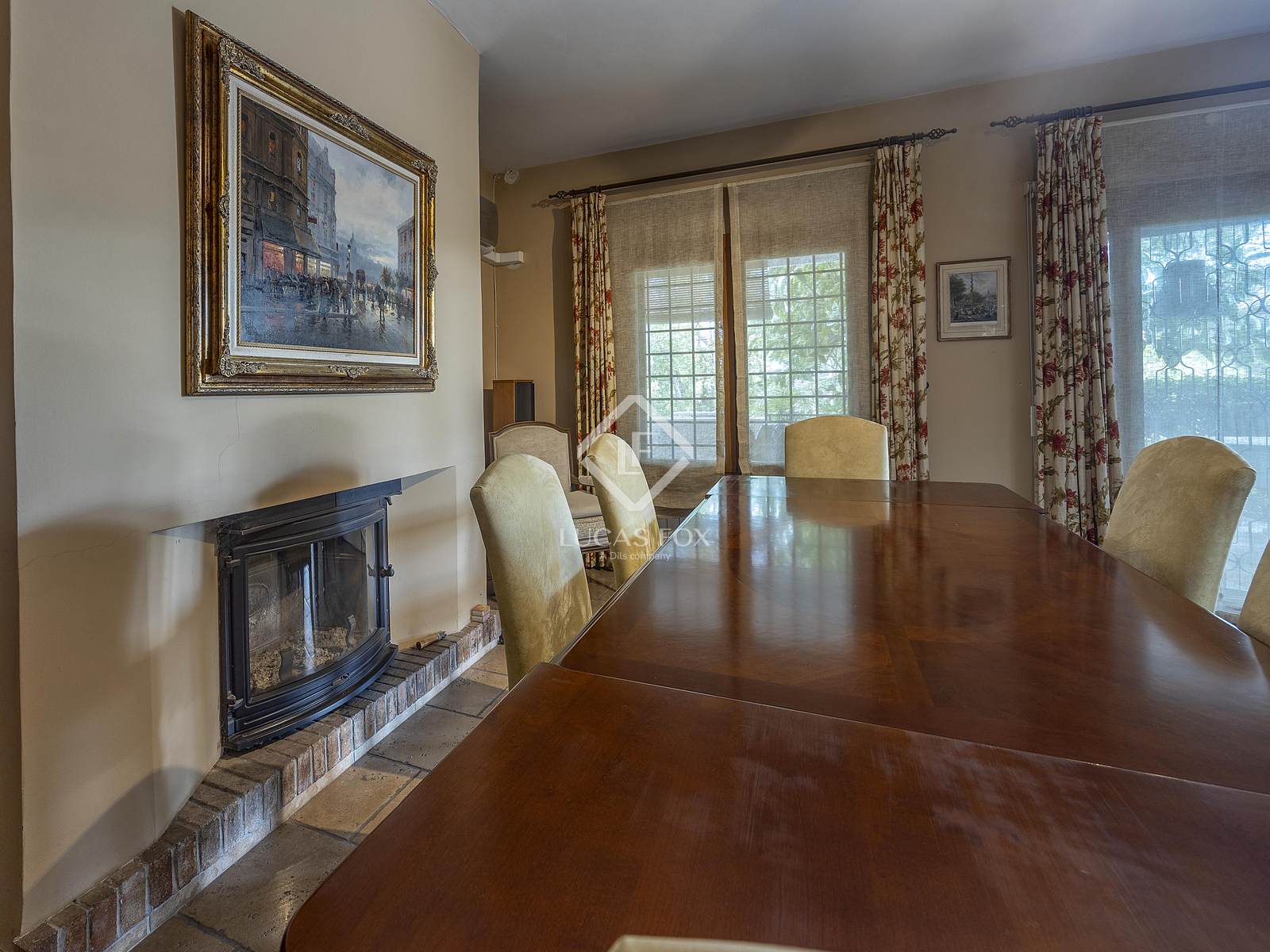 Se accede a la vivienda desde un amplio y majestuoso recibidor. Desde aquí, encontramos un aseo de cortesía, un espacio para oficina y el amplio salón con chimenea y una gran terraza. Las ventanas correderas dan a la terraza y al gran jardín con piscina. En la planta baja también encontramos una cocina totalmente equipada, un trastero y un aseo.