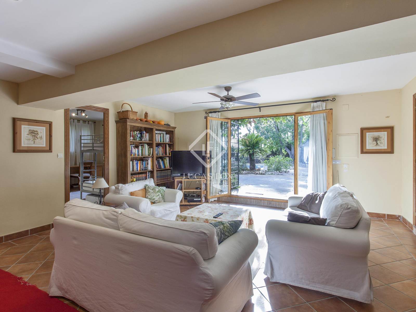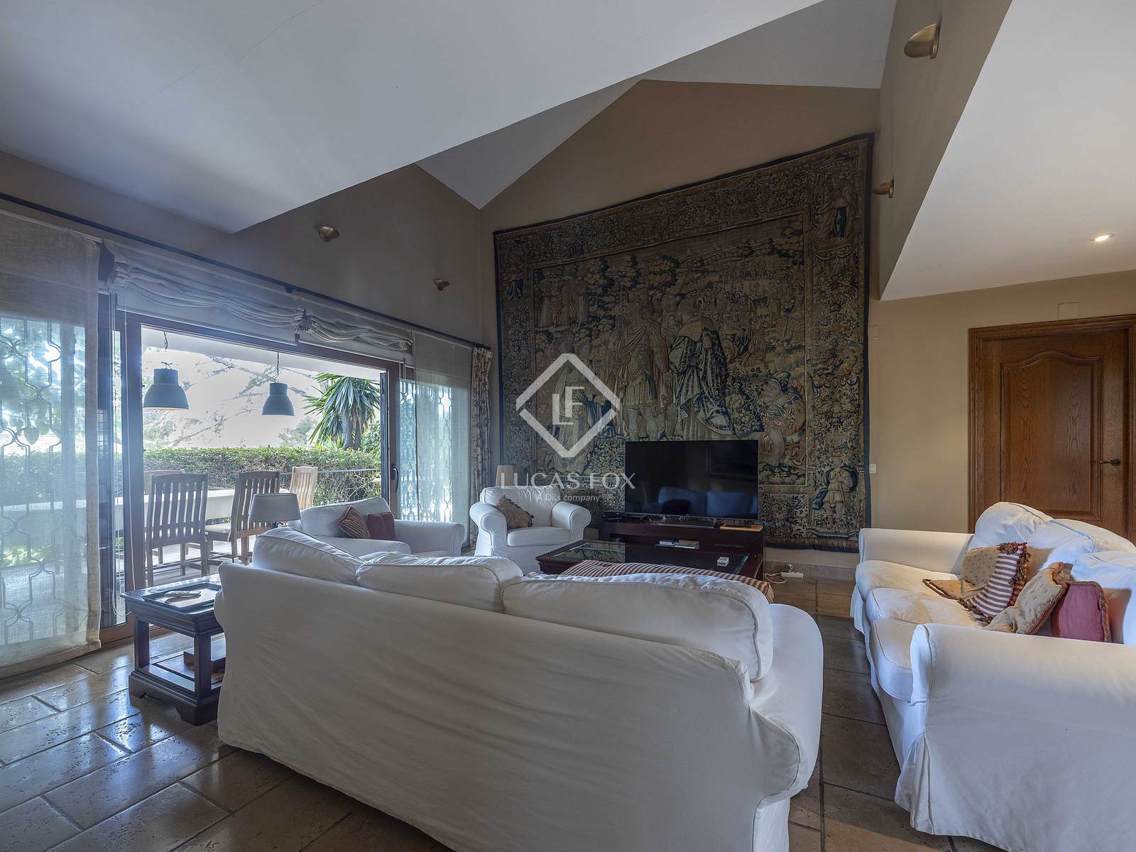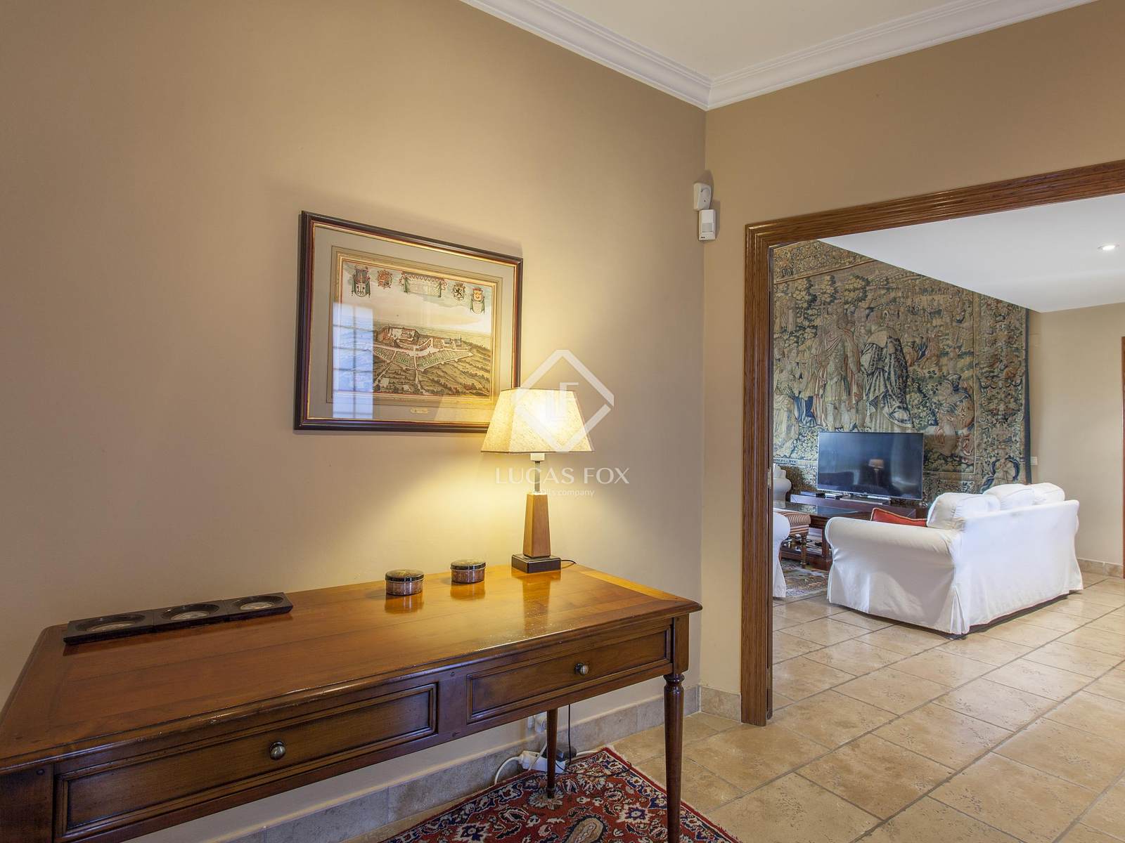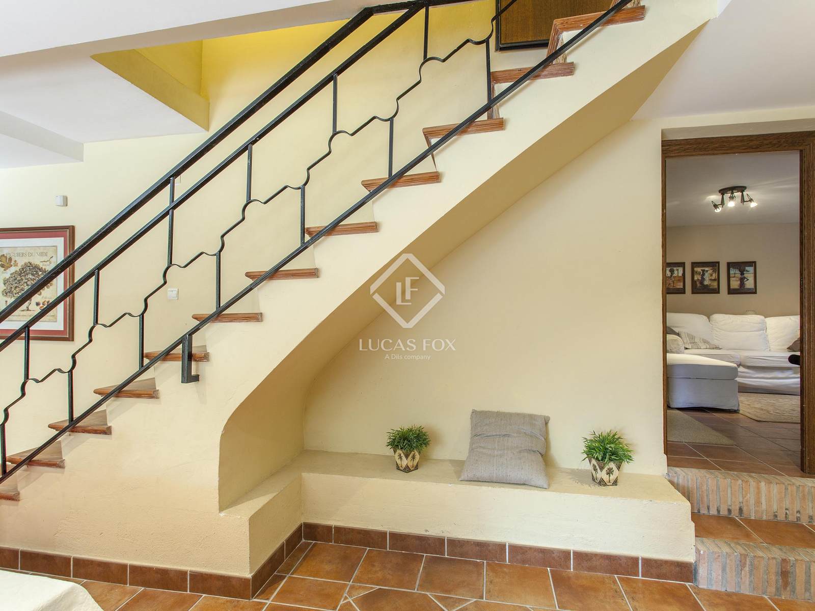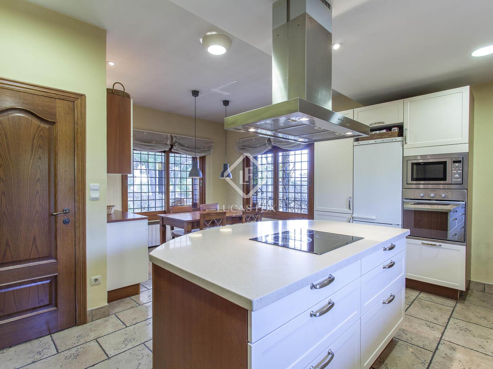 Se accede a la vivienda desde un amplio y majestuoso recibidor. Desde aquí, encontramos un aseo de cortesía, un espacio para oficina y el amplio salón con chimenea y una gran terraza. Las ventanas correderas dan a la terraza y al gran jardín con piscina. En la planta baja también encontramos una cocina totalmente equipada, un trastero y un aseo.