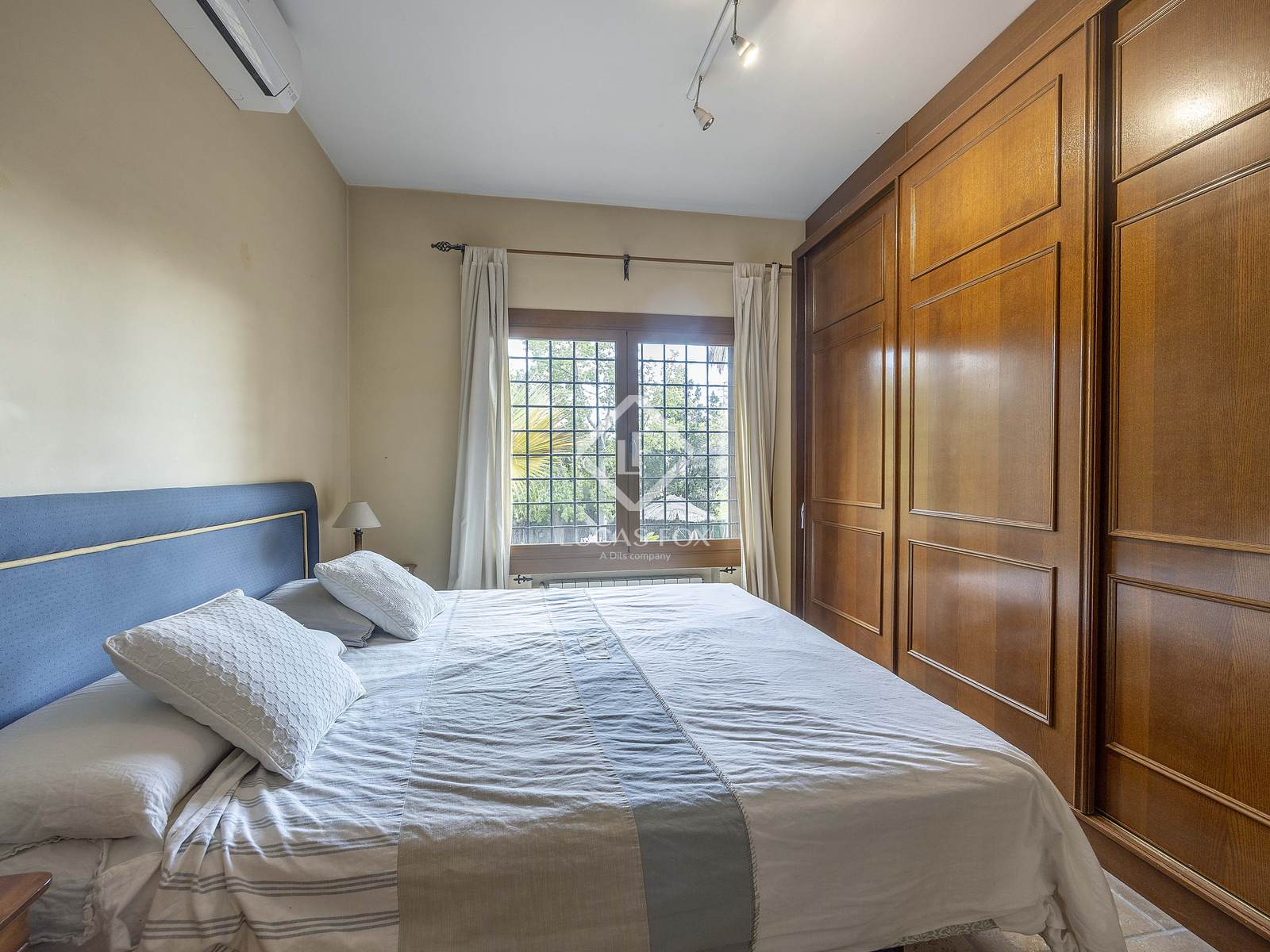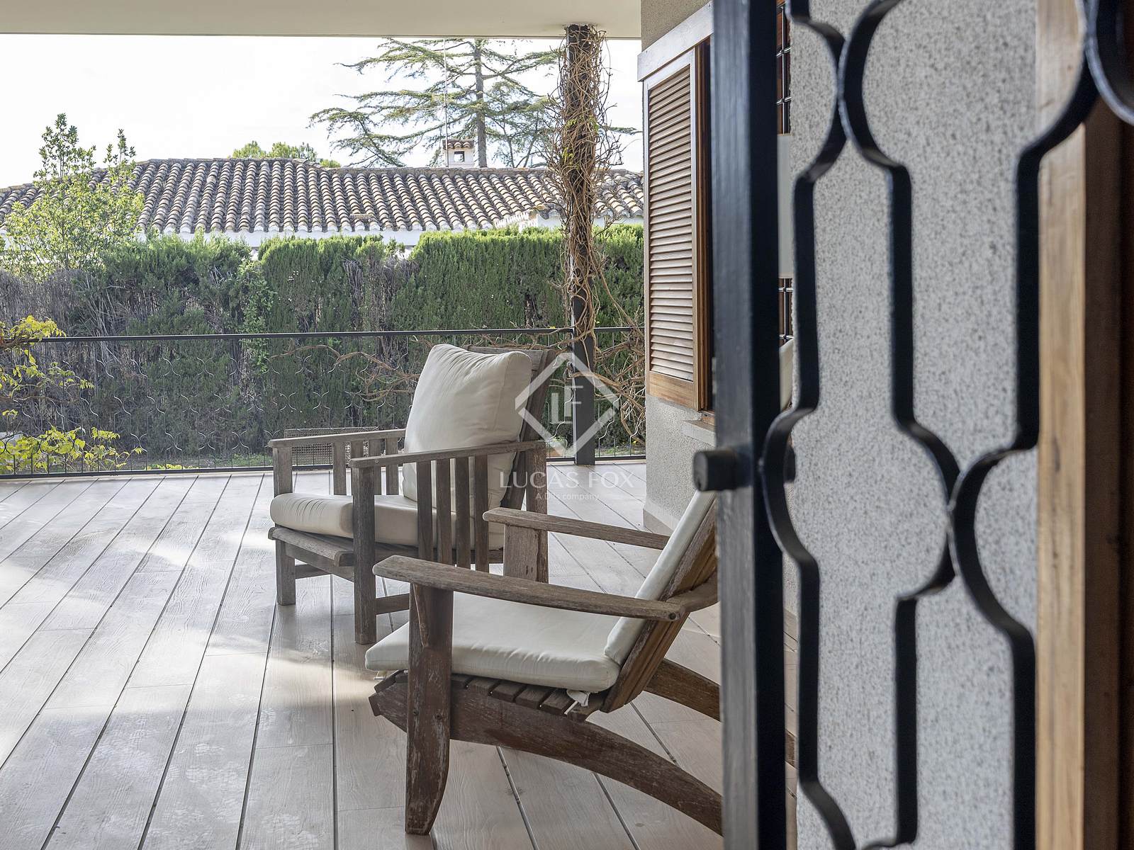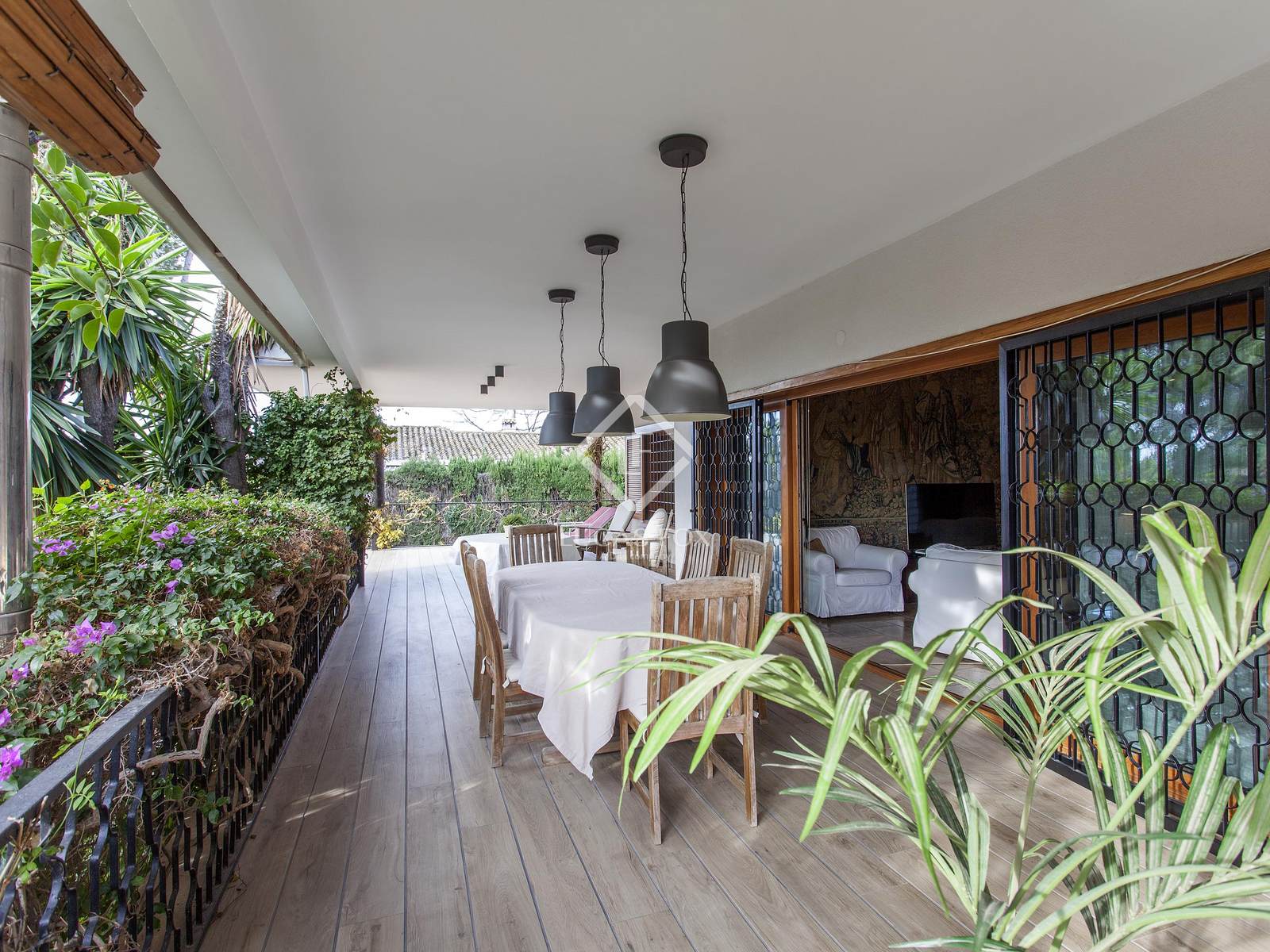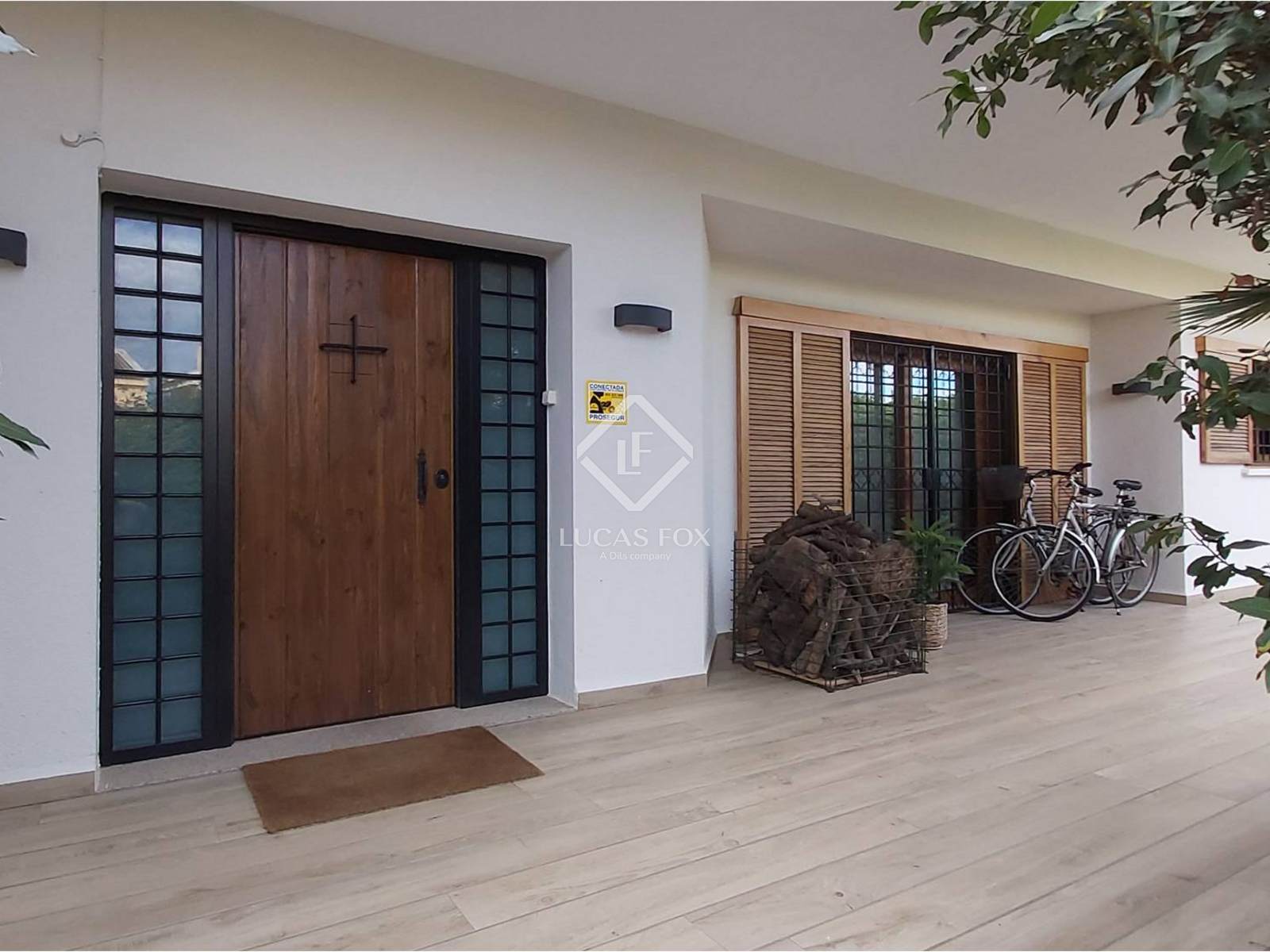 Se accede a la vivienda desde un amplio y majestuoso recibidor. Desde aquí, encontramos un aseo de cortesía, un espacio para oficina y el amplio salón con chimenea y una gran terraza. Las ventanas correderas dan a la terraza y al gran jardín con piscina. En la planta baja también encontramos una cocina totalmente equipada, un trastero y un aseo.