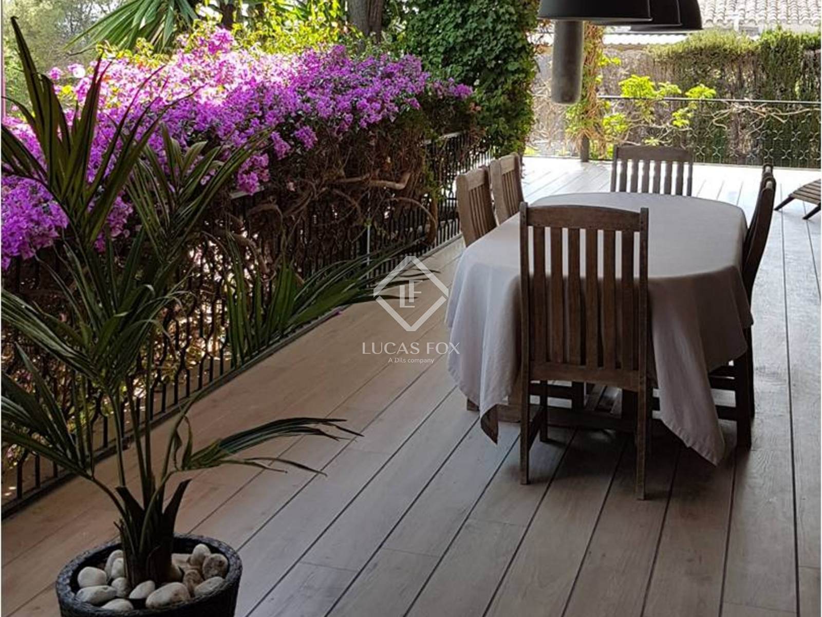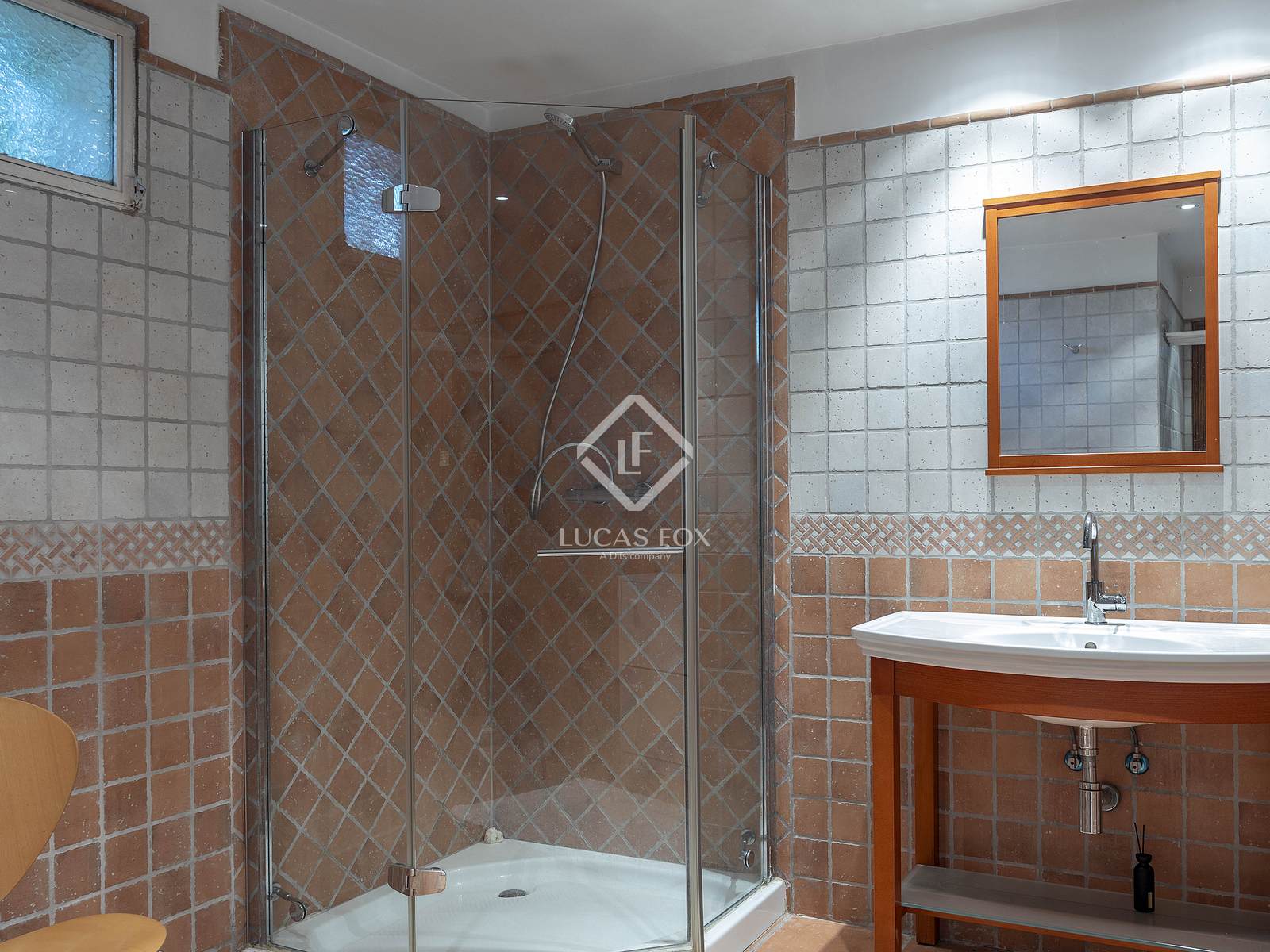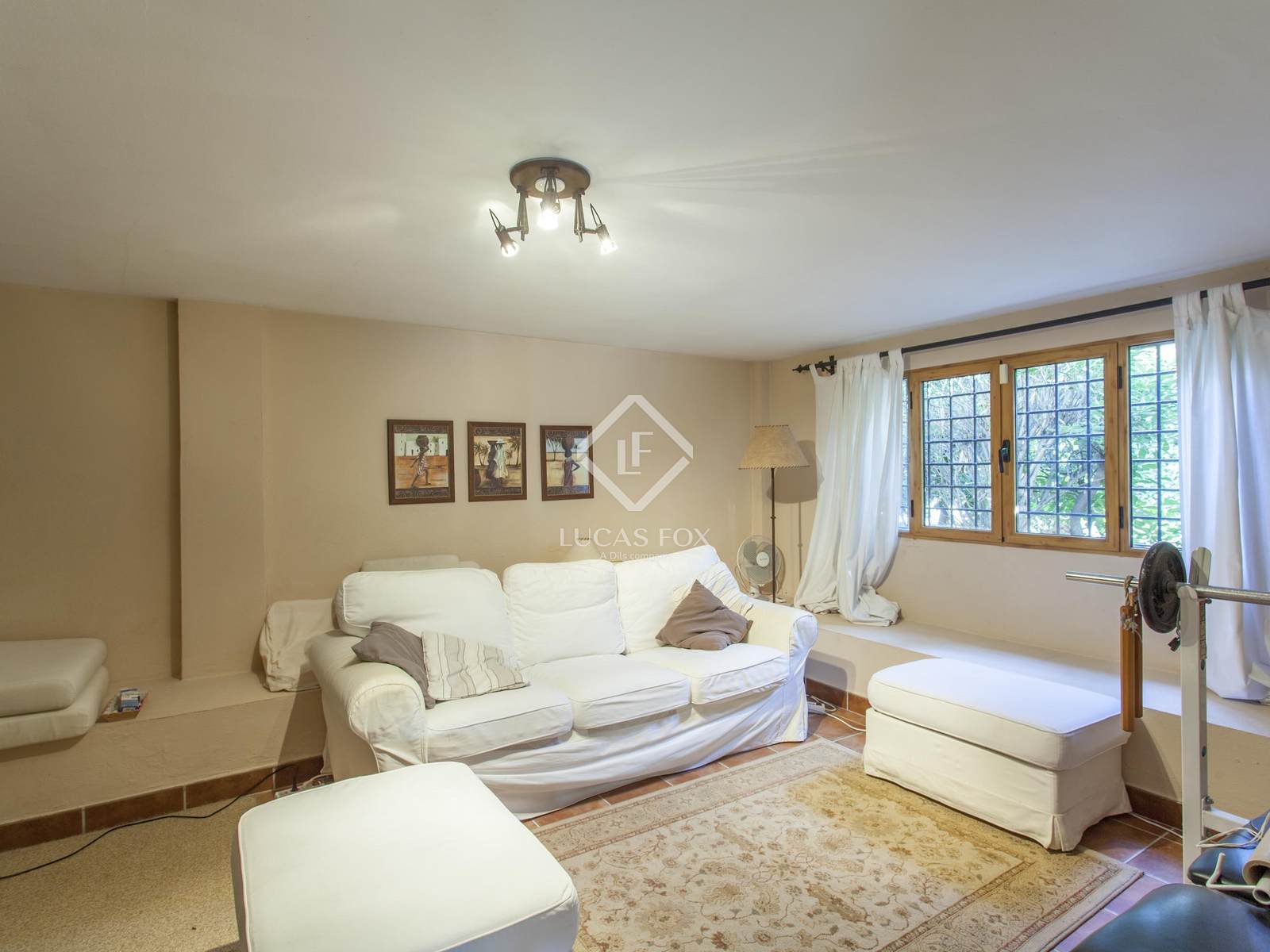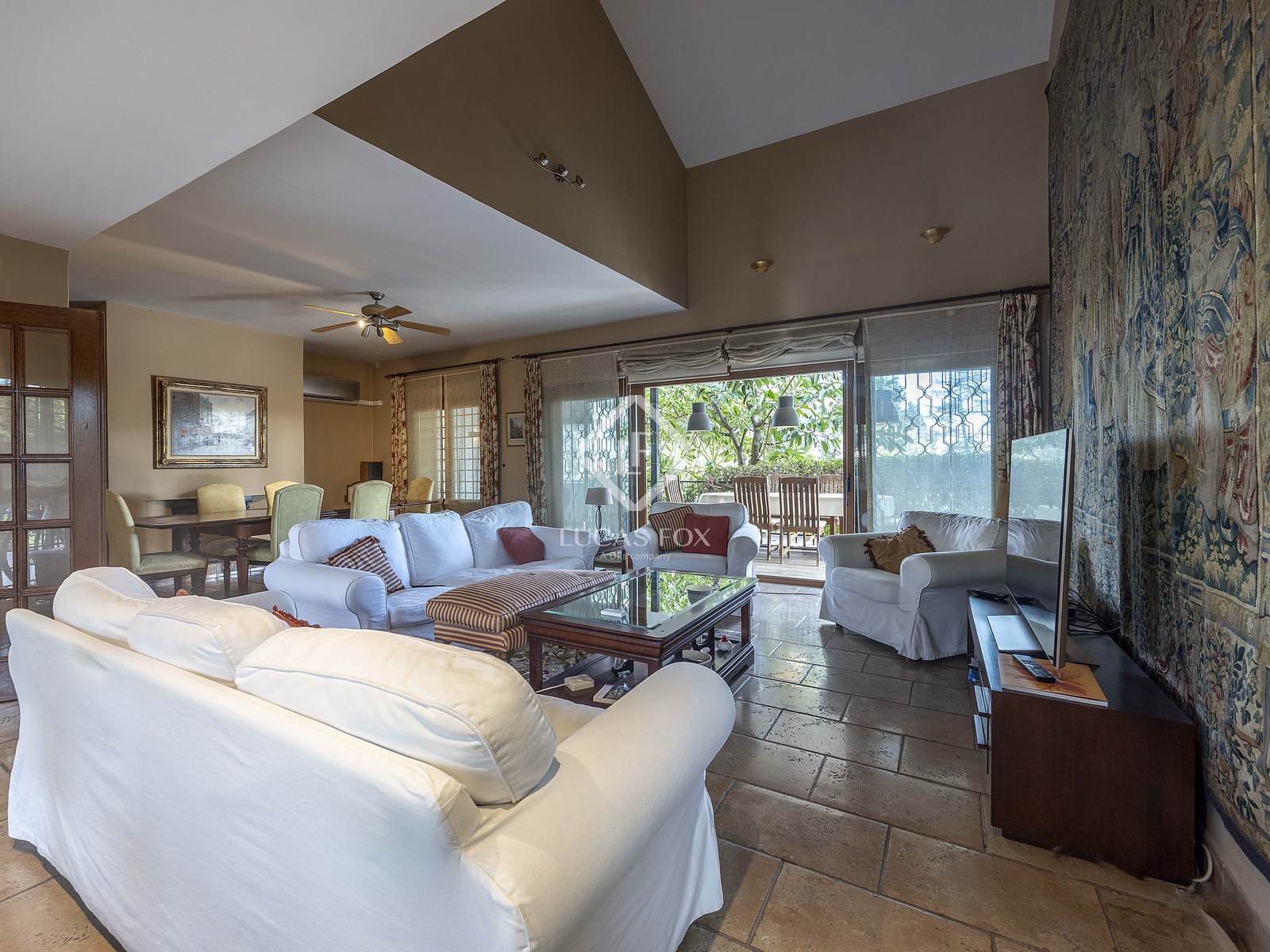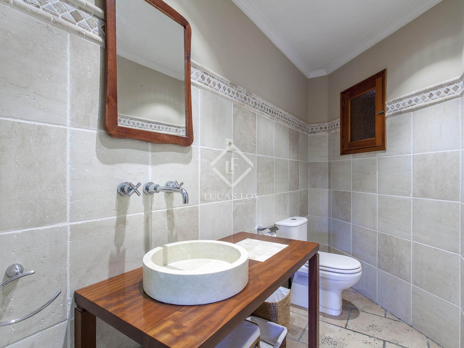 Se accede a la vivienda desde un amplio y majestuoso recibidor. Desde aquí, encontramos un aseo de cortesía, un espacio para oficina y el amplio salón con chimenea y una gran terraza. Las ventanas correderas dan a la terraza y al gran jardín con piscina. En la planta baja también encontramos una cocina totalmente equipada, un trastero y un aseo.