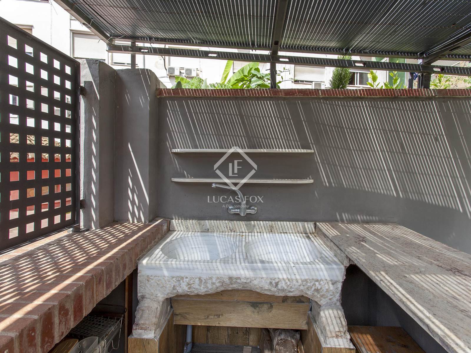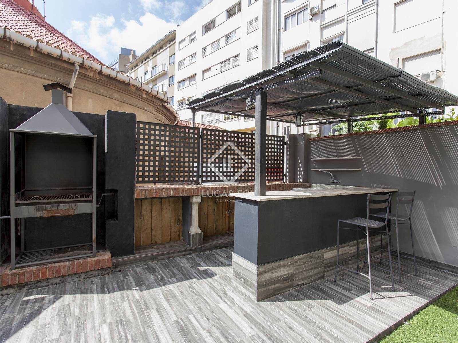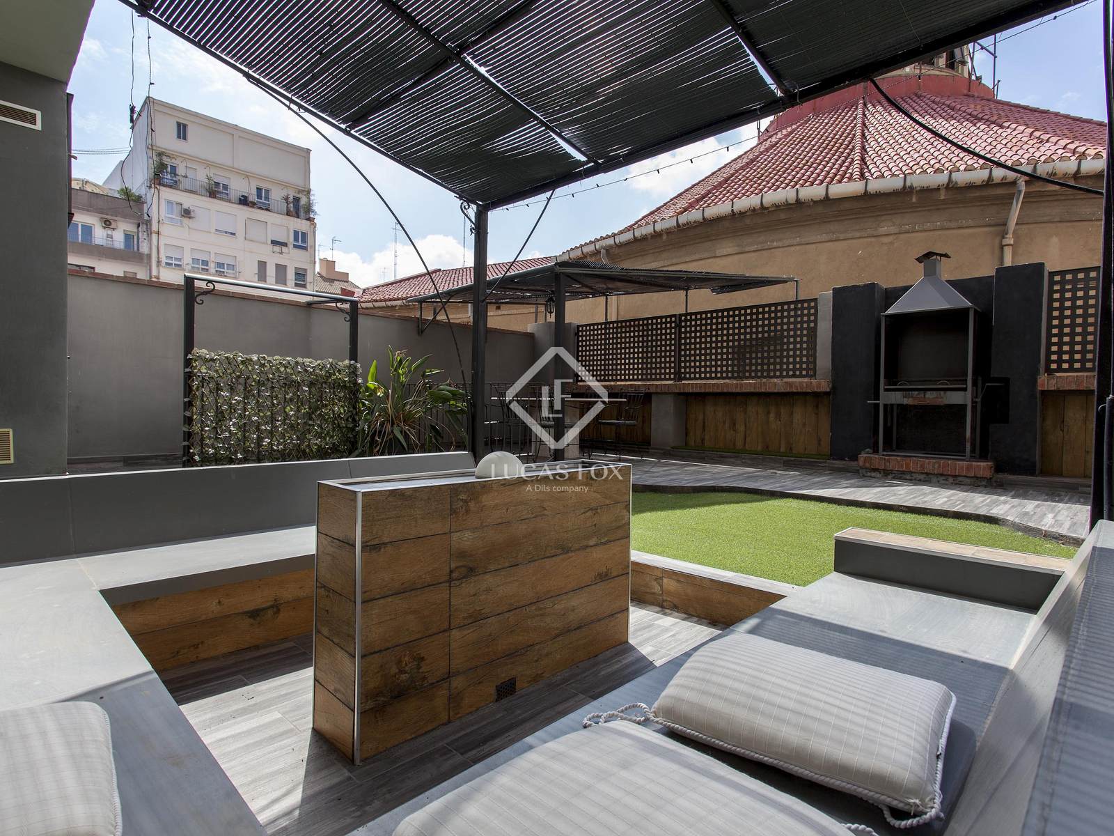 La vivienda destaca por su increíble terraza de 69 m², perfecta para disfrutar al aire libre en el centro de Valencia. Actualmente, dispone de una zona de descanso con amplios sofás, barra de bar con barbacoa, cenador para seis comensales y área de lavadero, con vistas despejadas.